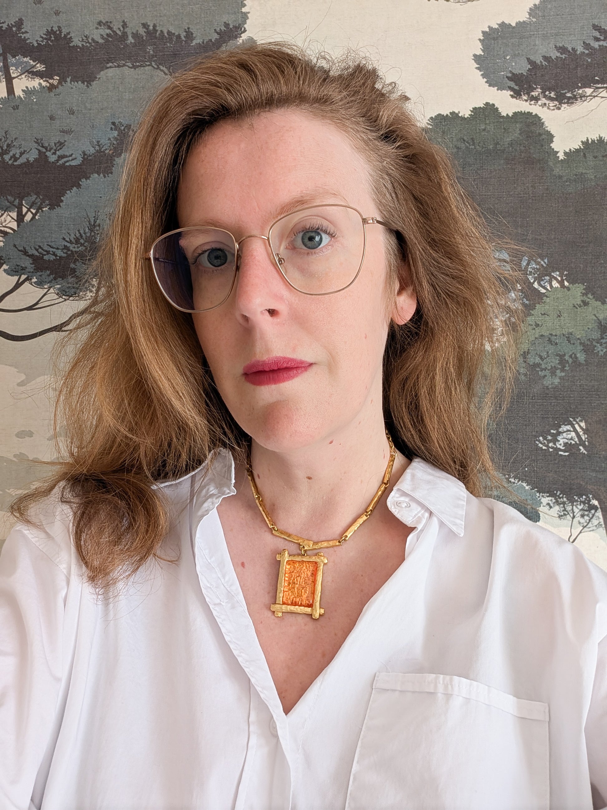 Le pendentif rectangulaire met en valeur un cabochon en résine couleur ambre.