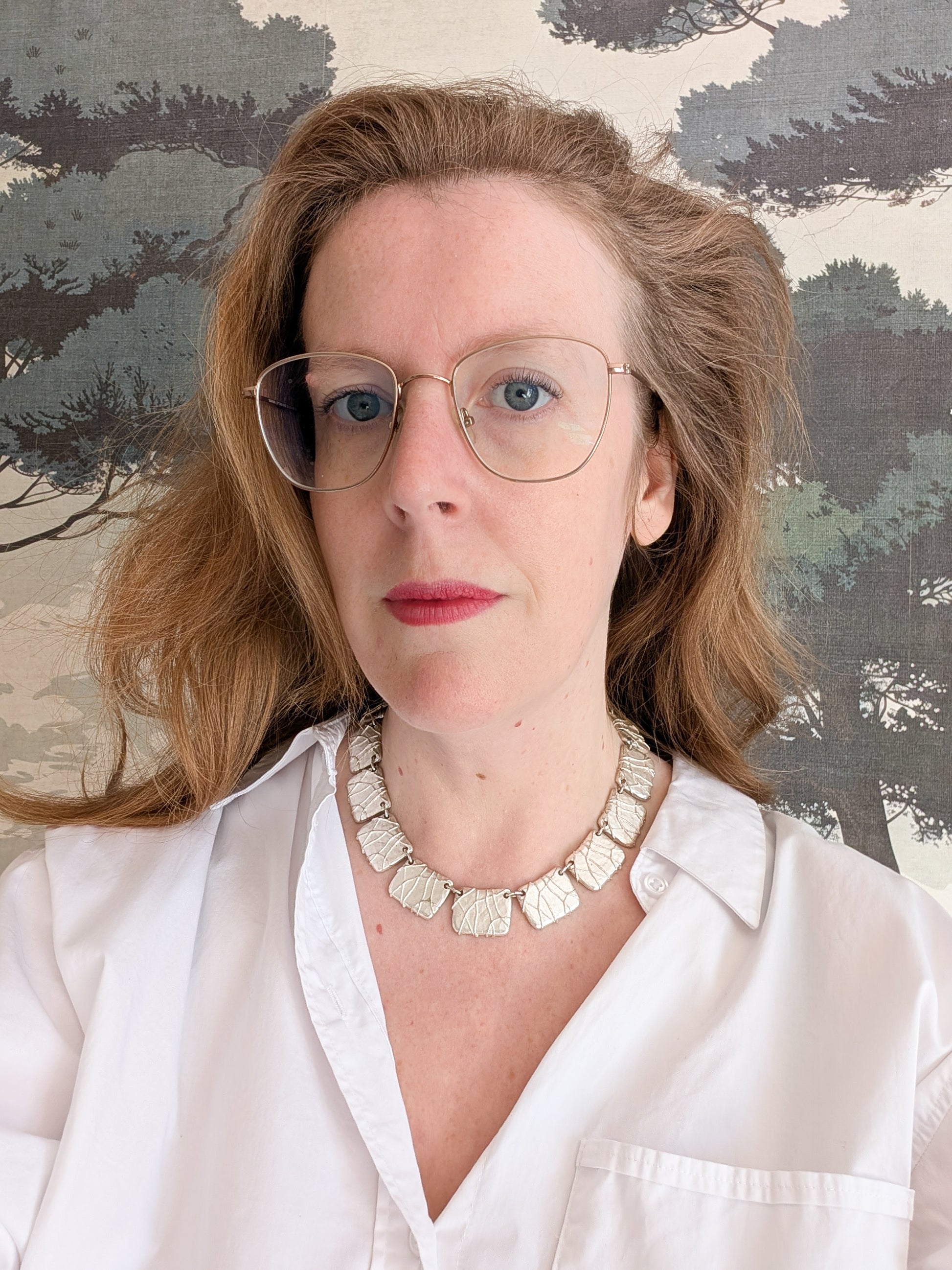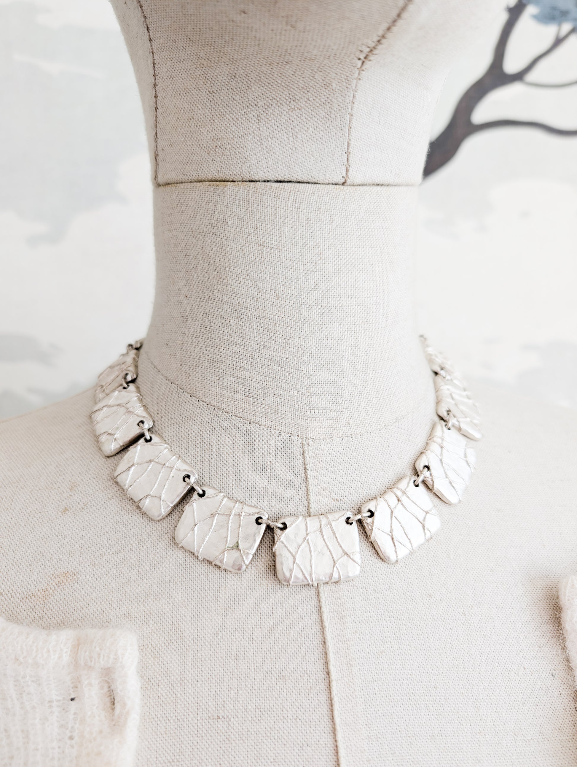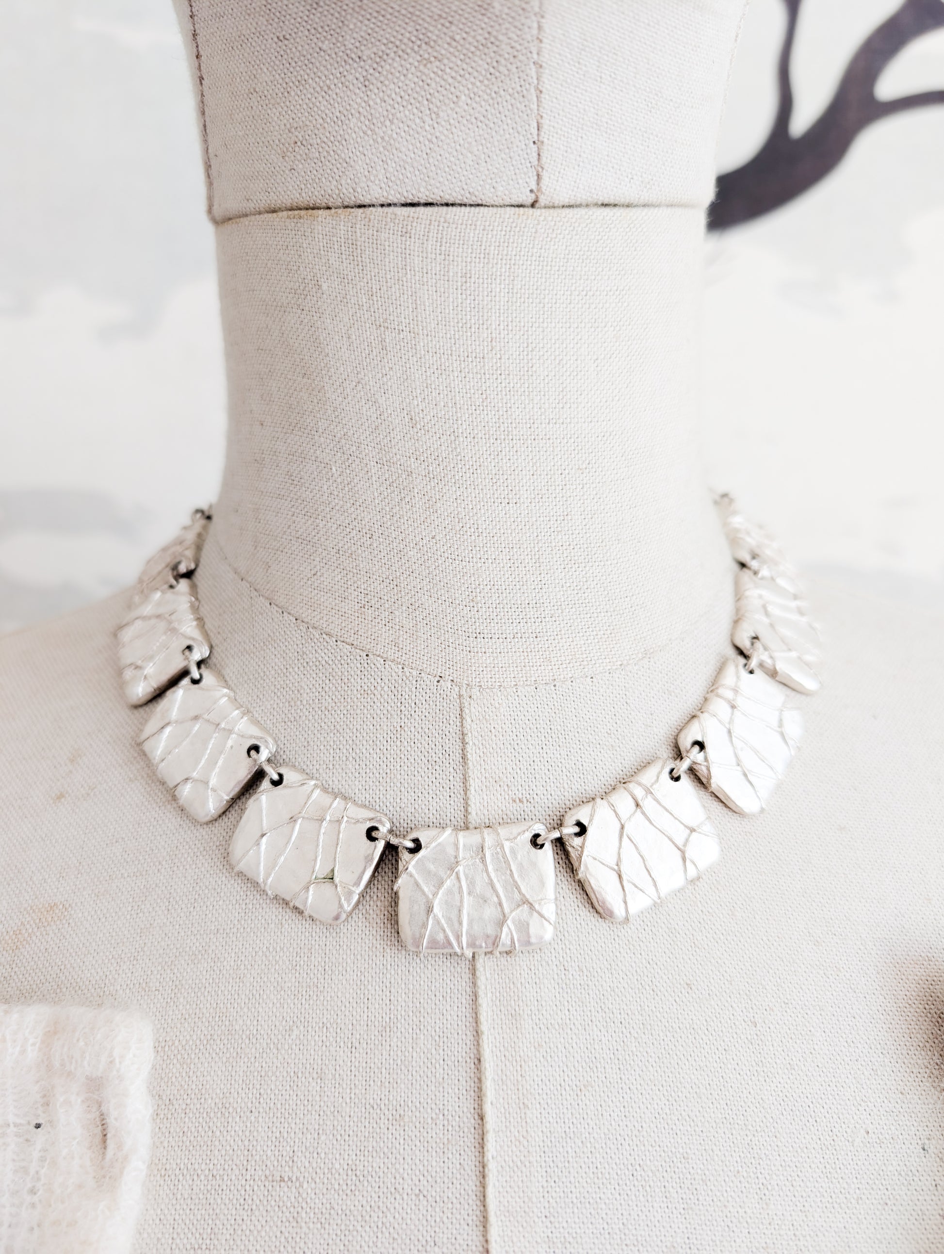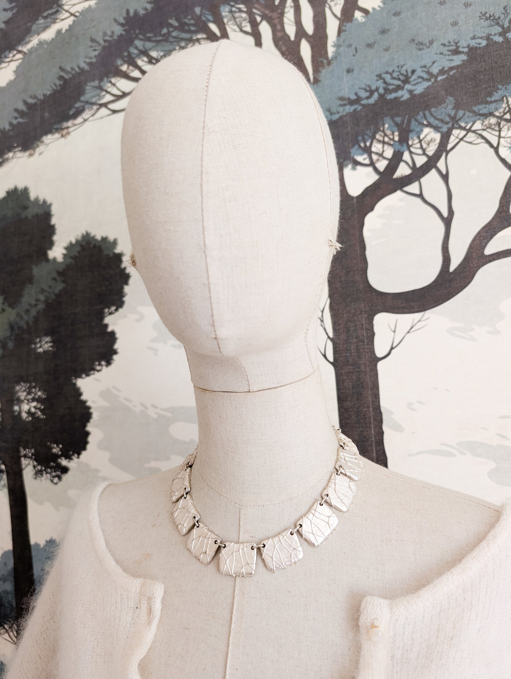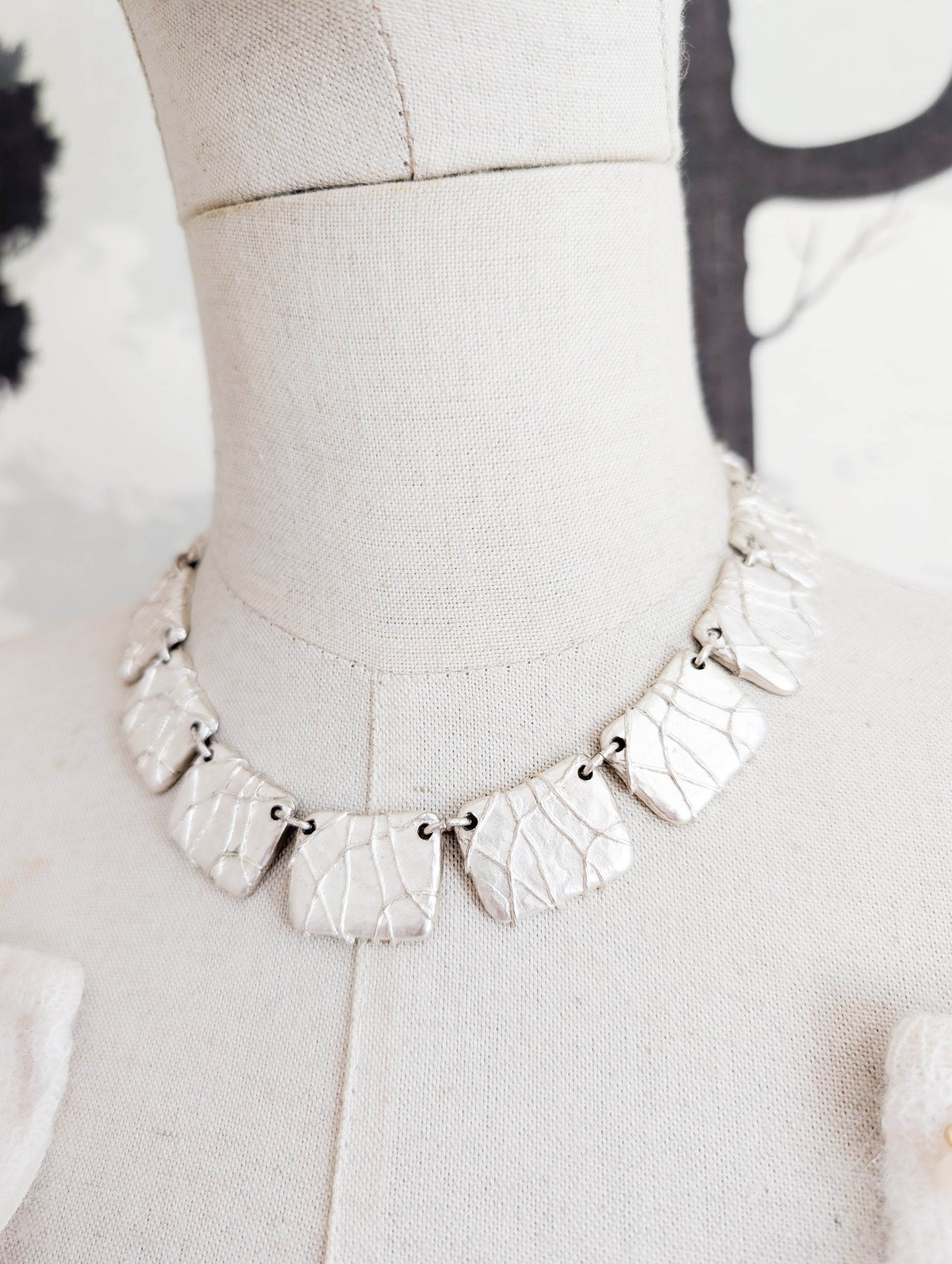 Le collier est en métal argenté. Il présente une succession de plaques rectangulaires au fini texturé et organique.