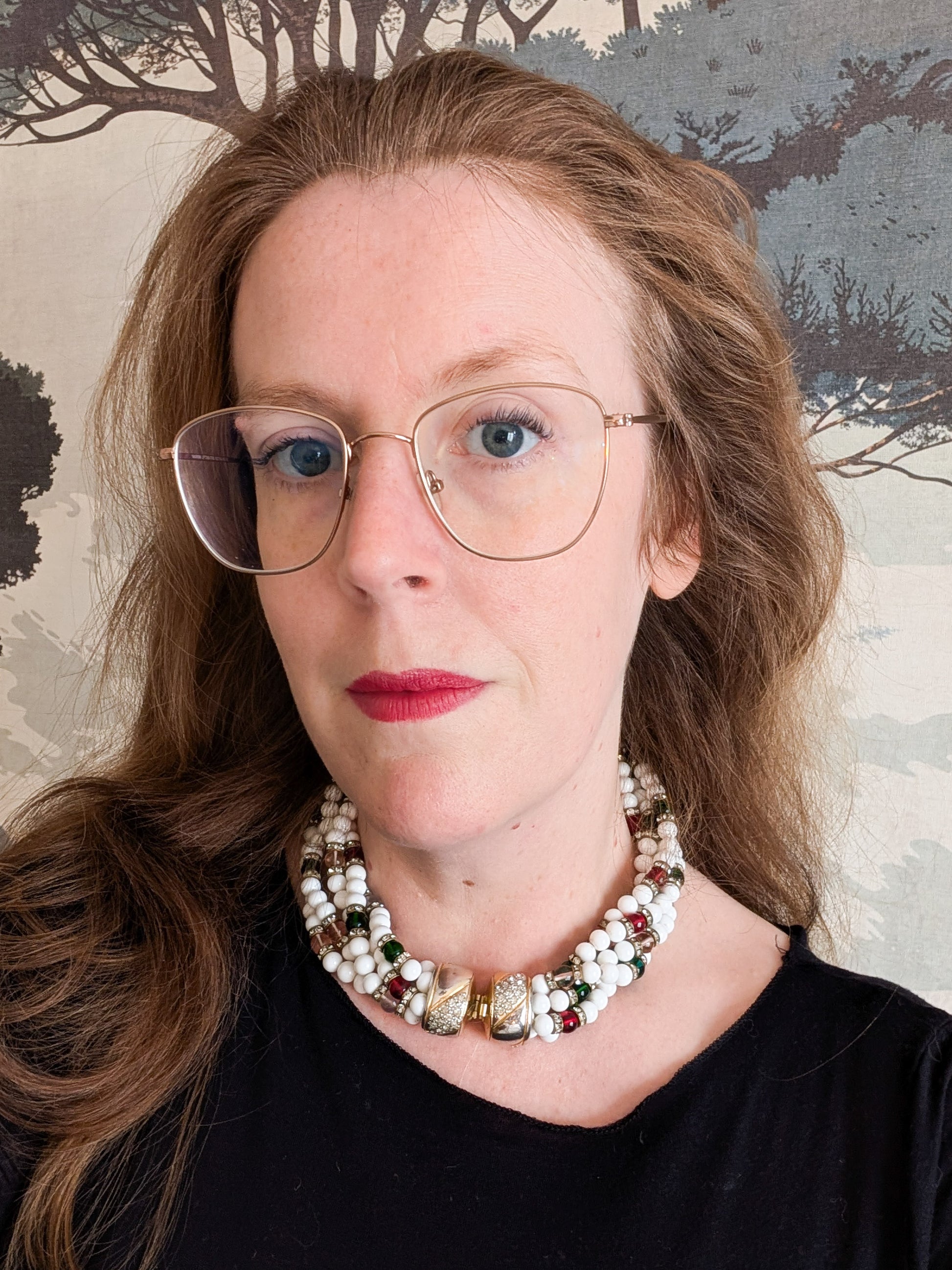 Le collier présente 5 rangs de perles de verre. Alternance de perles opaques en verre blanc et de perles translucides en verre coloré. Les perles de verres sont rehaussées de rondelles de strass en verre blanc.