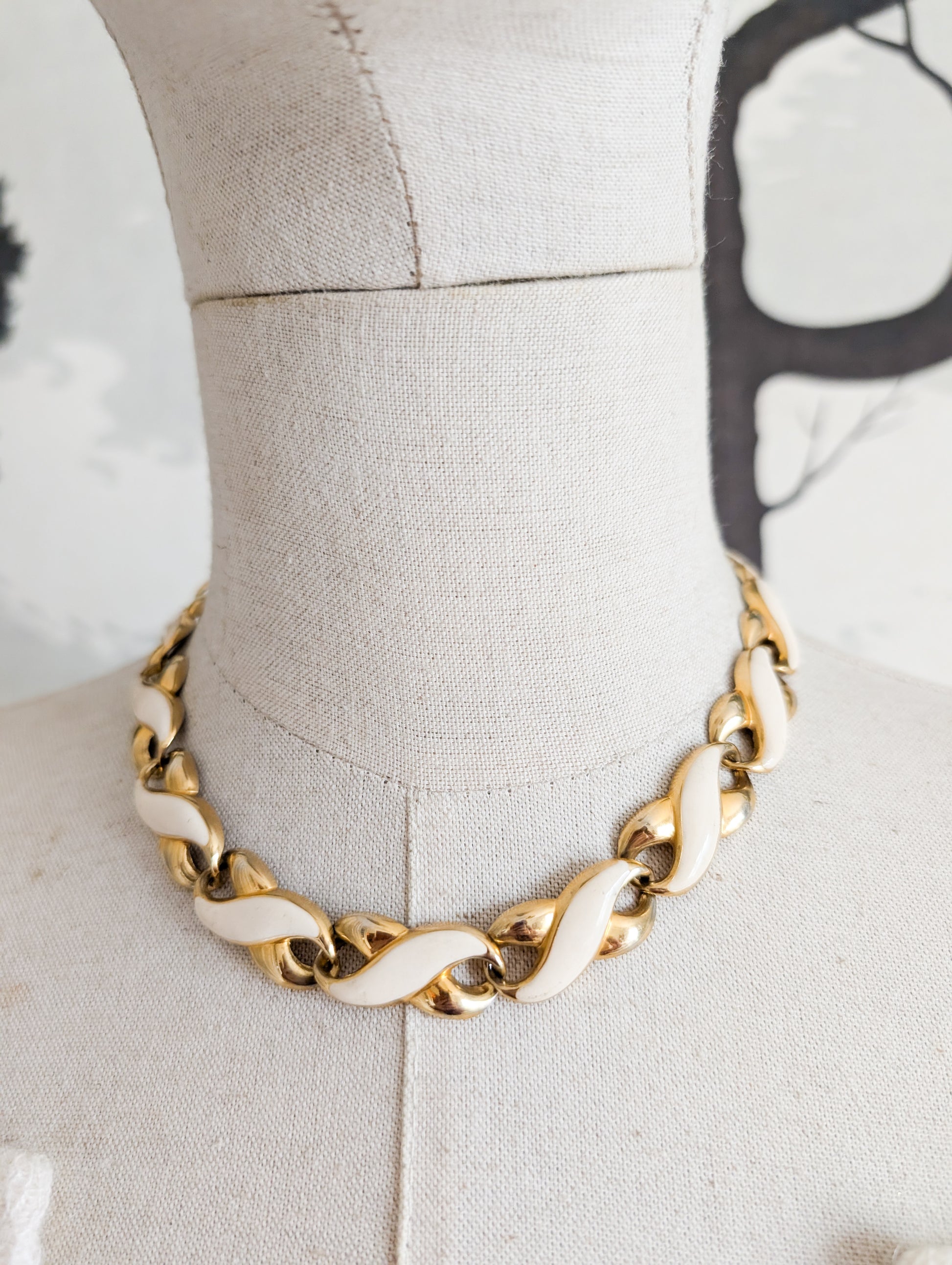Le collier présente une succession de mailles en métal doré. Les mailles sont laquées de crème.