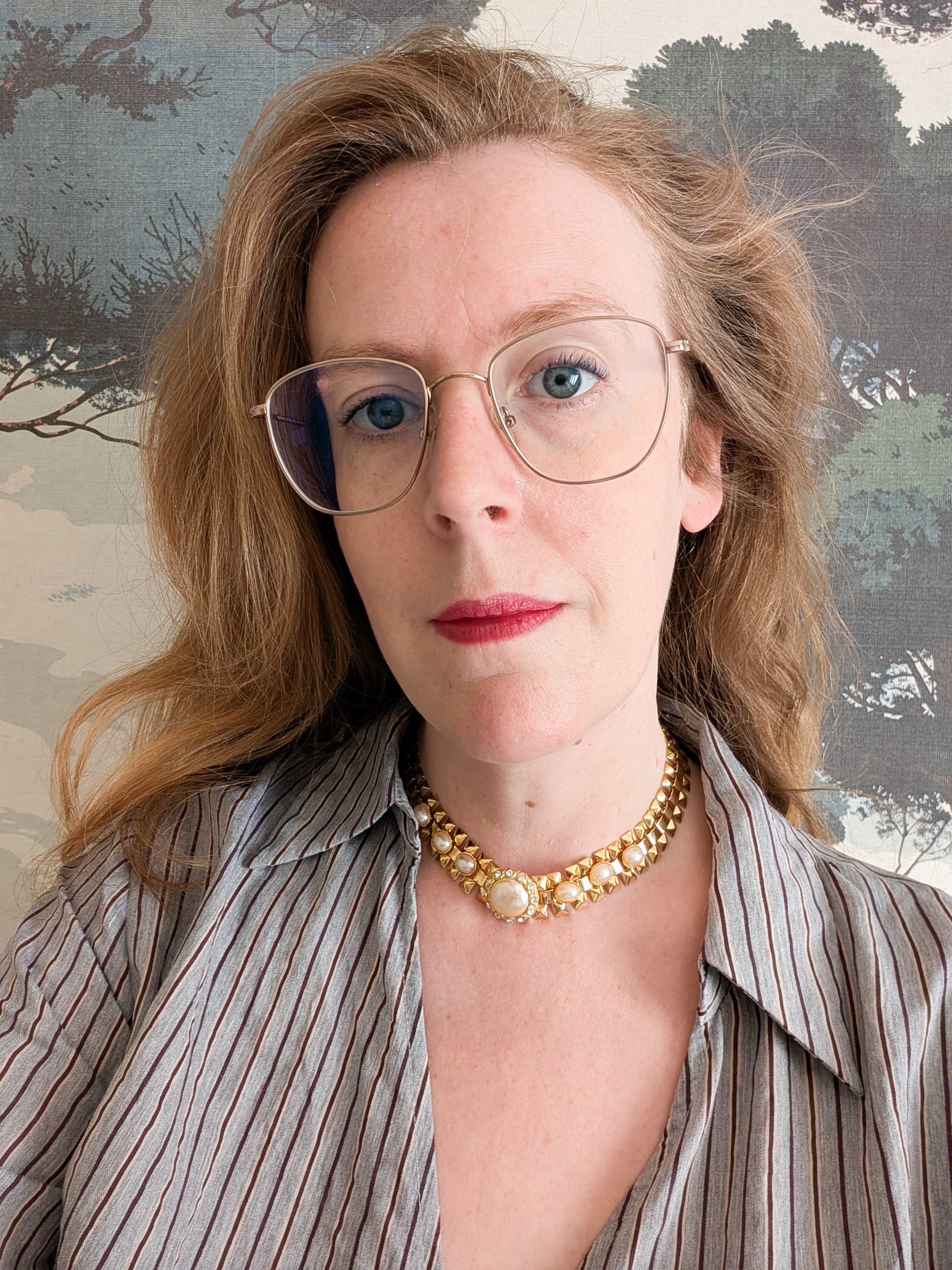 Au centre, une grande perle encadrée de strass en verre blanc.