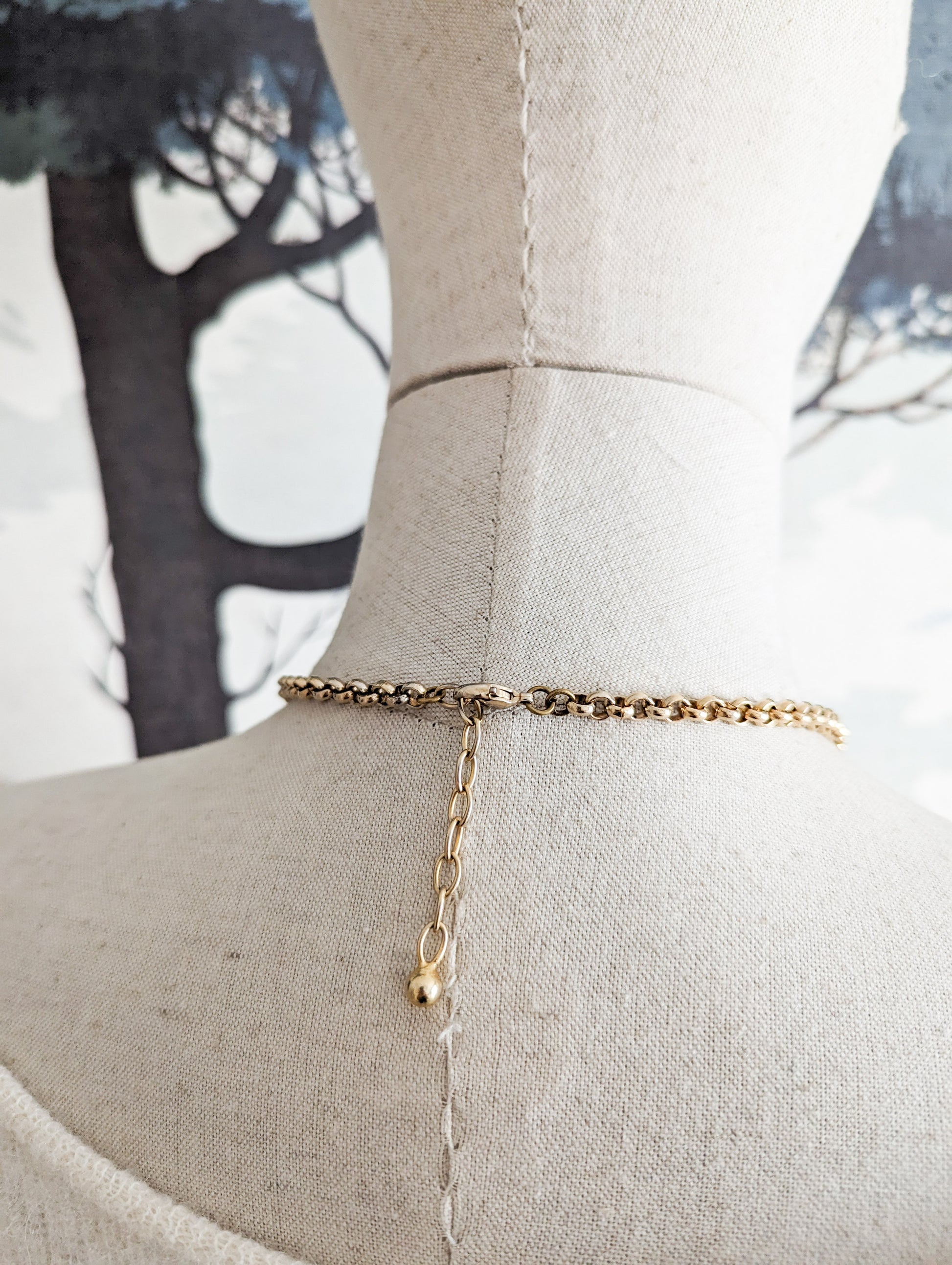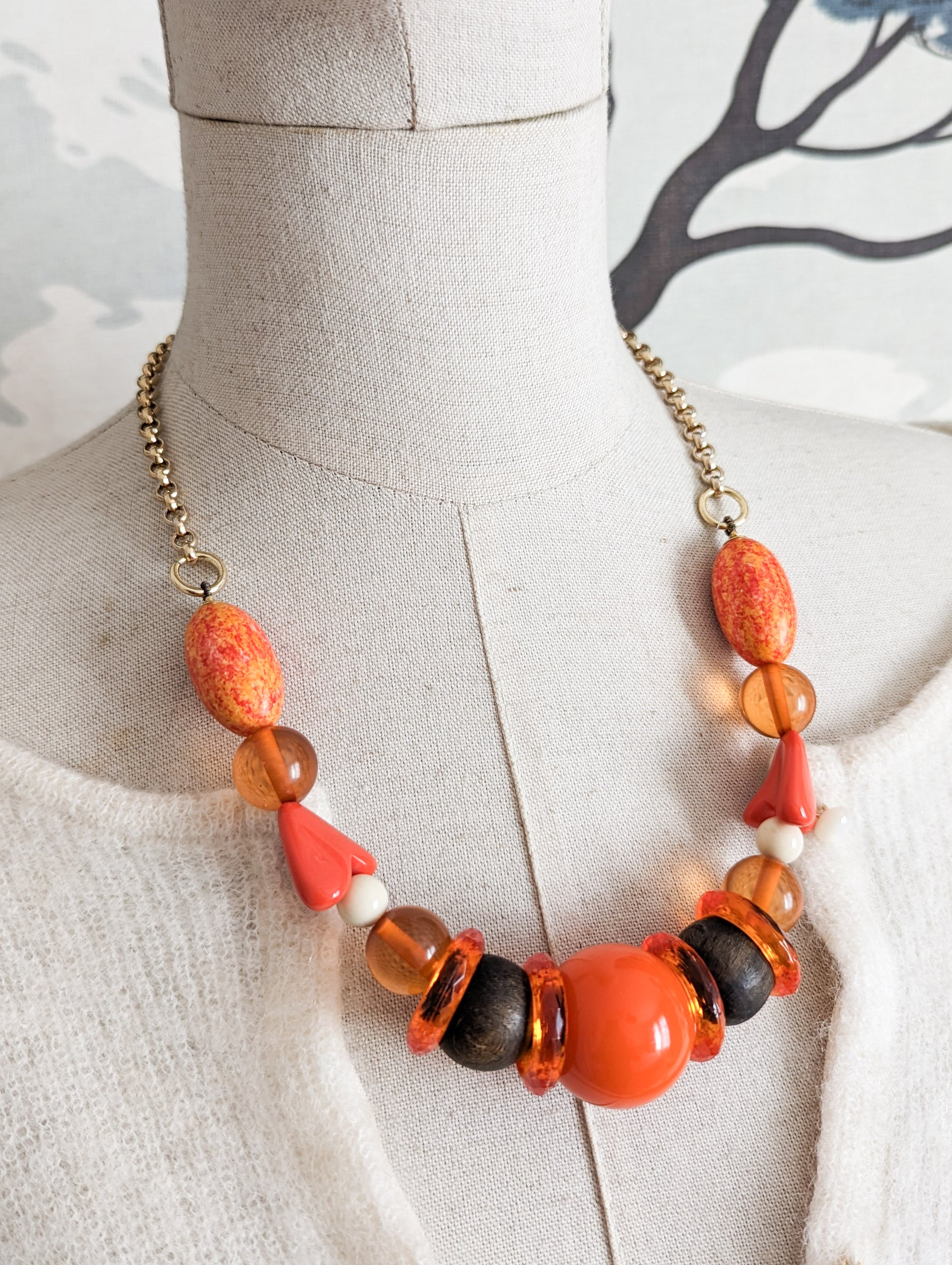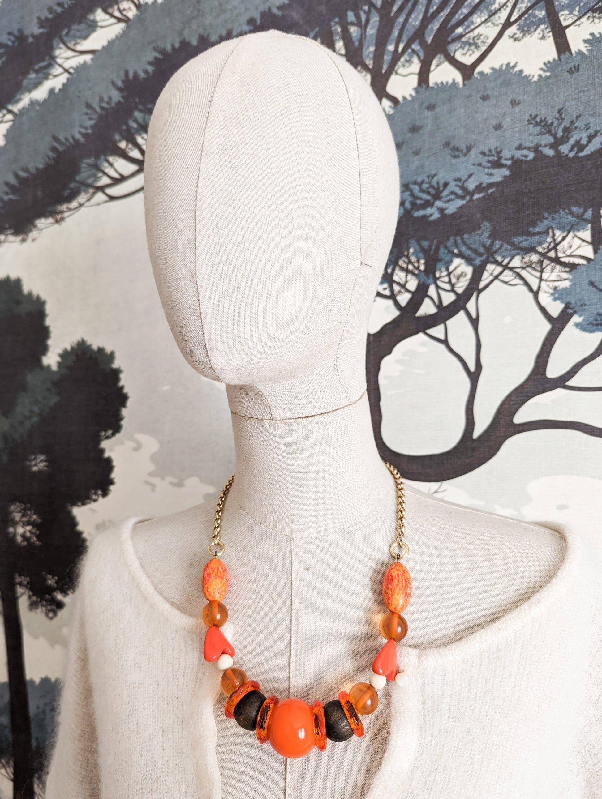 Très joli collier datant des années 80. Il est composé d'une chaînette dorée et de perles en plastique et en bois.