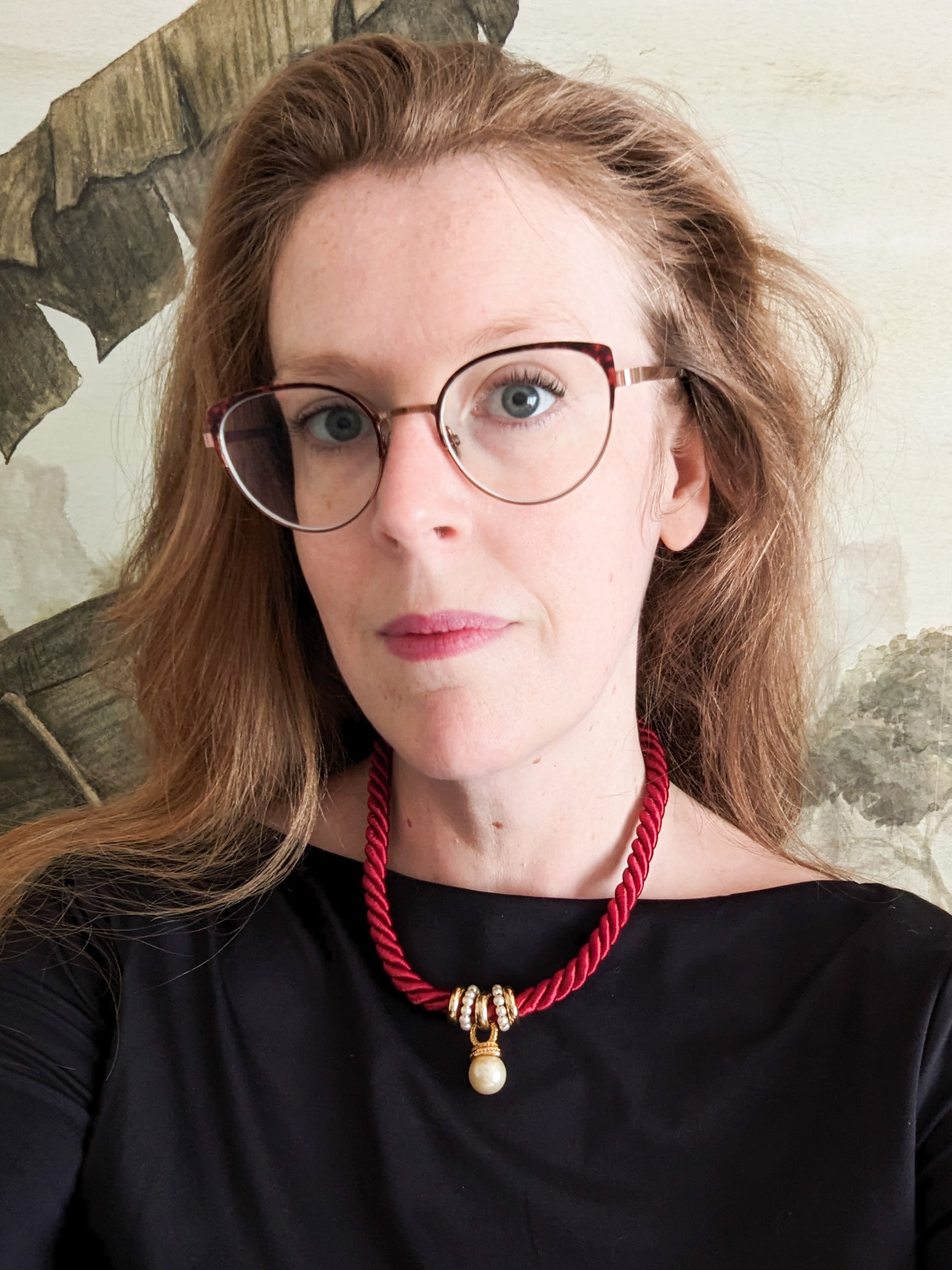 Le collier est composé d'une cordelette torsadée rouge bordeau. Au centre, un pendentif en métal doré porte une perle fantaisie nacrée.