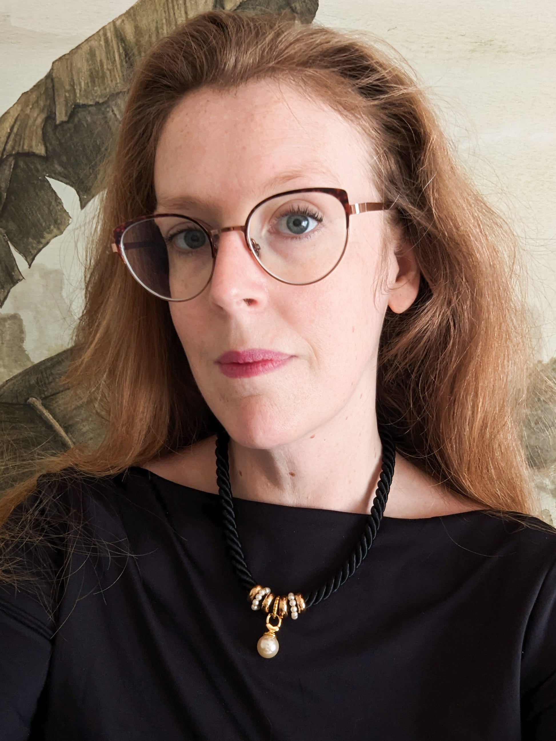 Le collier est composé d'une cordelette torsadée noire. Au centre, un pendentif en métal doré porte une perle fantaisie nacrée.