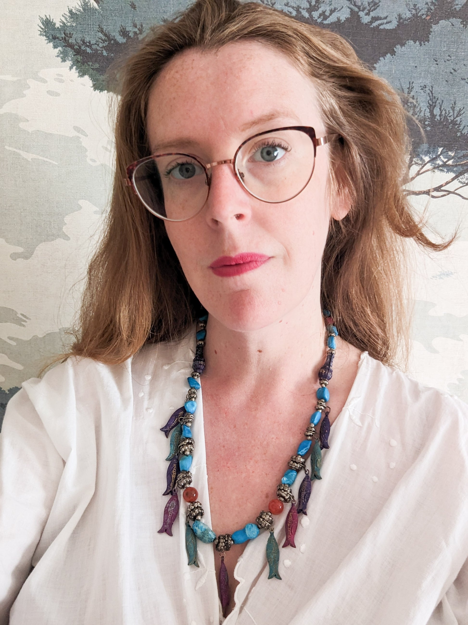 Le collier réalisé à partir de perled en métal argenté, de perles en pierres et d'éléments en métal peint, comme les petites pampilles poissons !