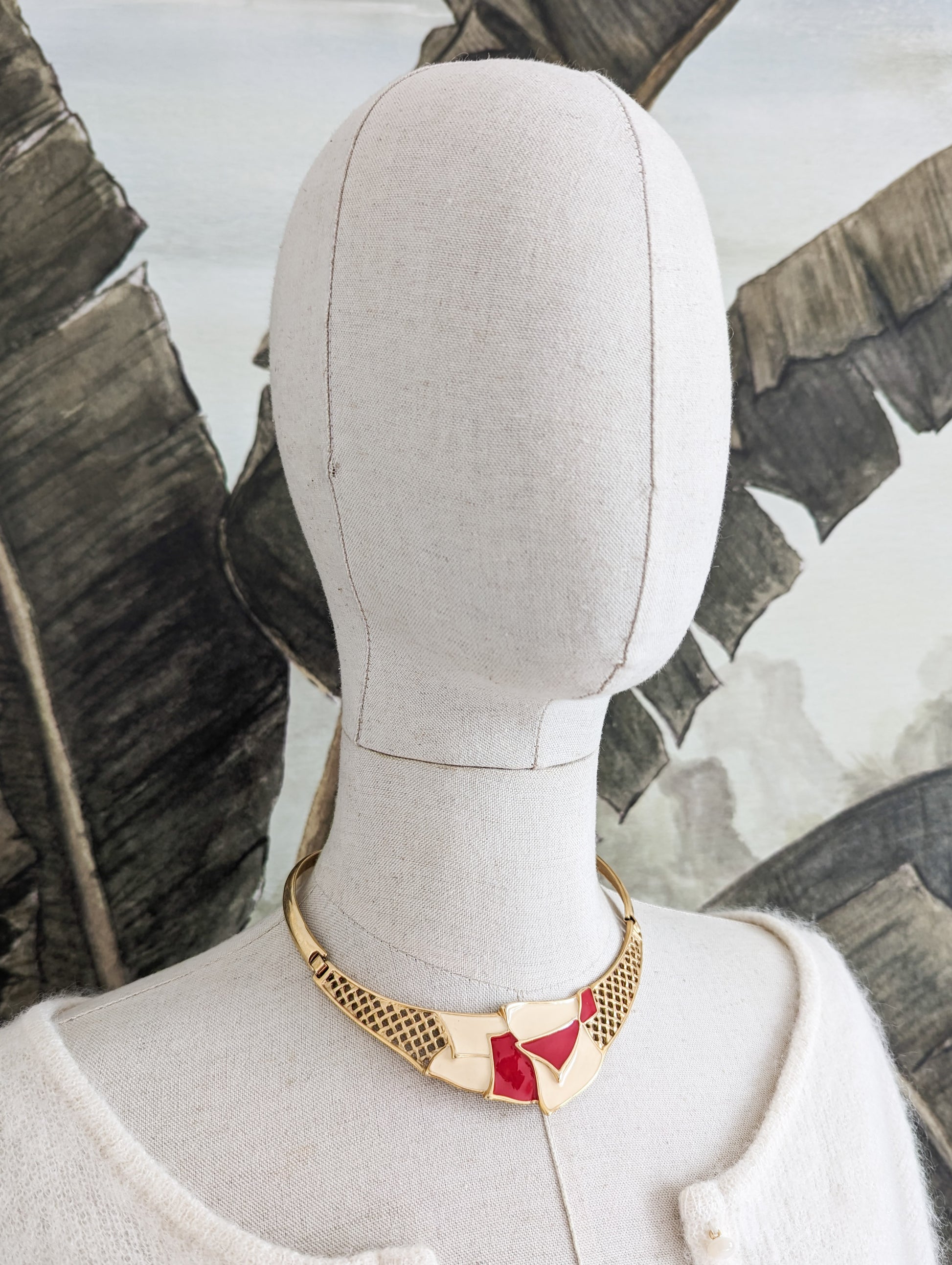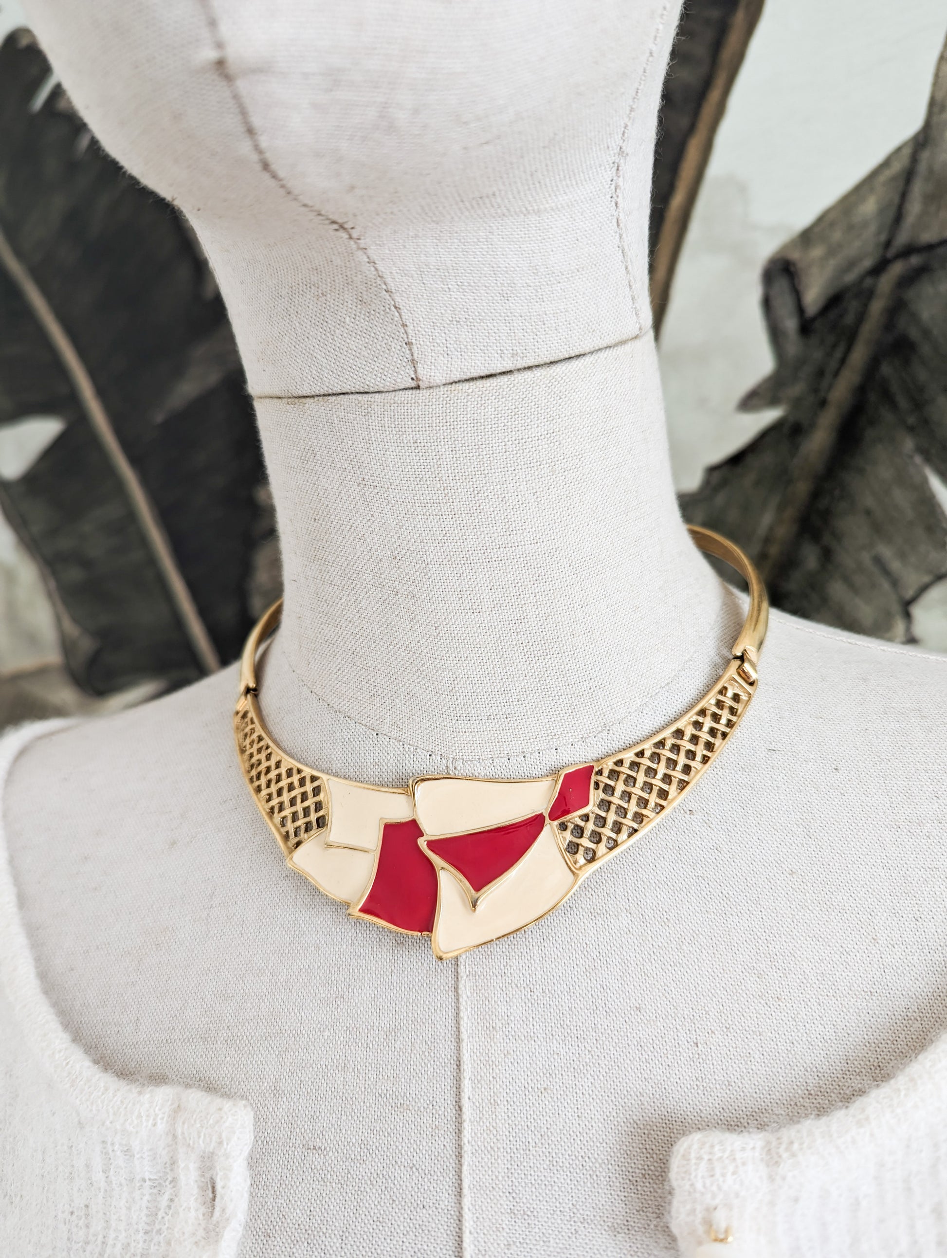 Le collier est court, il est vraiment conçu pour être porté près du cou mais sans serrer ! Il est composé d'éléments rigide en métal doré. Le centre est joliment laqué de crème et de rouge et leetal est travaillé en cannage.