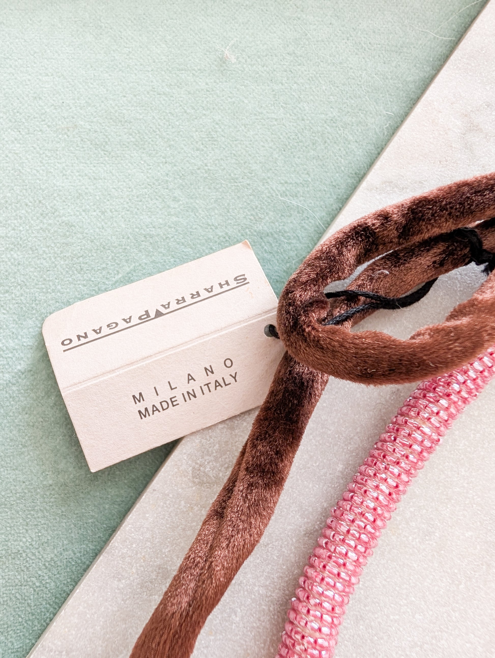Le collier est composé d'une cordelette recouverte de perles de rocaille rose. Deux cordons en velours permettent d'attacher le collier dans le cou.