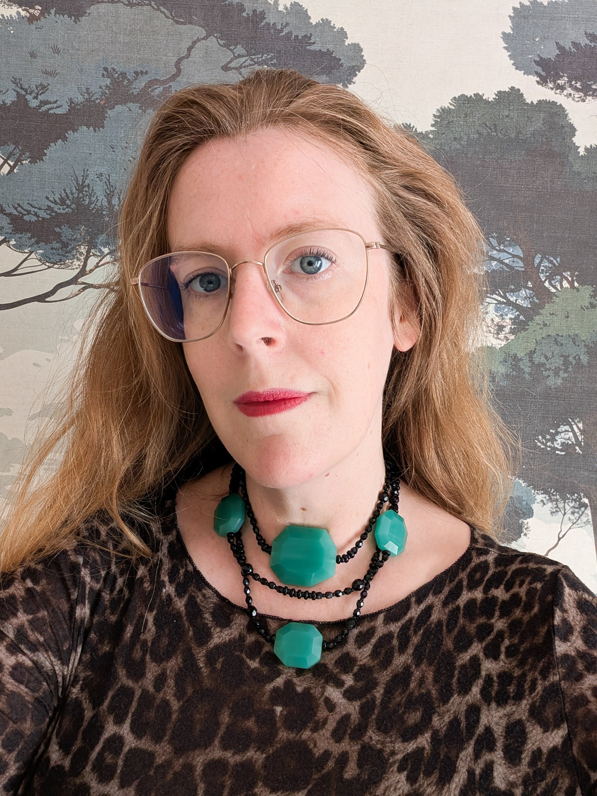 Le collier présente 3 rangs de perles en verre noir a facettes et de très grandes perles en pierre vertes. La couleur est pierres est absolument incroyable, presque onirique ✨