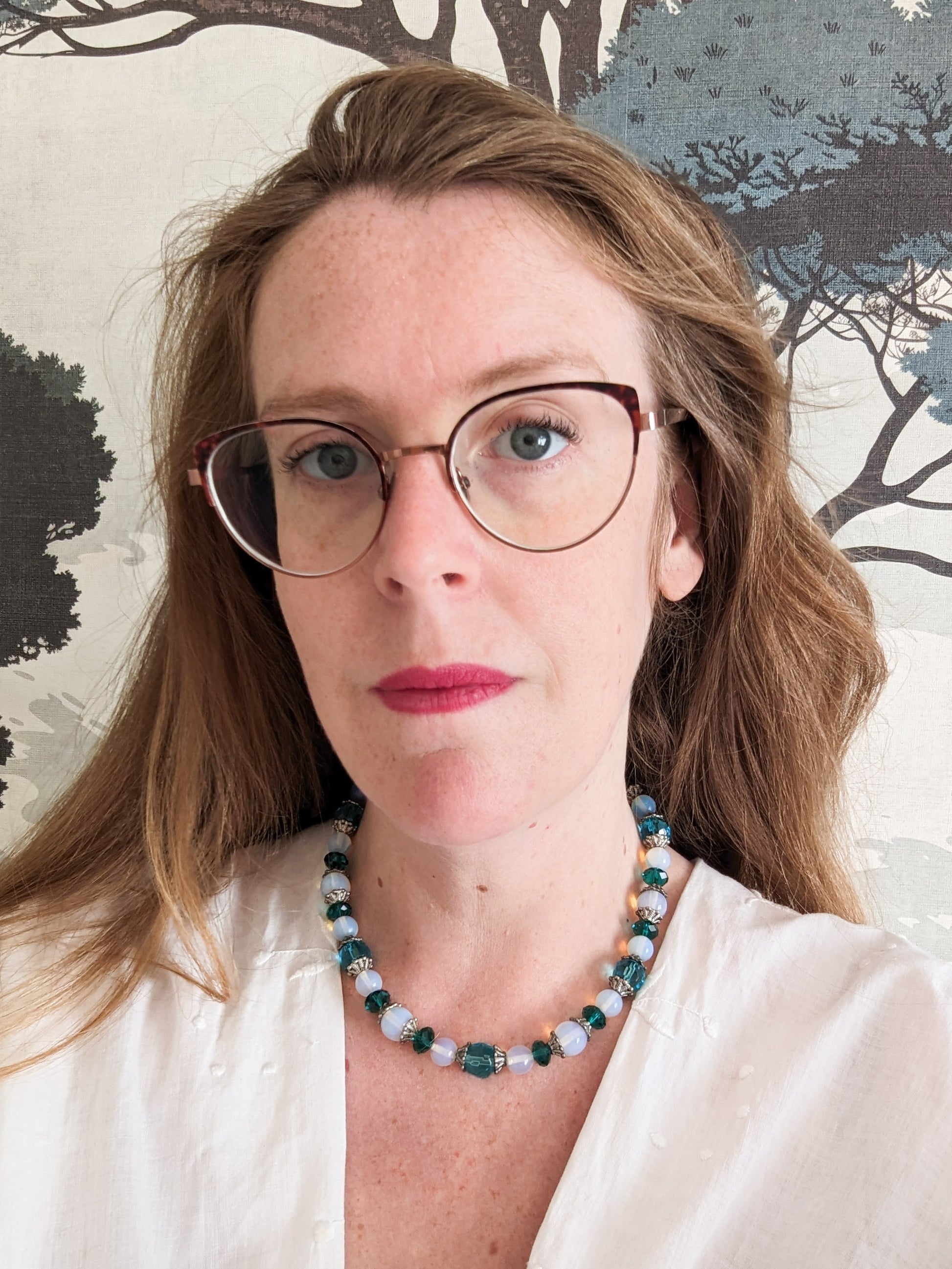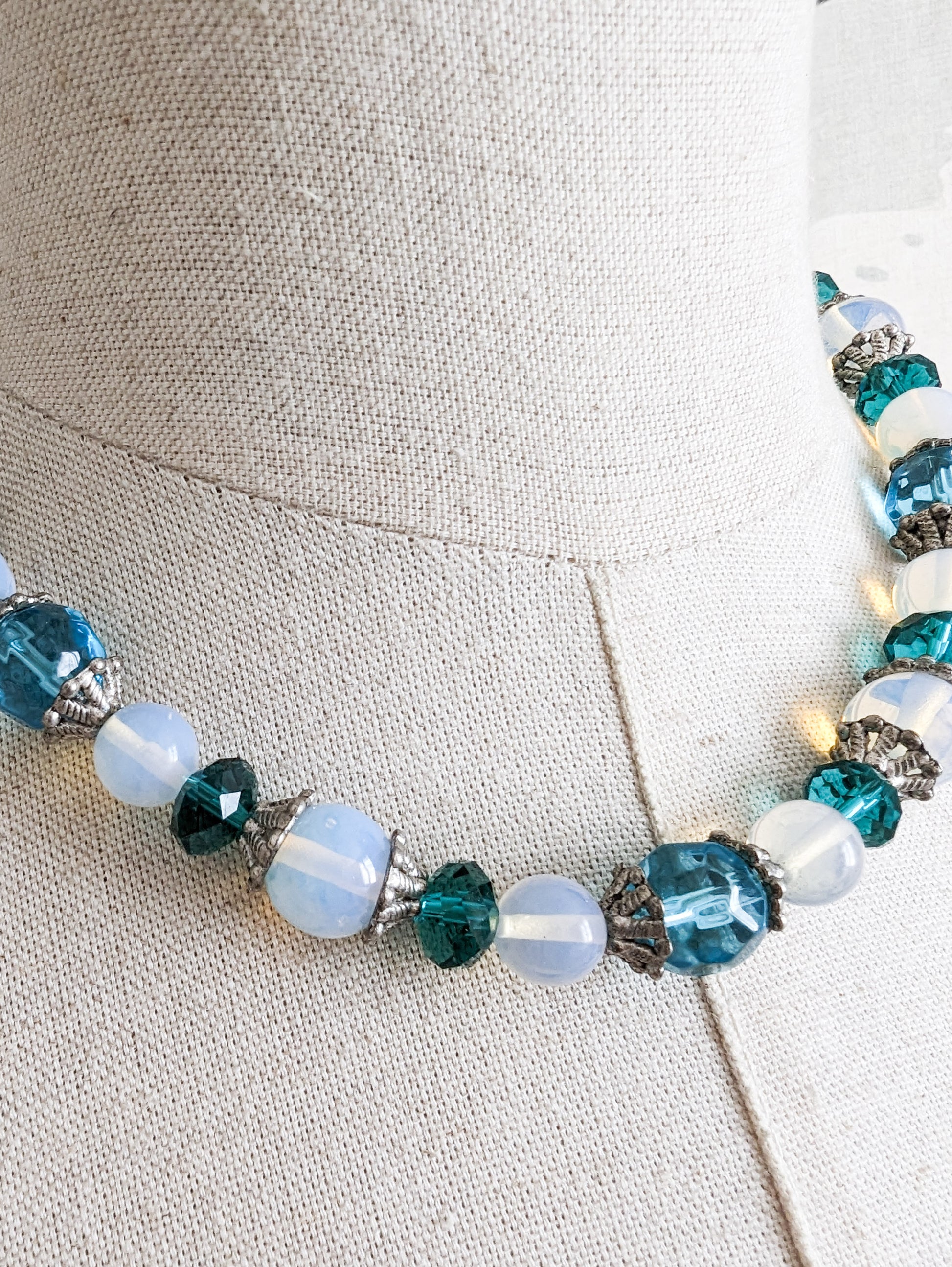 Le collier est composé de perles en verre. Des perles à facette d'une belle couleur bleu vert et des perles en verre façon pierre de lune.