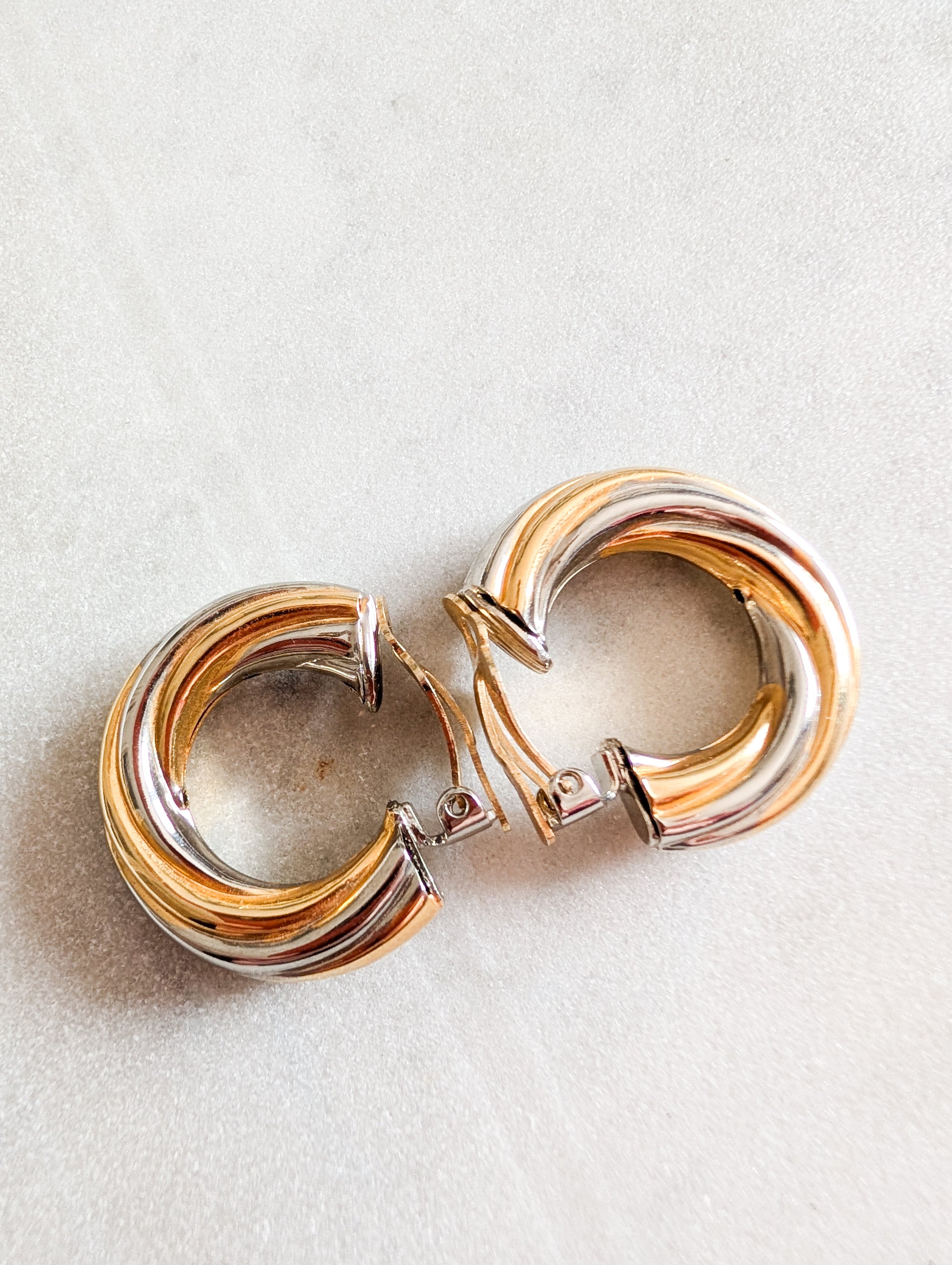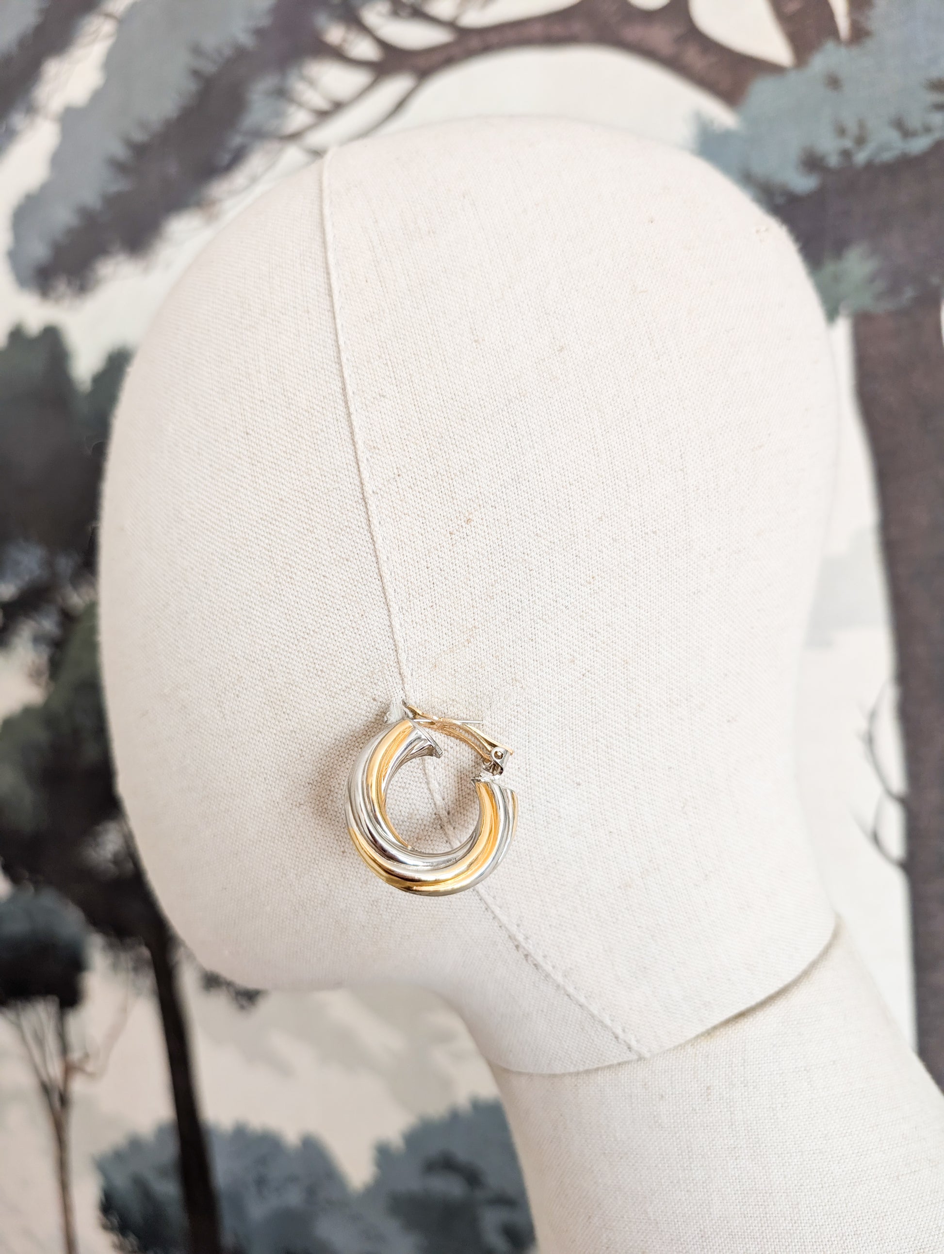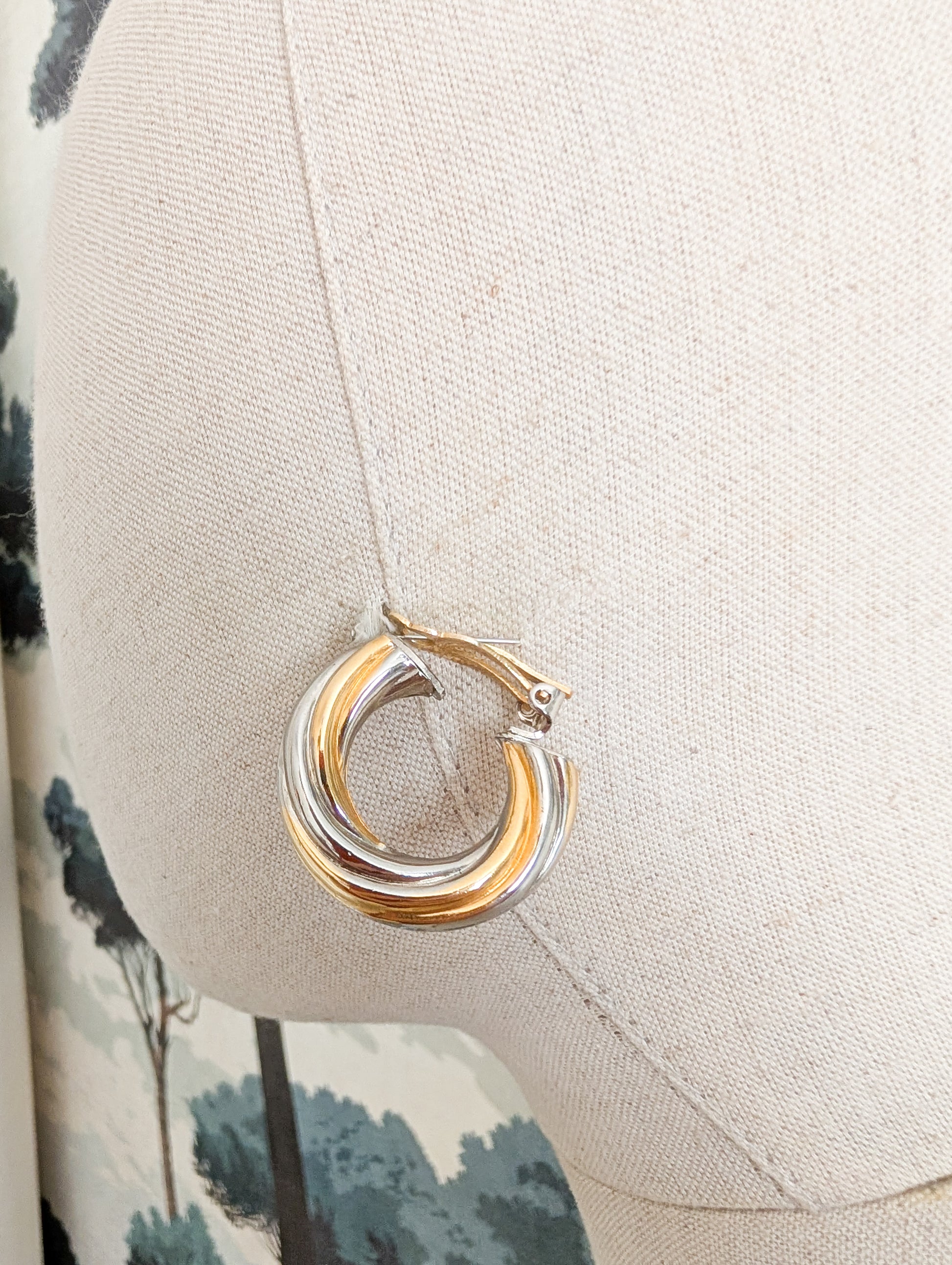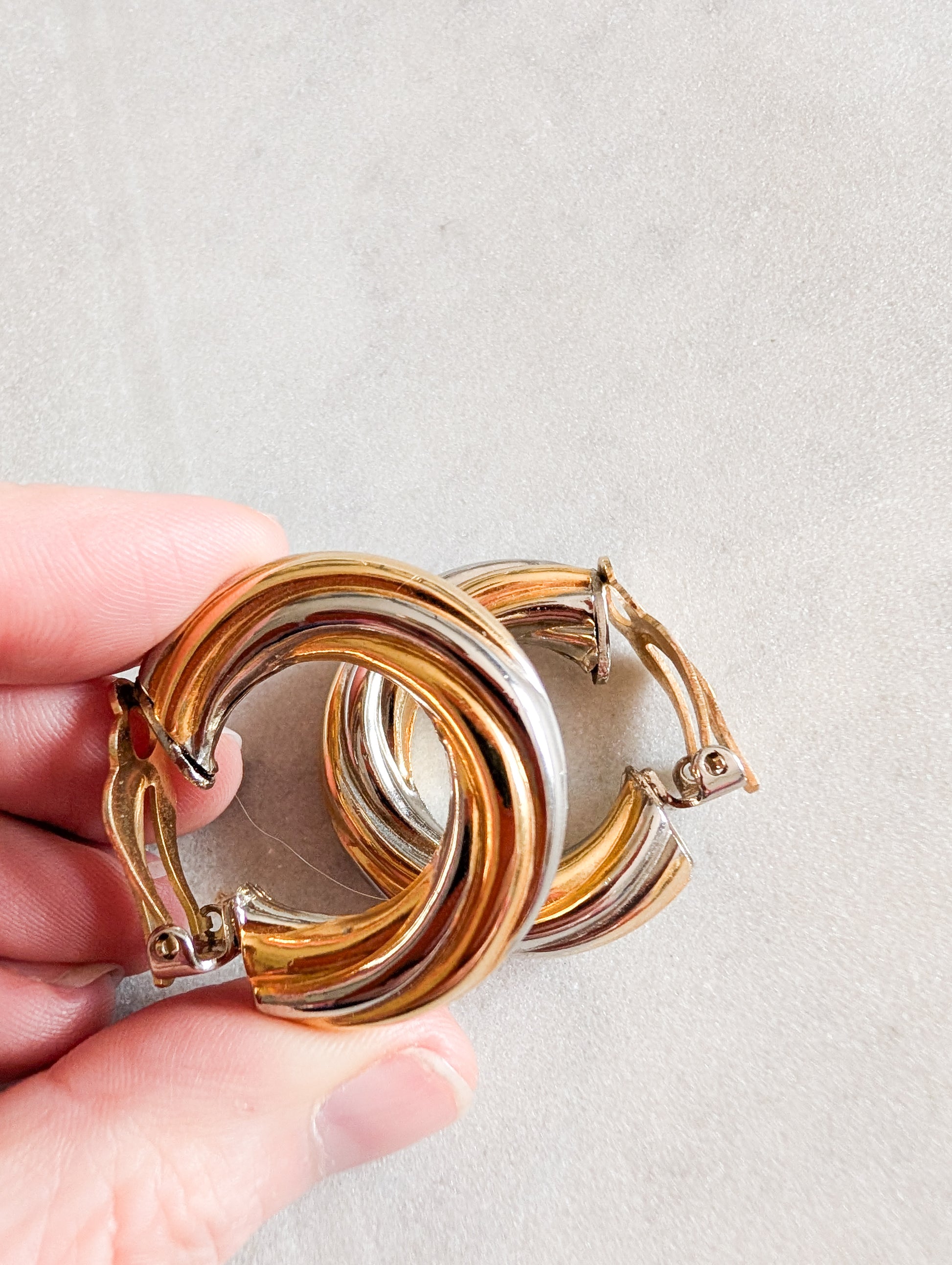 Les boucles sont des créoles en métal doré et argenté. Très beau design avec cet effet torsadé.