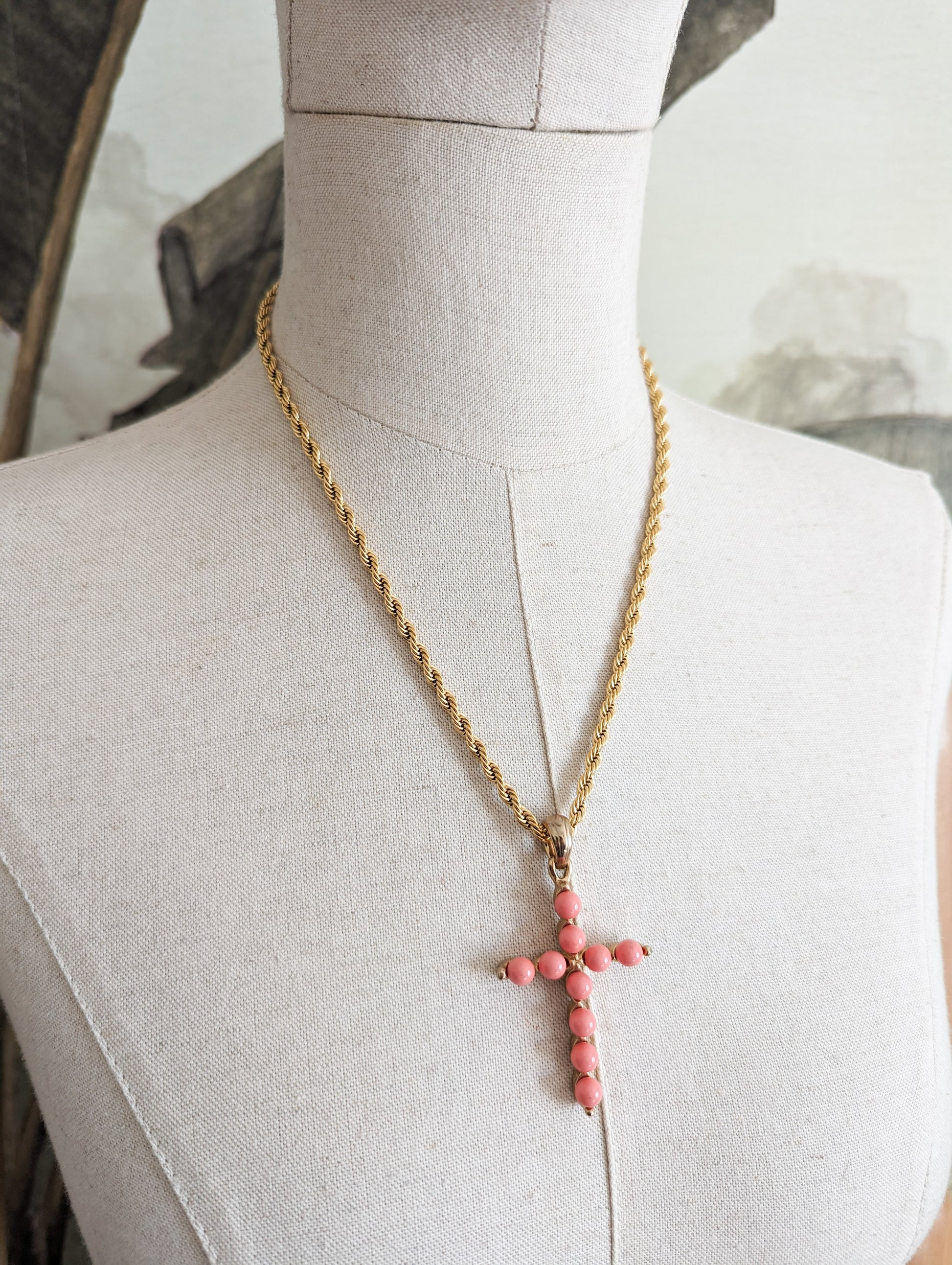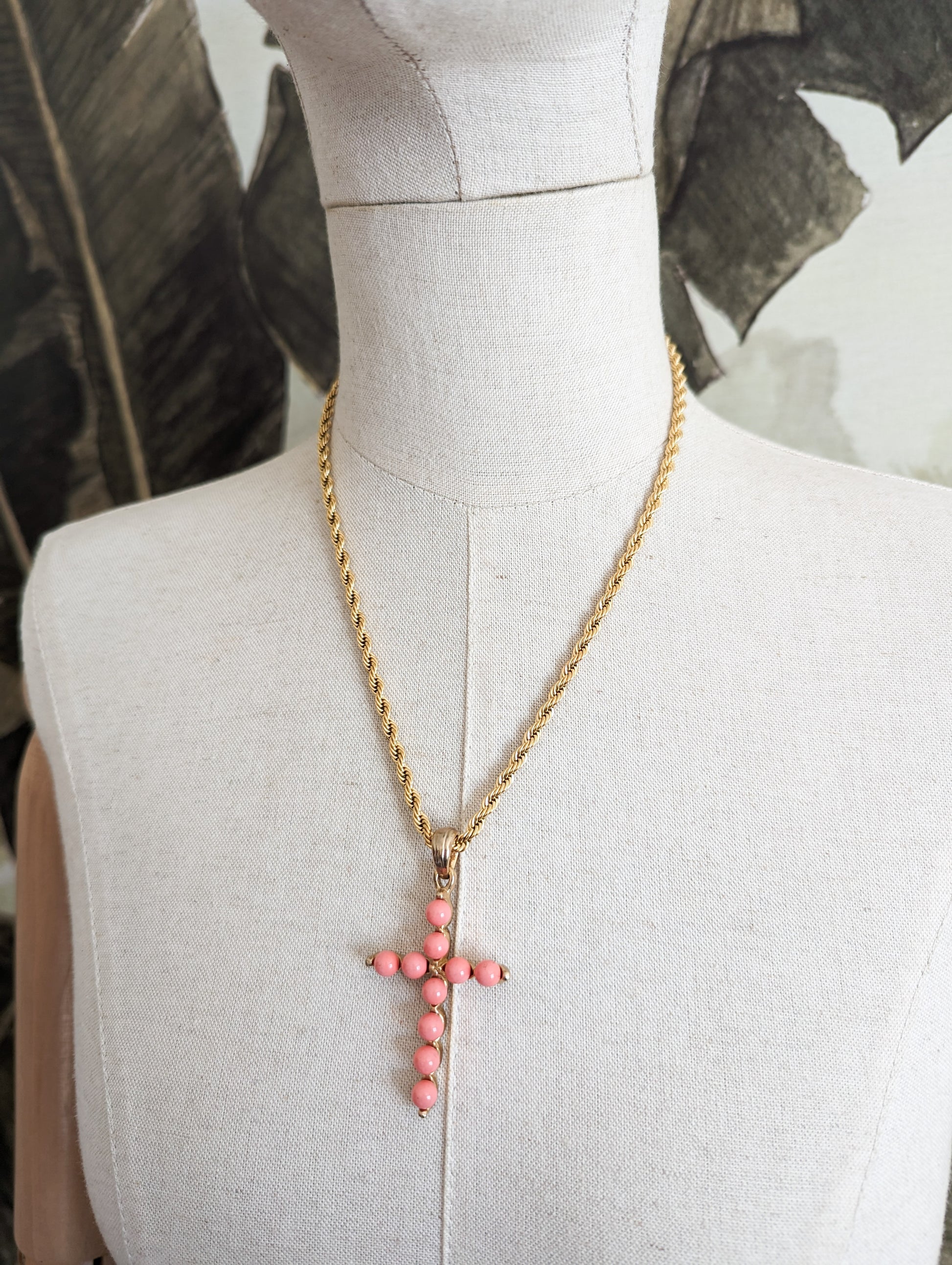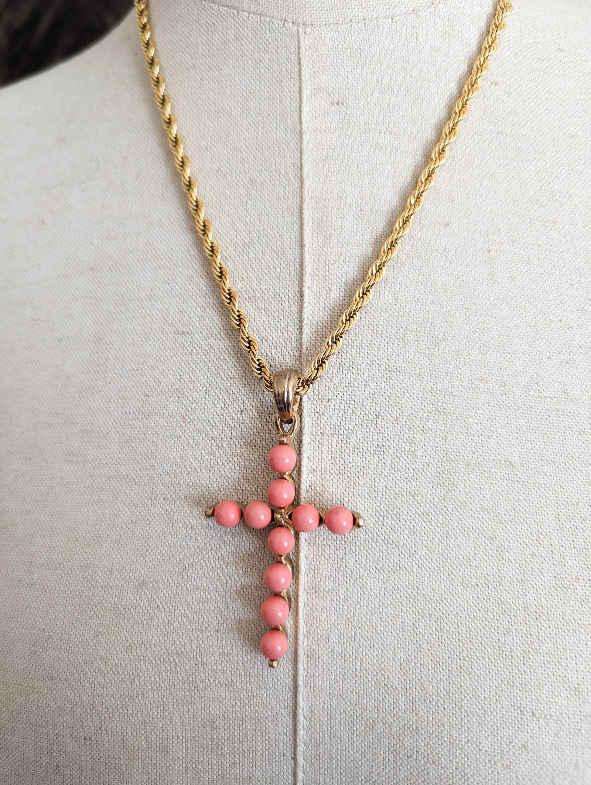 La croix est pavée de belles perles roses. Superbe montage. Le bijou est de très belle facture.