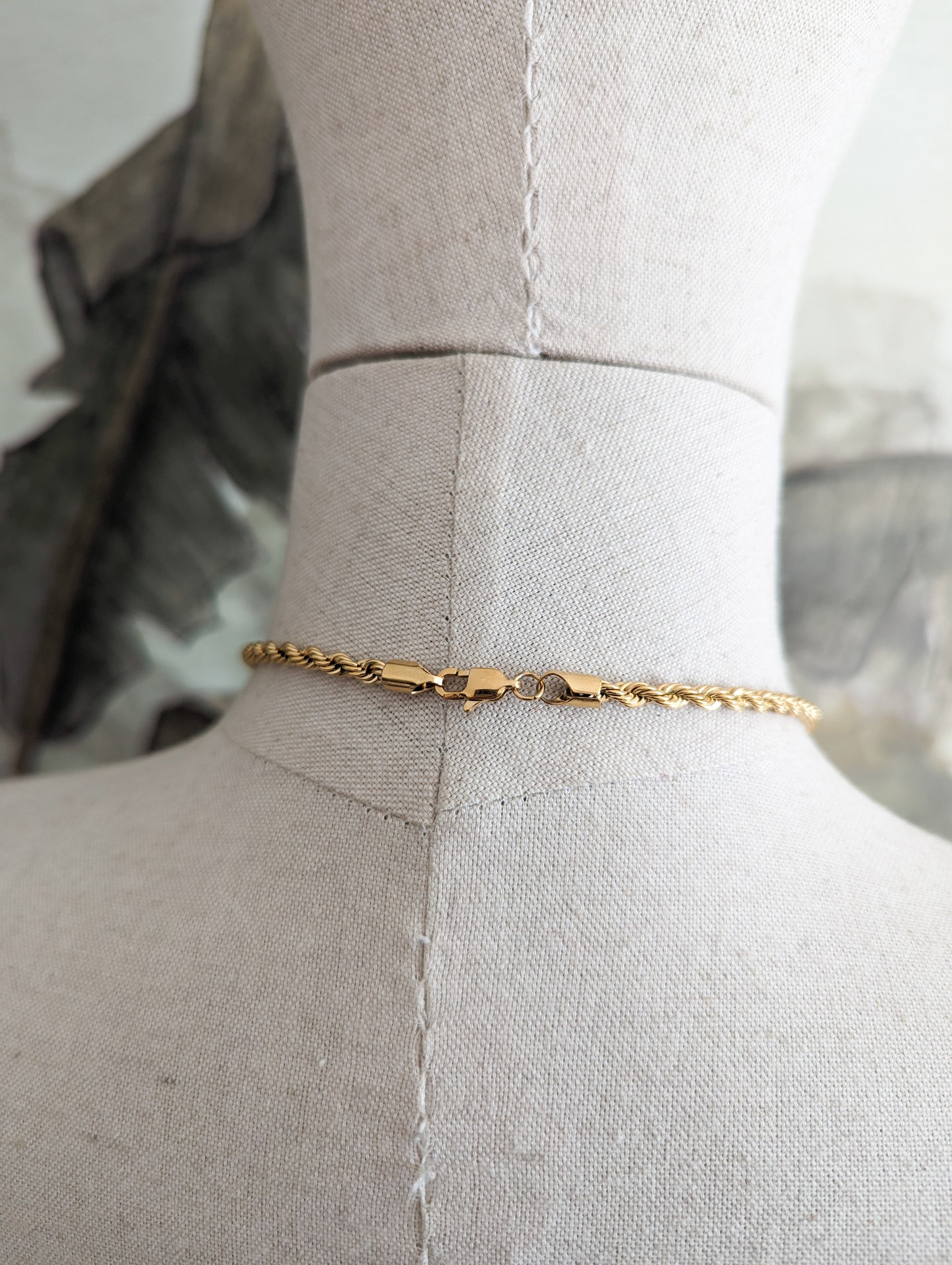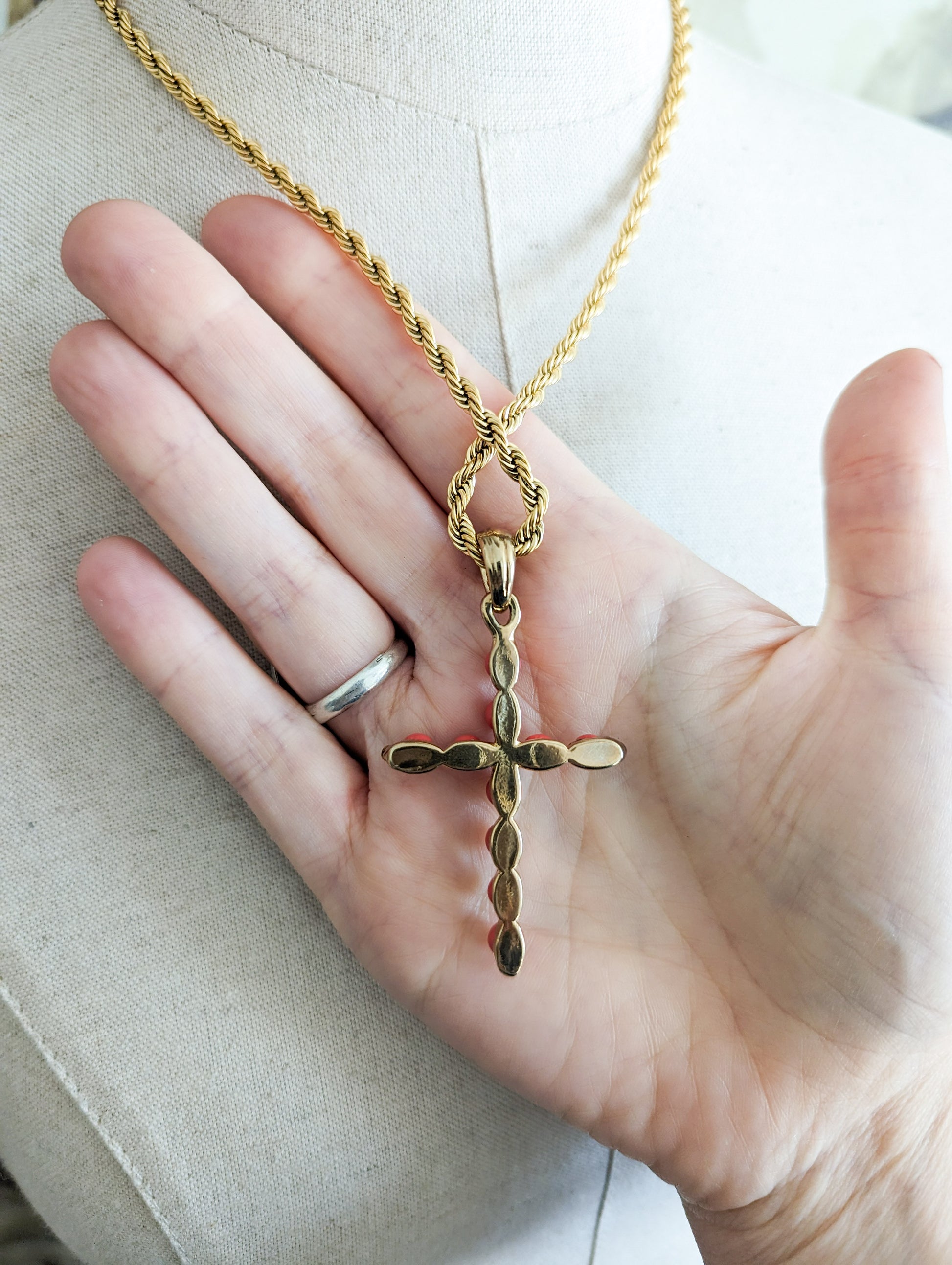 La croix est en métal doré. Elle est montée sur une chaînette torsadée en métal doré également.