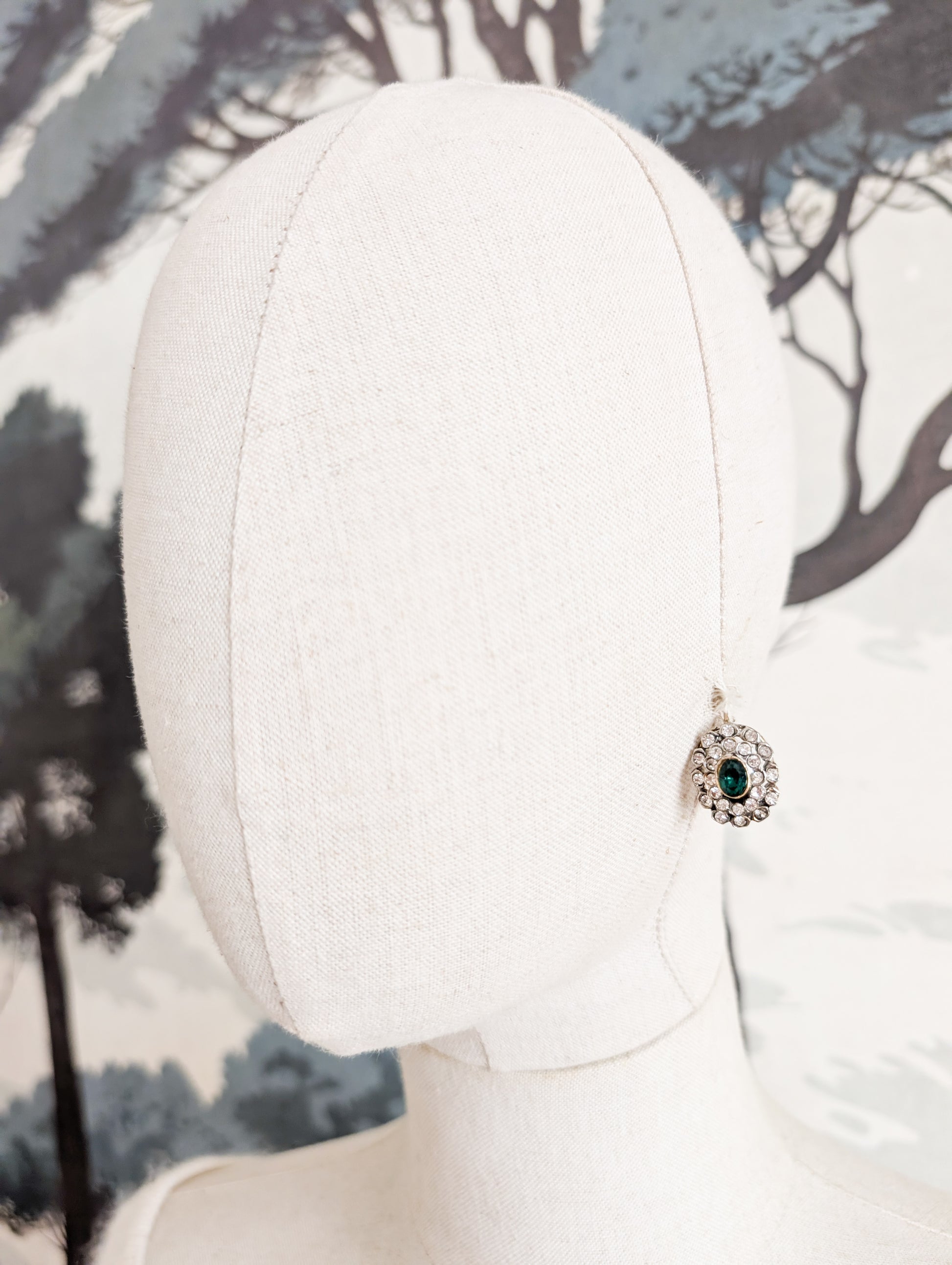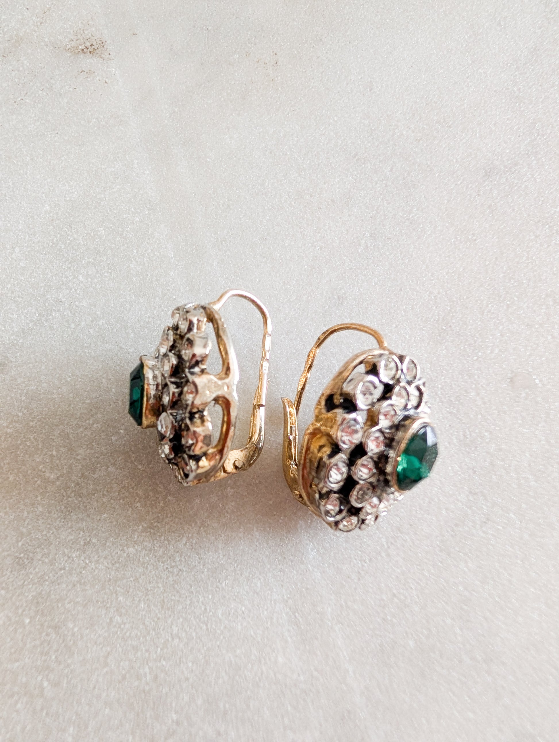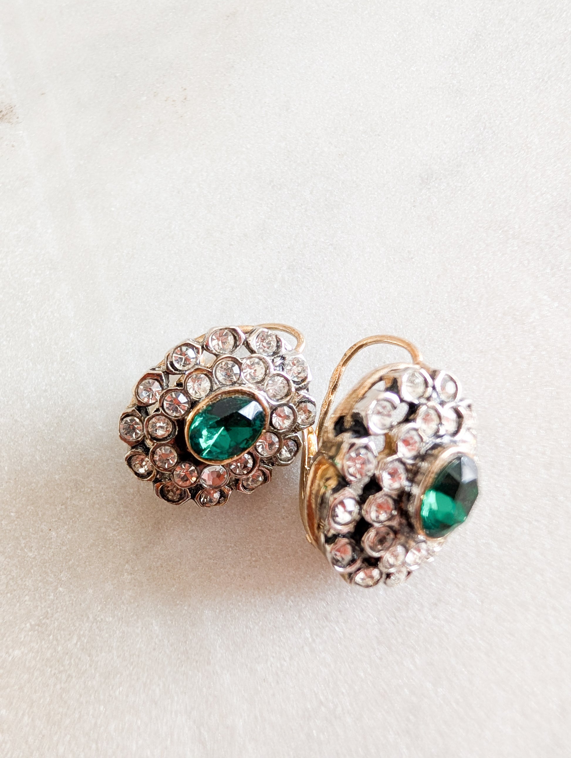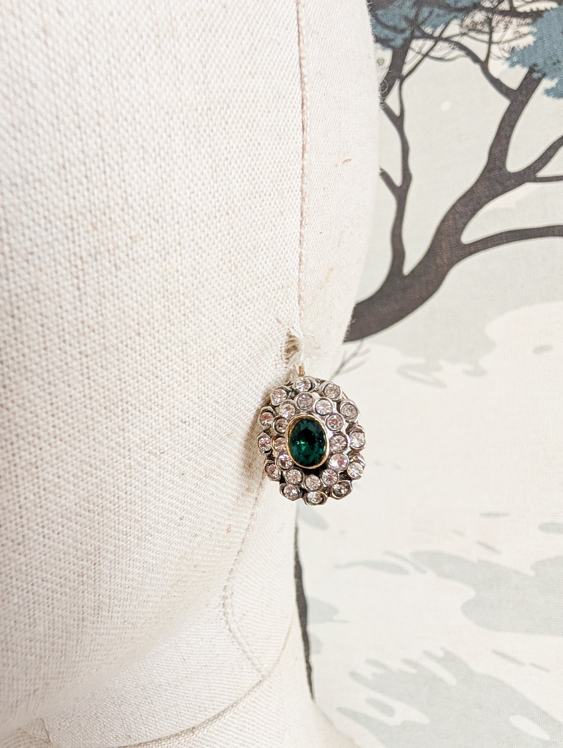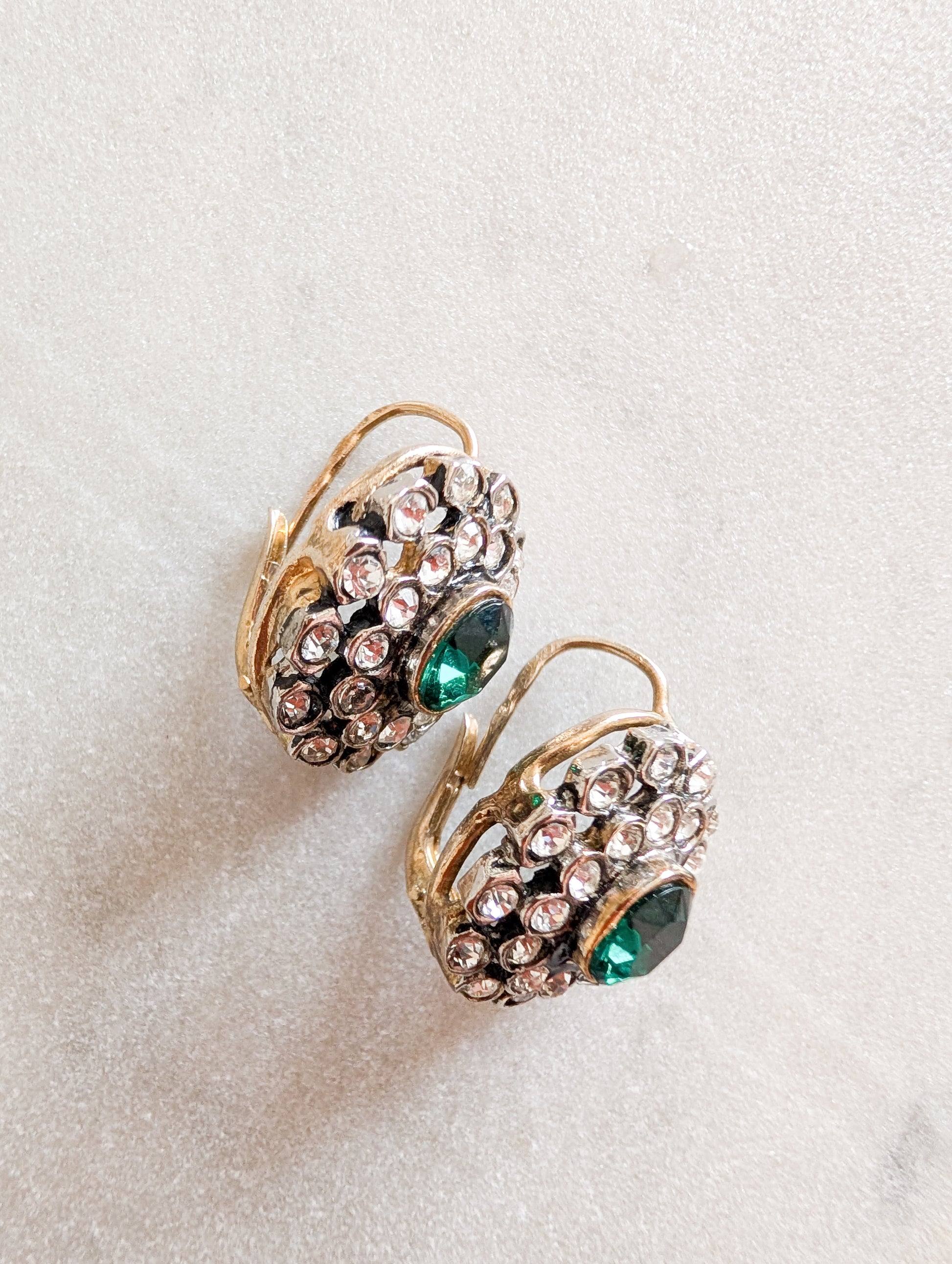 La monture est en métal doré, pavée de strass blanc et vert émeraude.