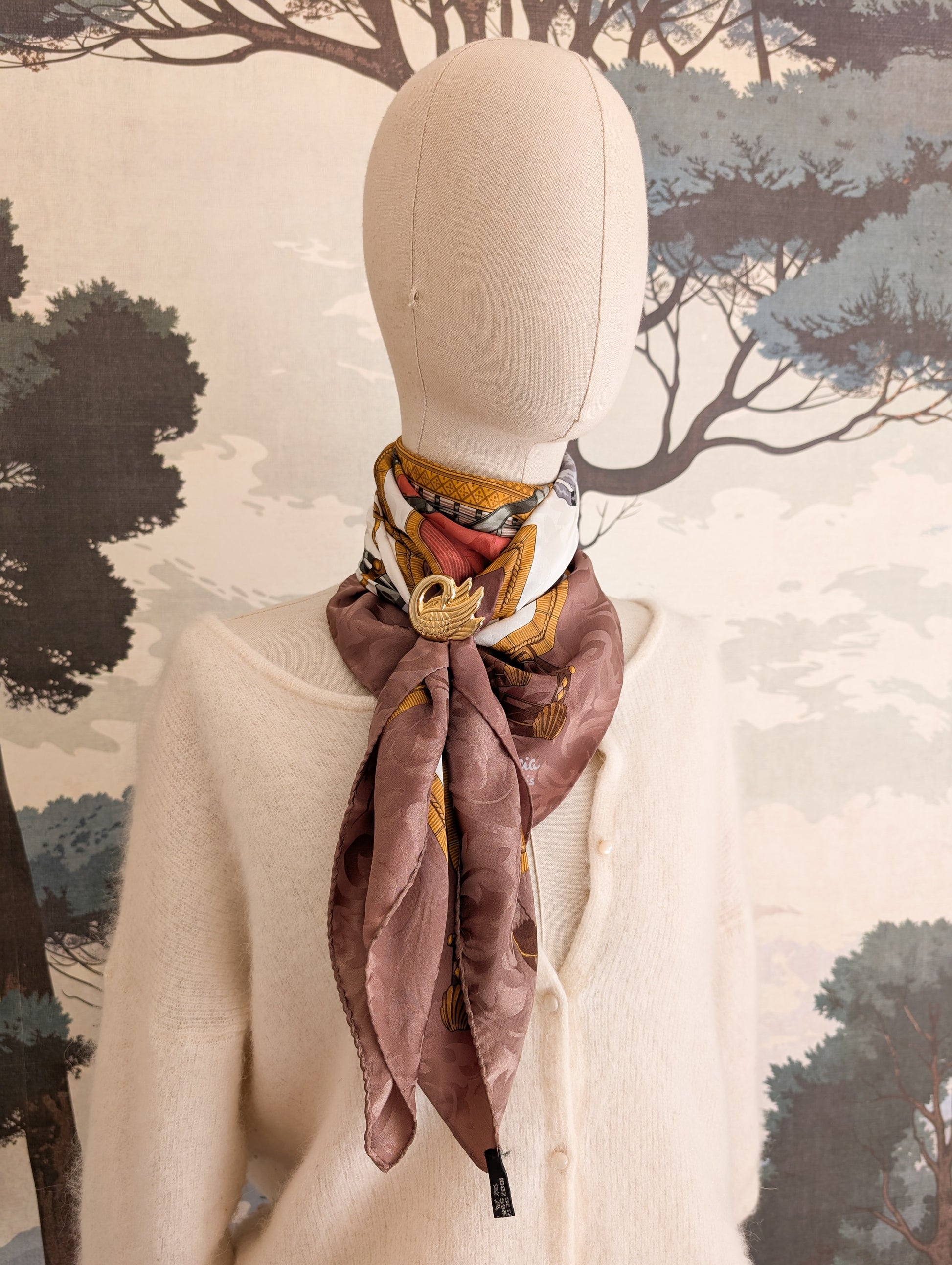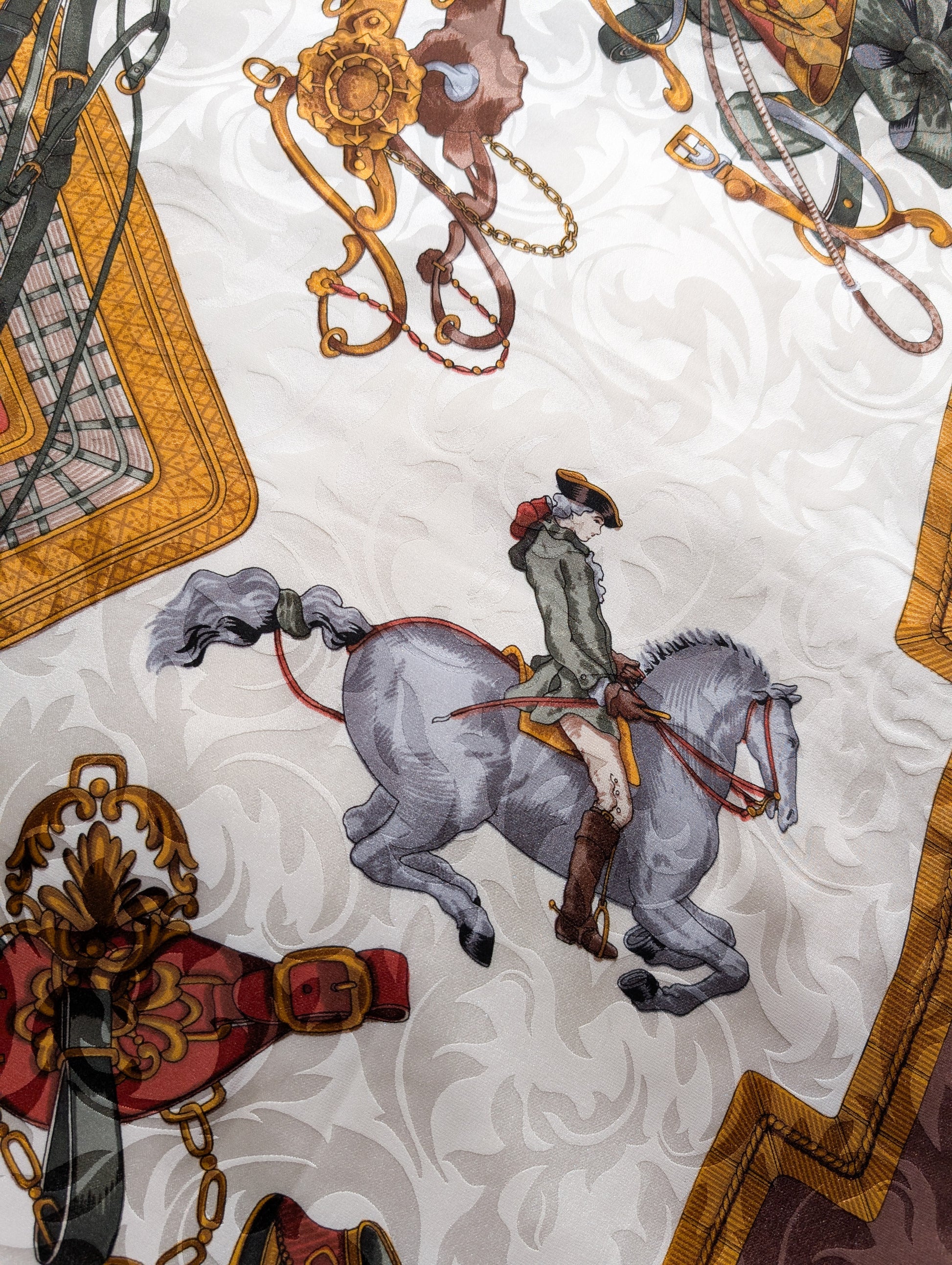 Le foulard est en soie damassée. Le dessin représente des cavaliers et éléments liés à l'univers du cheval et des cavaliers.