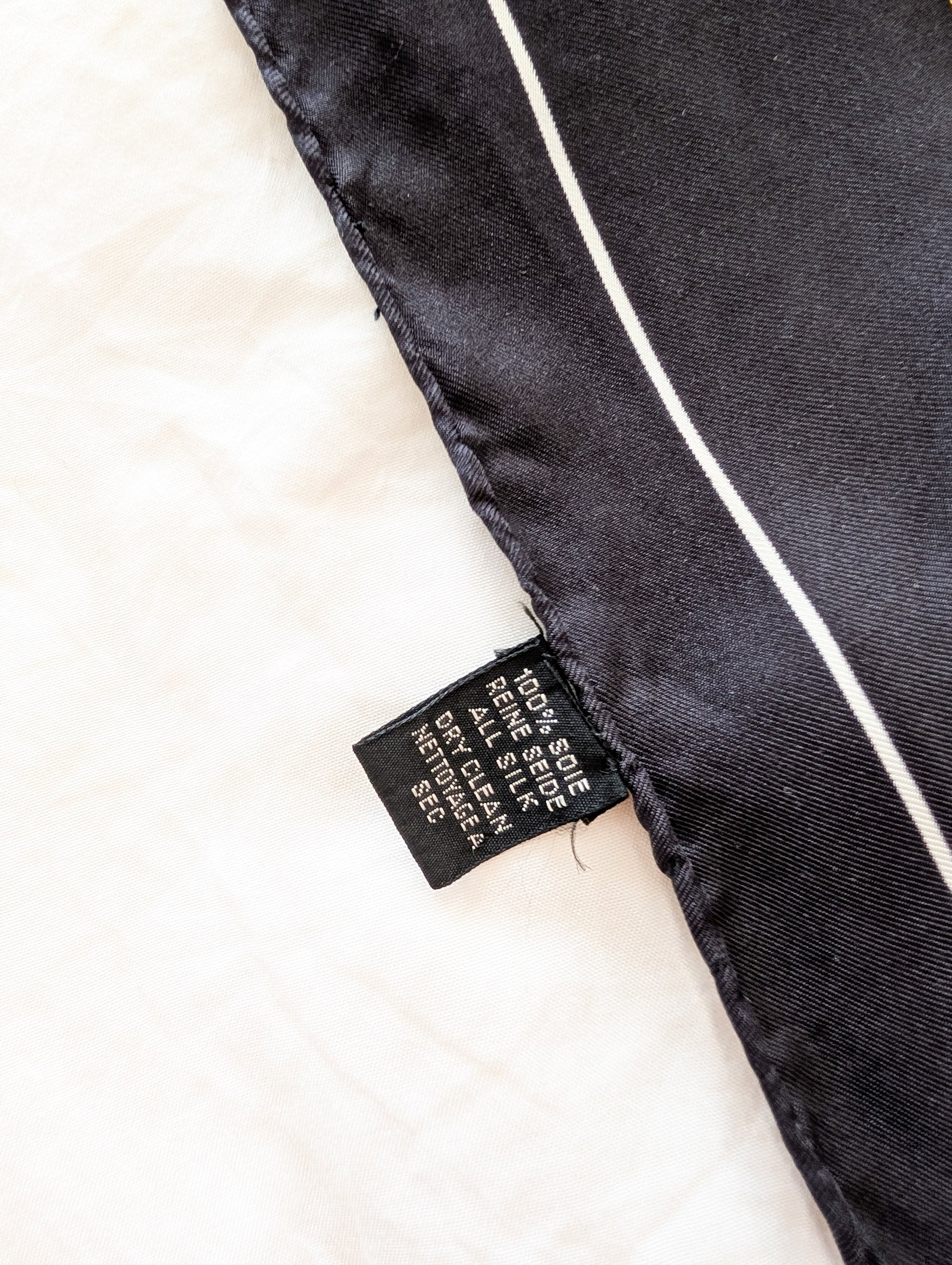 Le foulard a été fabriqué en France. Il est en parfait état. Grand carré de 85cm de côté.