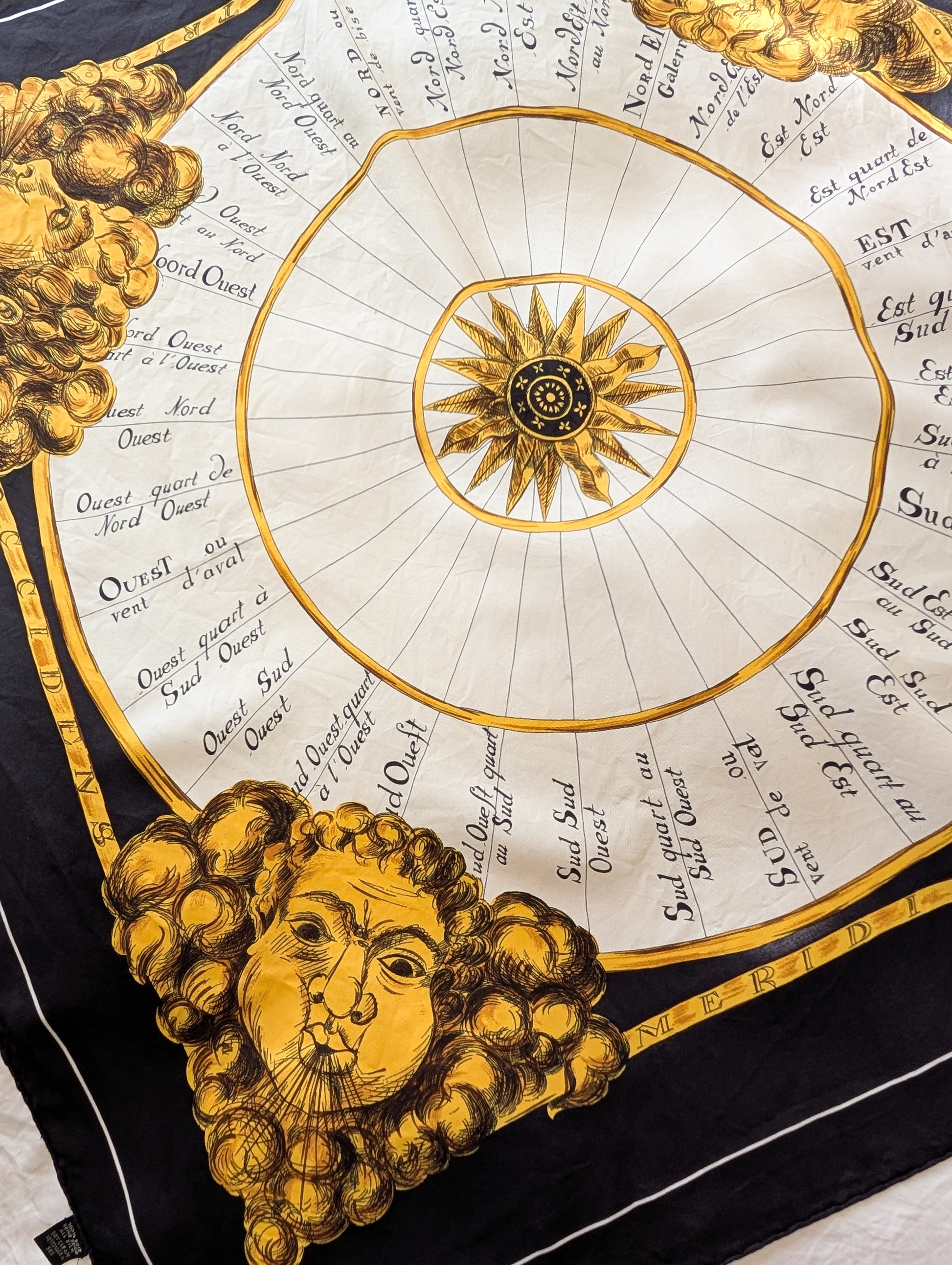 Le dessin du foulard représente une grande boussole. Aux quatre coins sont représentés les vents. Le cadre du foulard est noir et le centre est blanc. La boussole est jaune or.