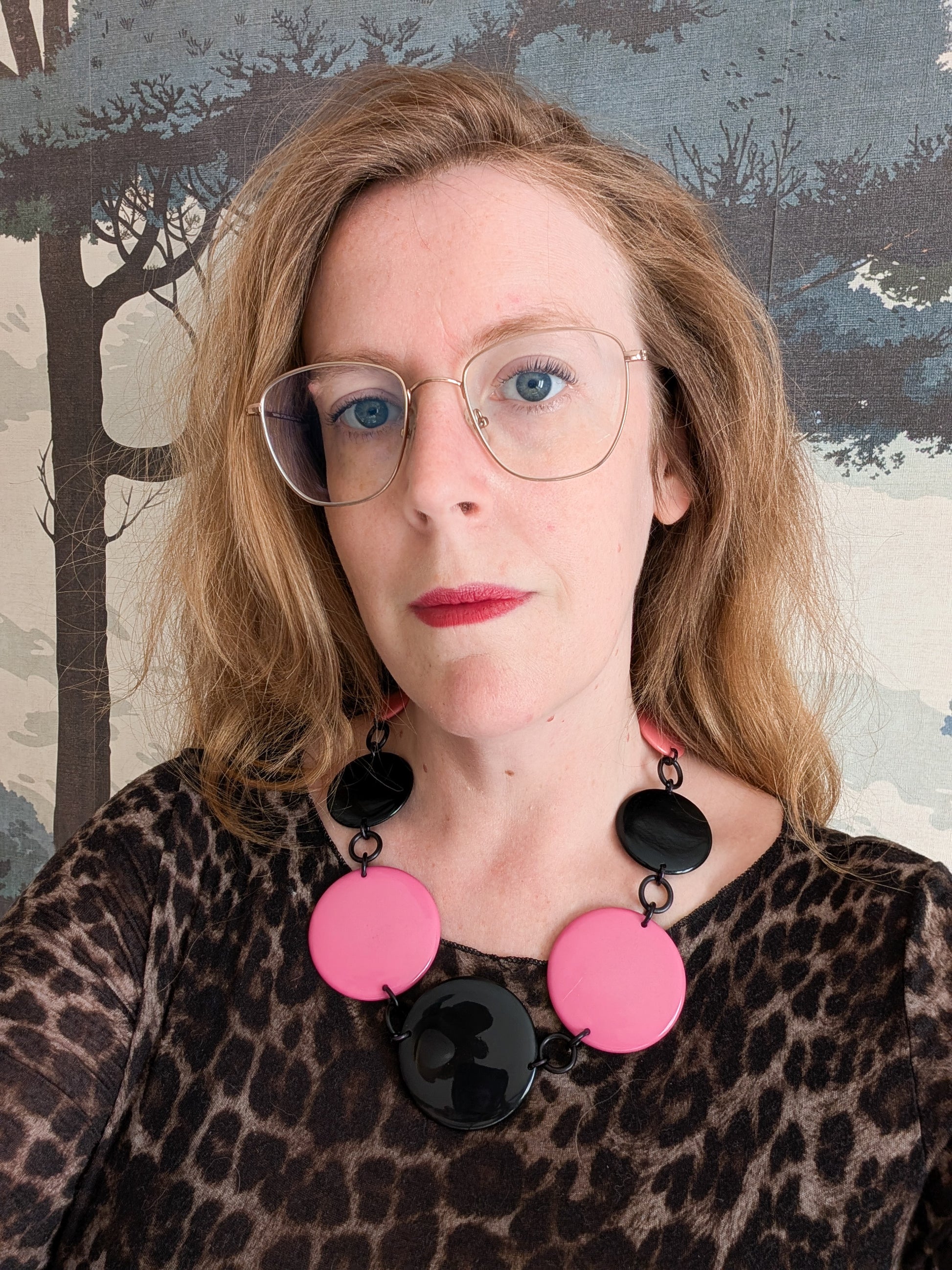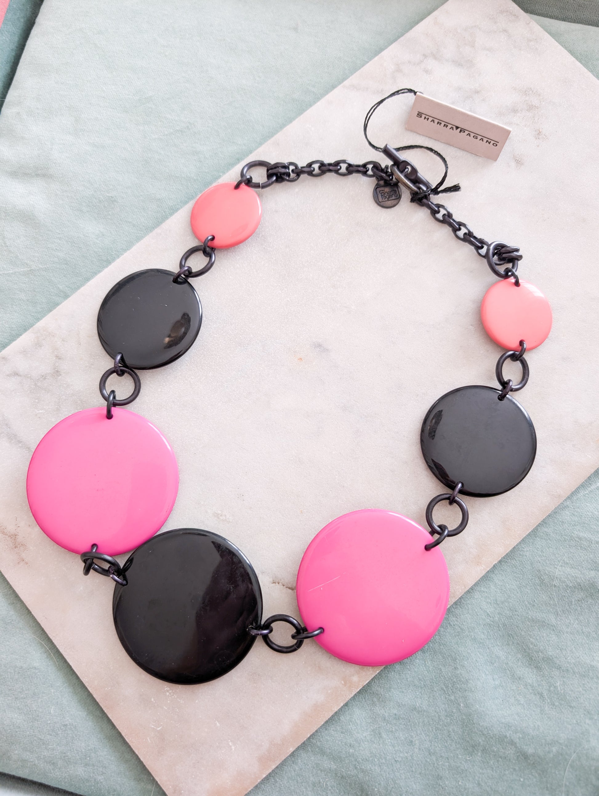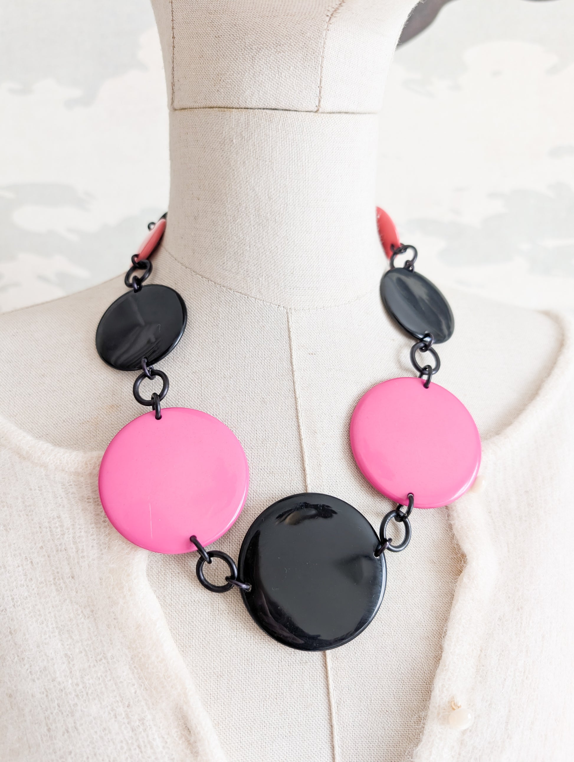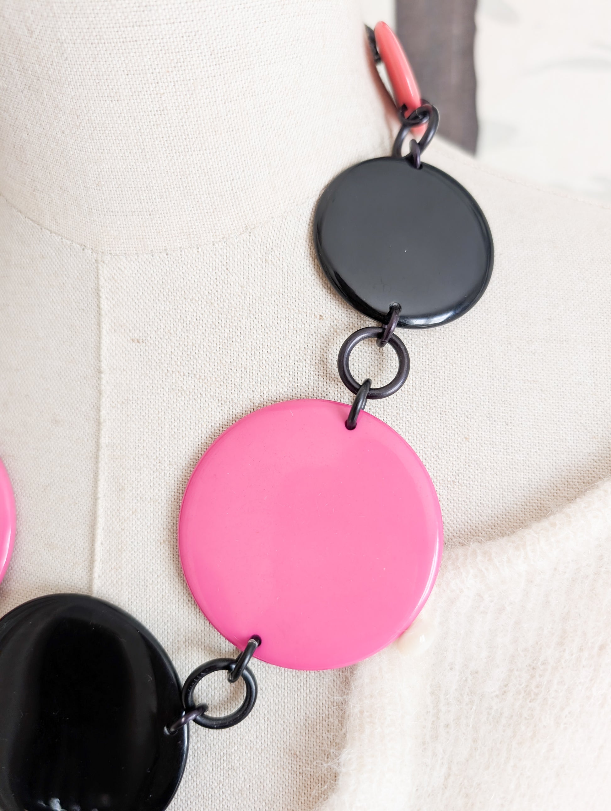Le collier est inspiré des années 70. Il présente une succession de grandes mailles en plastique rose et noirs. Elles sont reliées entre elles par des mailles en métal noir.