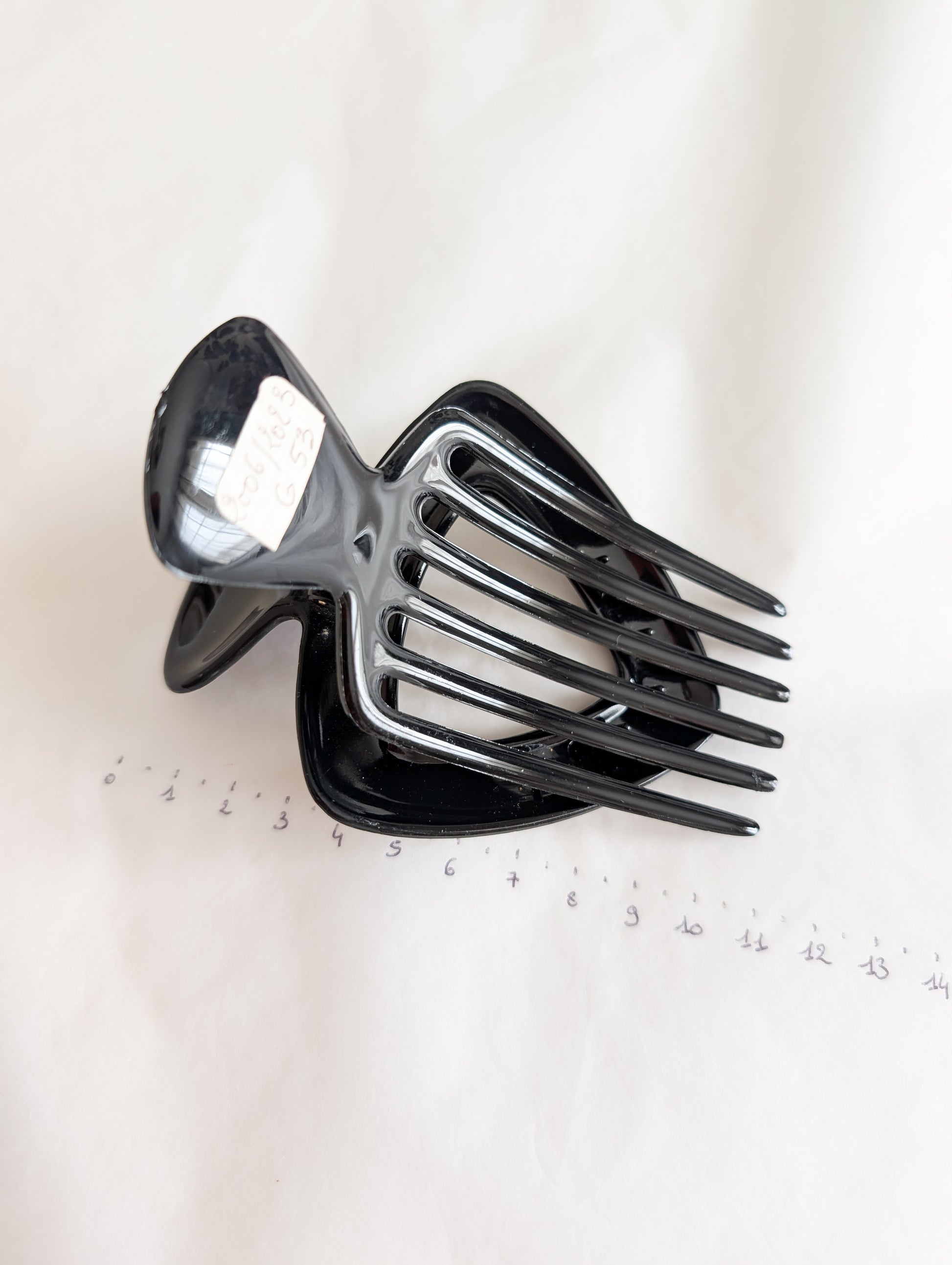 La pièce provient du stock d'un atelier de fabrication de barrettes et bijoux de cheveux situé dans le Jura. Le Jura est le berceau de l'industrie du plastique français. On y fabrique des pièces de très grande qualité.