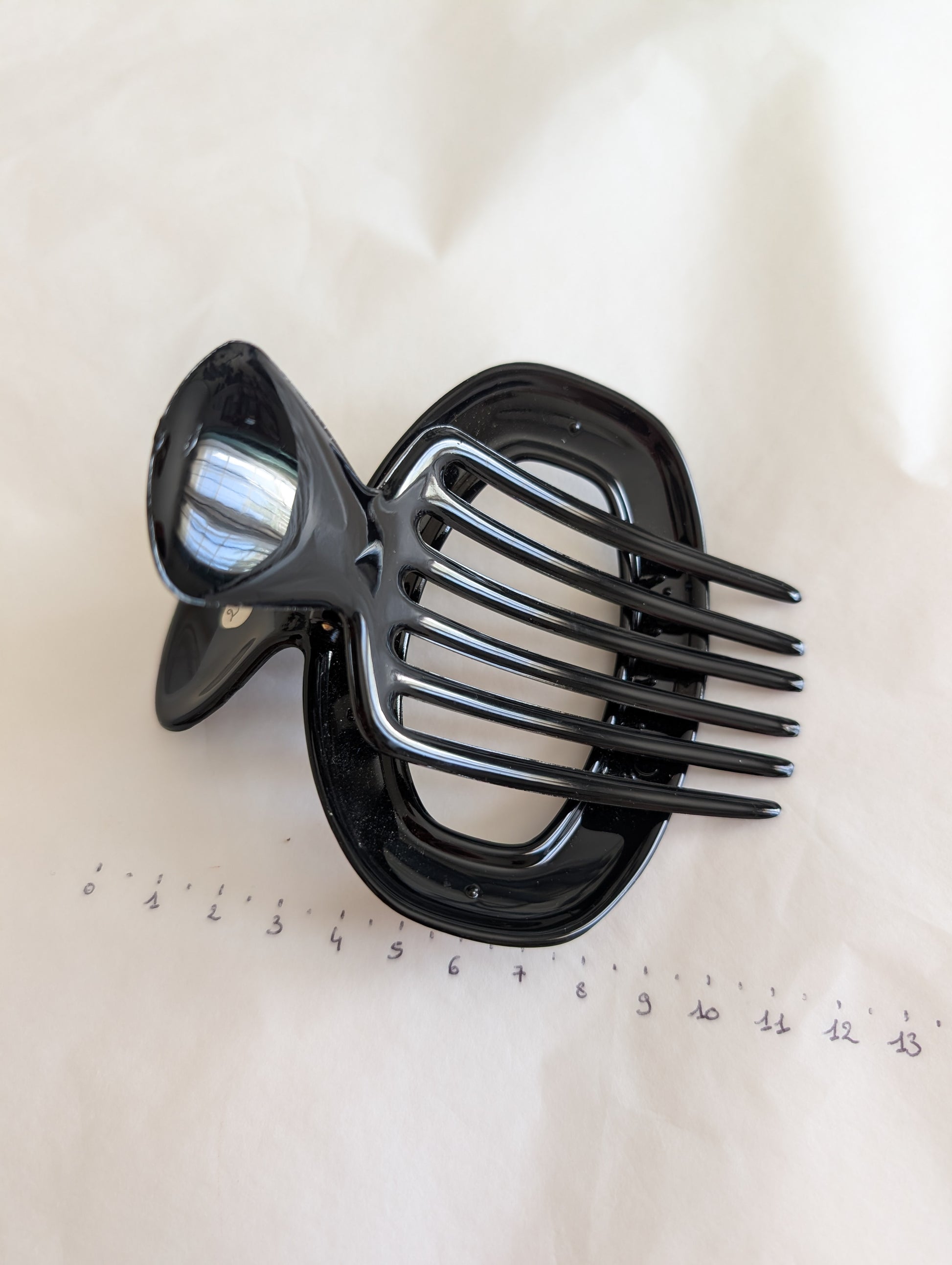 La pièce provient du stock d'un atelier de fabrication de barrettes et bijoux de cheveux situé dans le Jura. Le Jura est le berceau de l'industrie du plastique français. On y fabrique des pièces de très grande qualité.