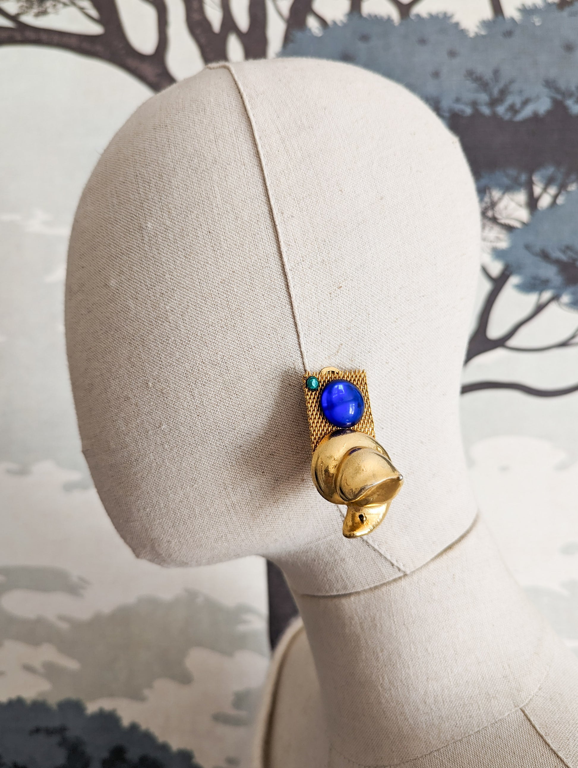 Elles sont en metal doré. Une plaque en maille est pavée d'un petit strass vert, d'un grand cabochon en verre bleu et d'une forme organique rappelant un coquillage. Ce coquillage est en résine métalisée.