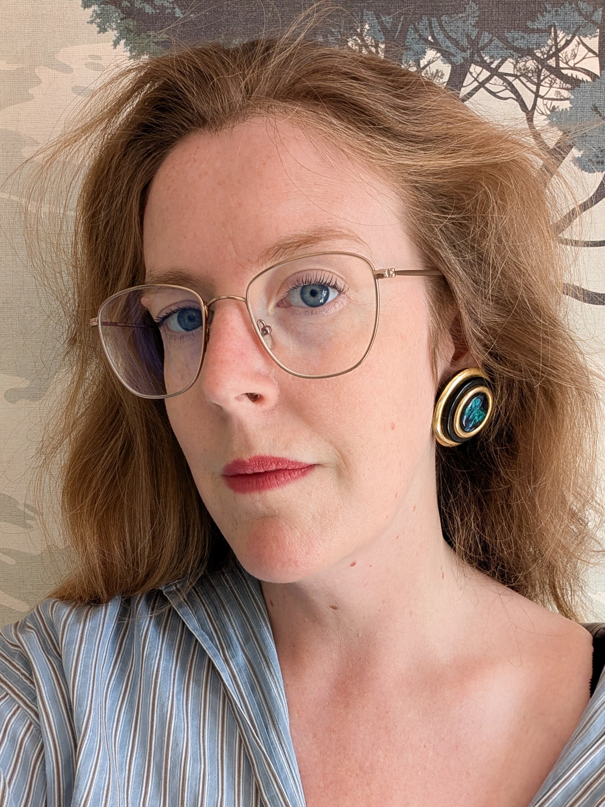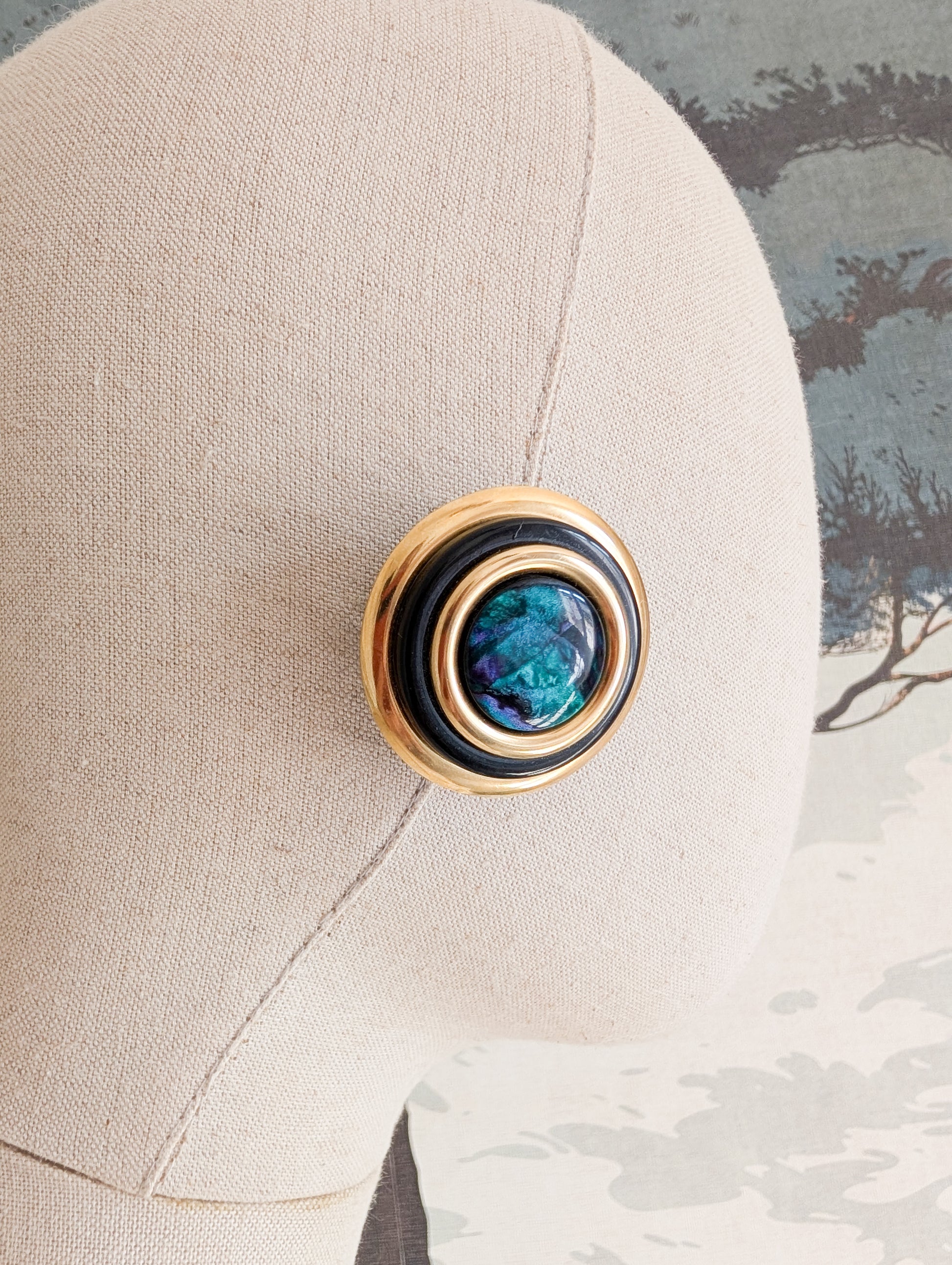 Les boucles sont en plastique et métal. Au centre, un cabochon en plastique irisé.