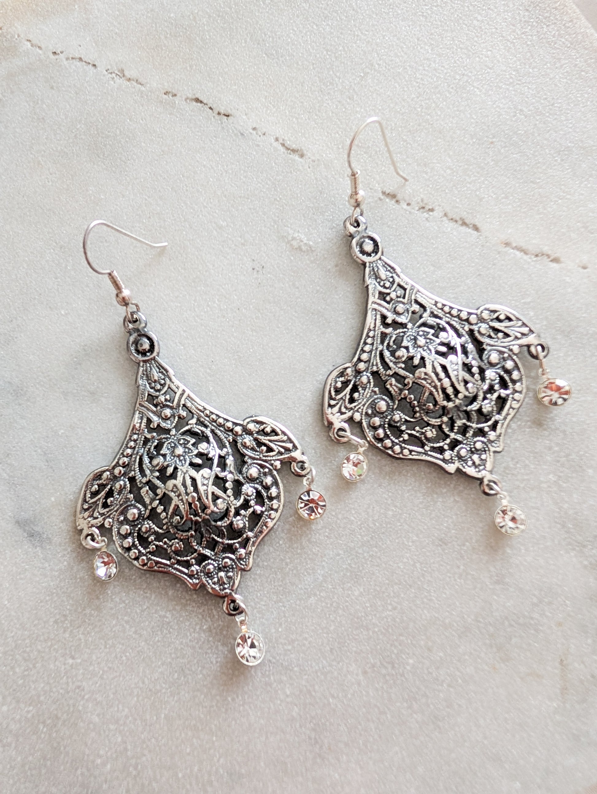 Les boucles sont en métal argenté et les pampilles en strass blancs.