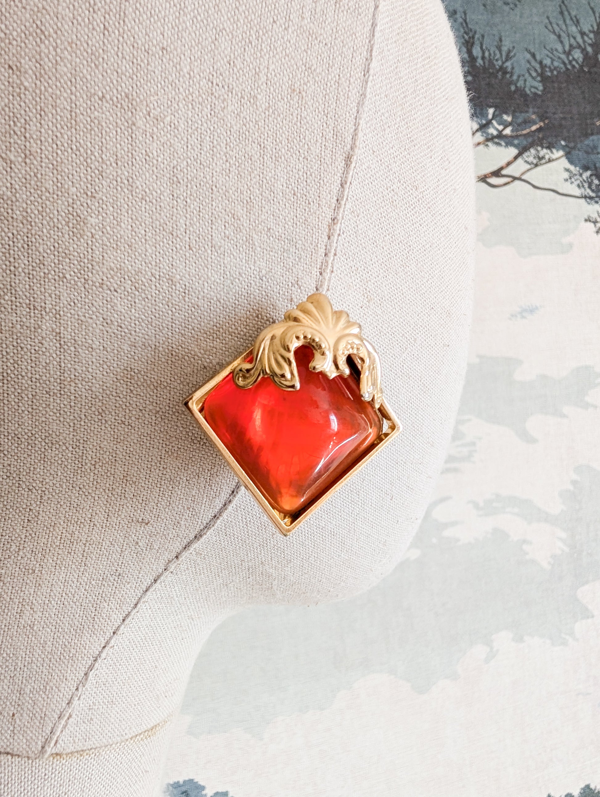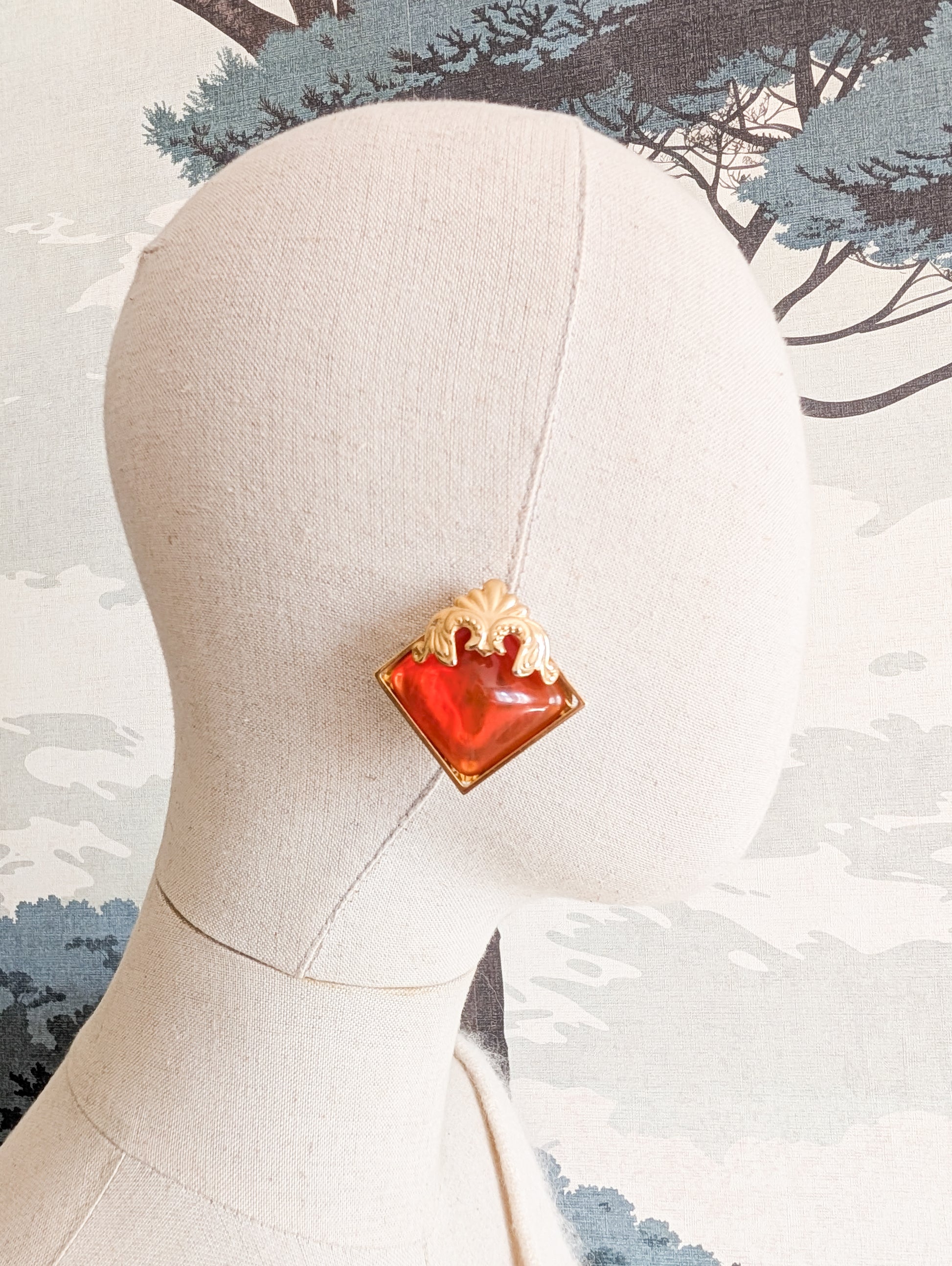 La monture est en métal doré. Elles sont pavées d'un grand cabochon en résine orange translucide.
