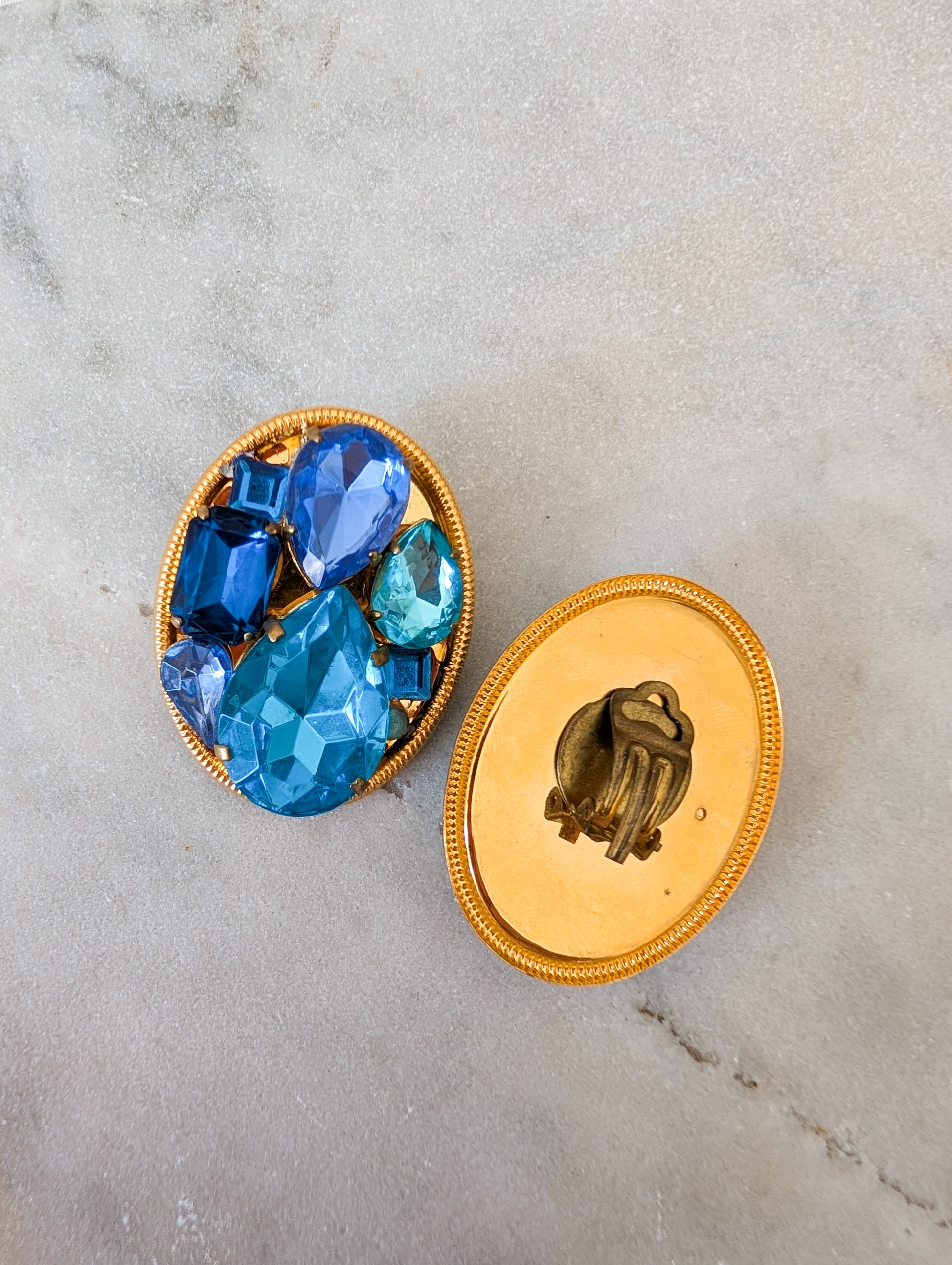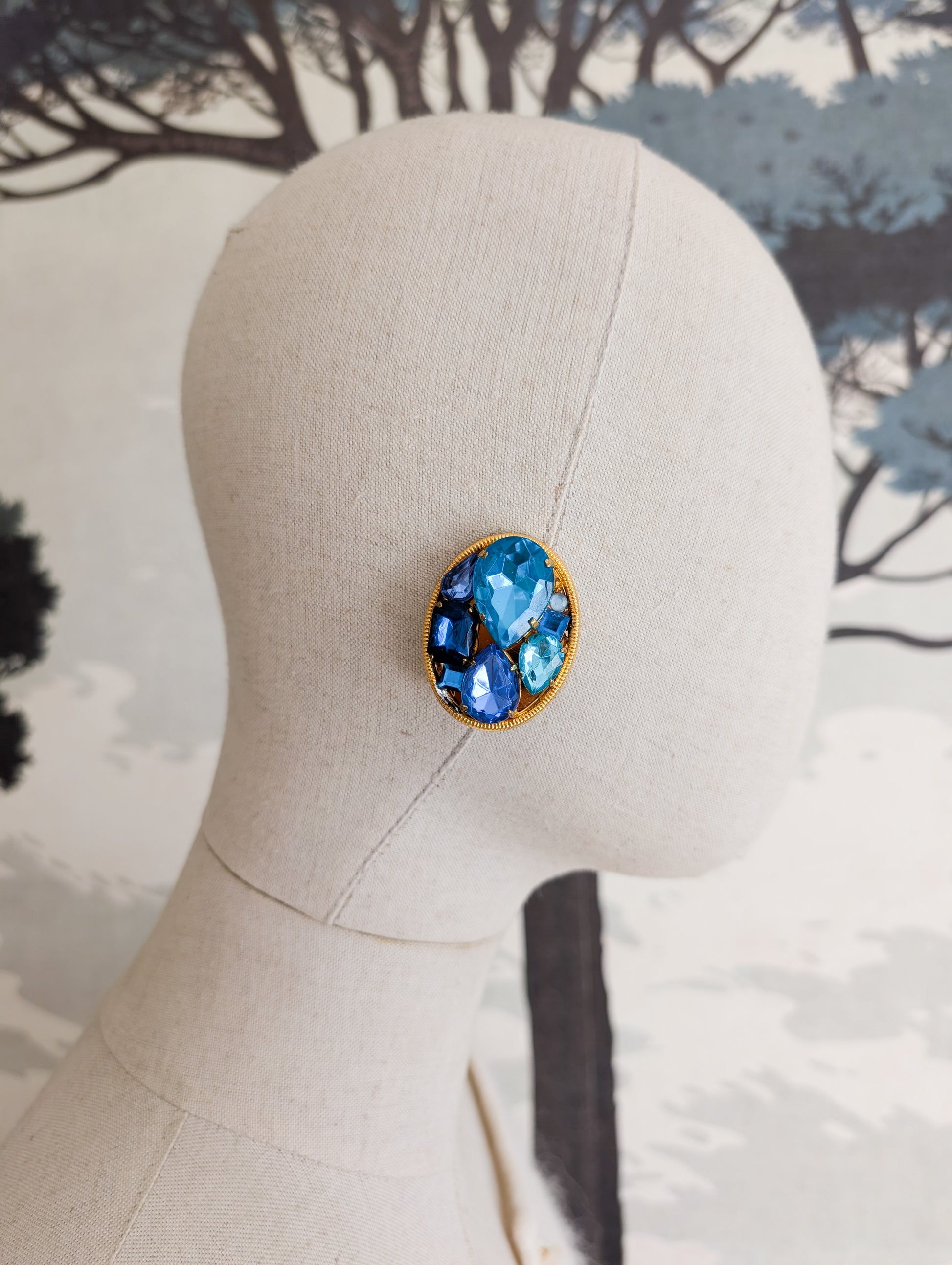 Les boucles sont en métal doré. Elles sont pavées de strzss et pierres en verre dans un camaïeu de bleus.