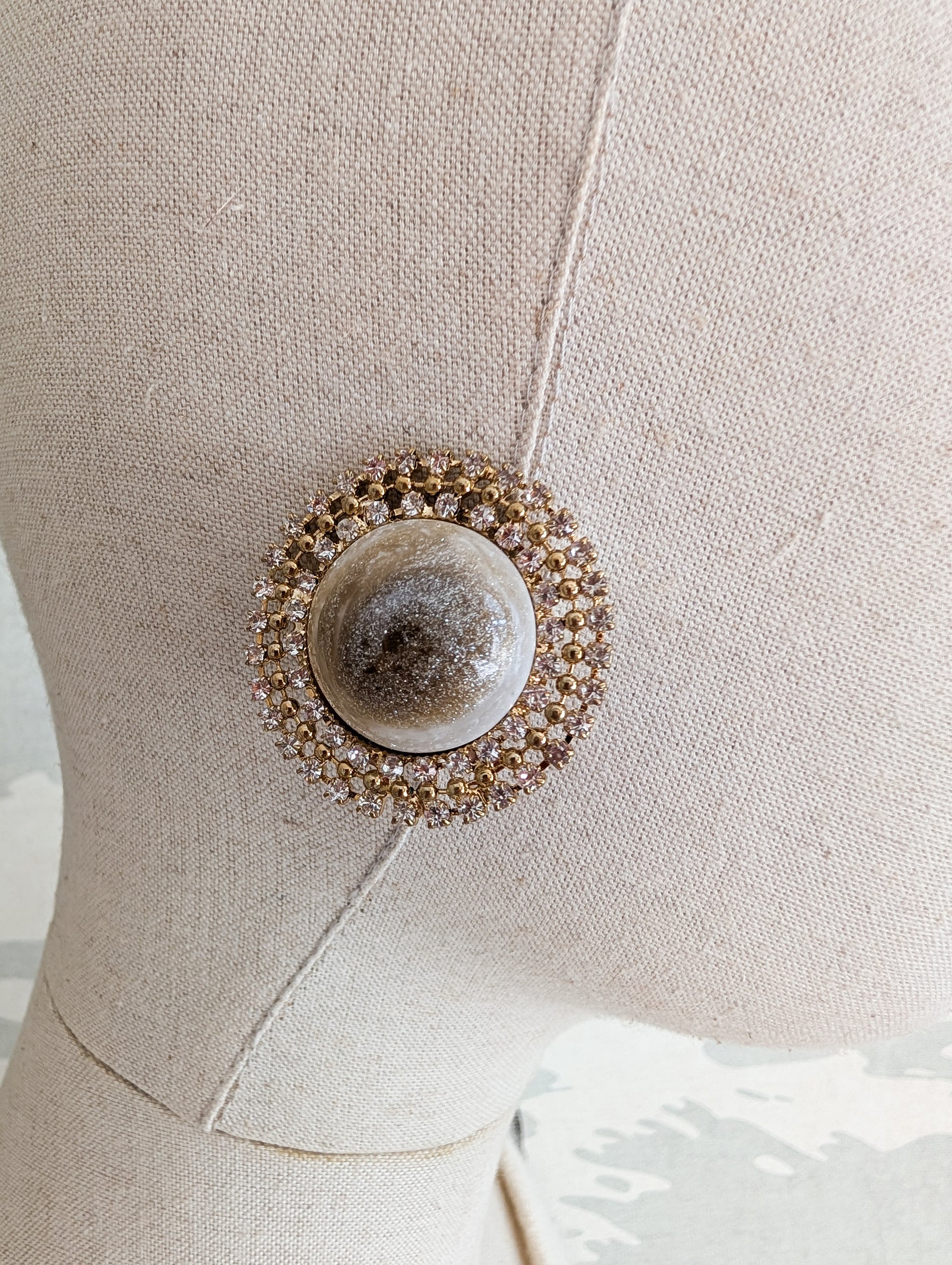 Les boucles sont en métal doré. Elles sont pavées de petits strass en verre et au centre un cabochon pailleté.