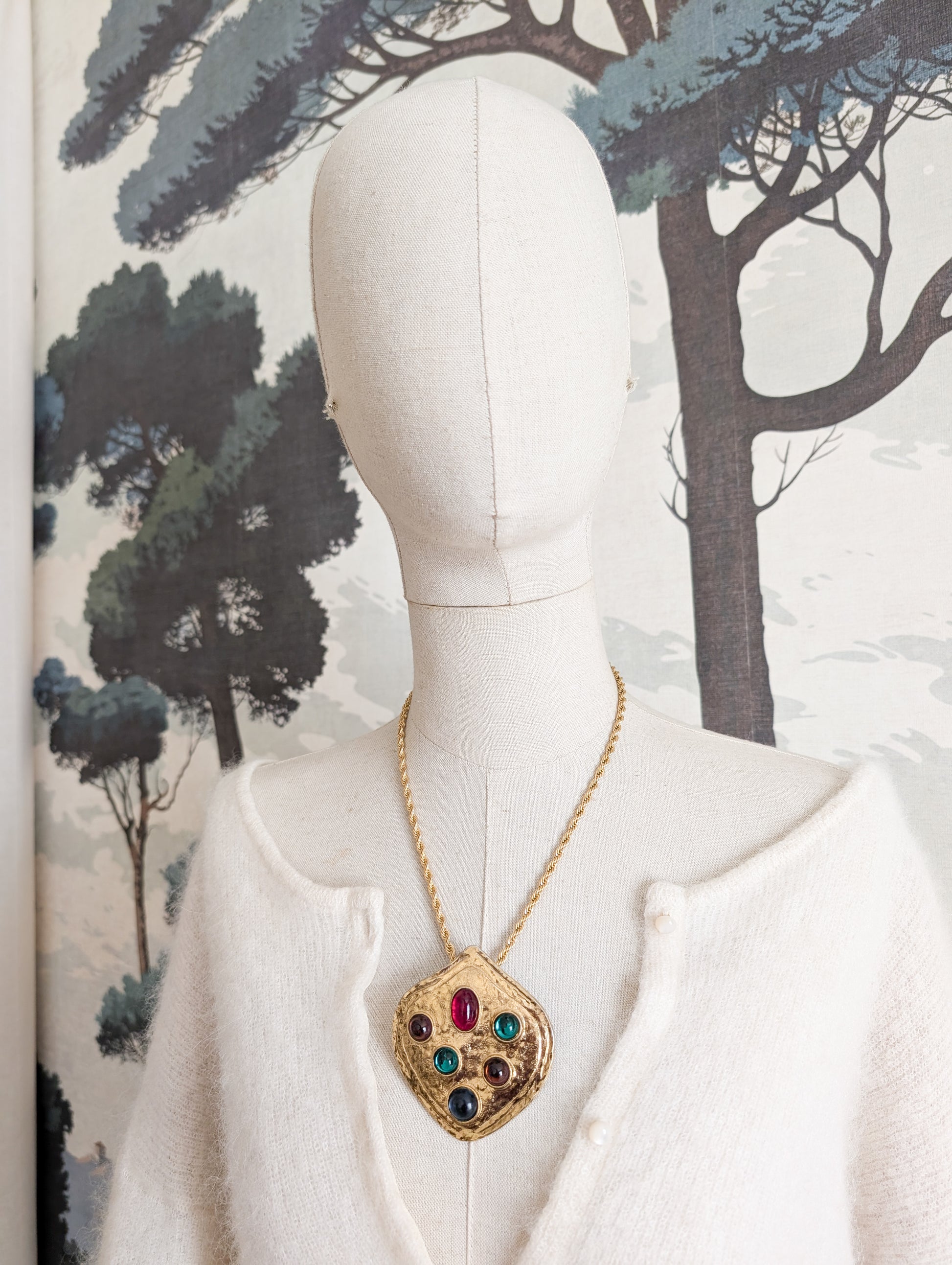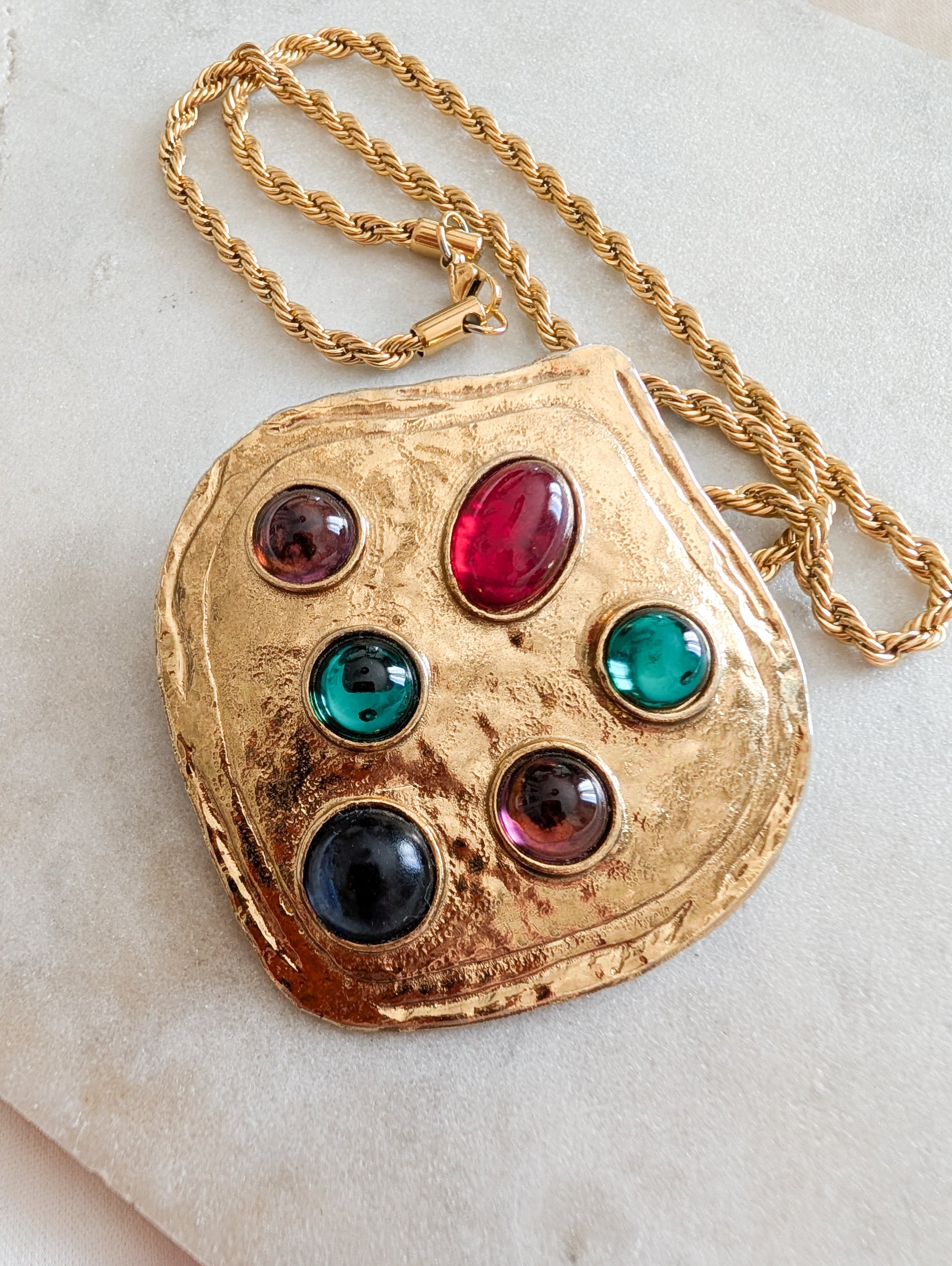 Le pendentif est en métal doré. Il présente d grands cabochons en pâte de verre style Gripoix.