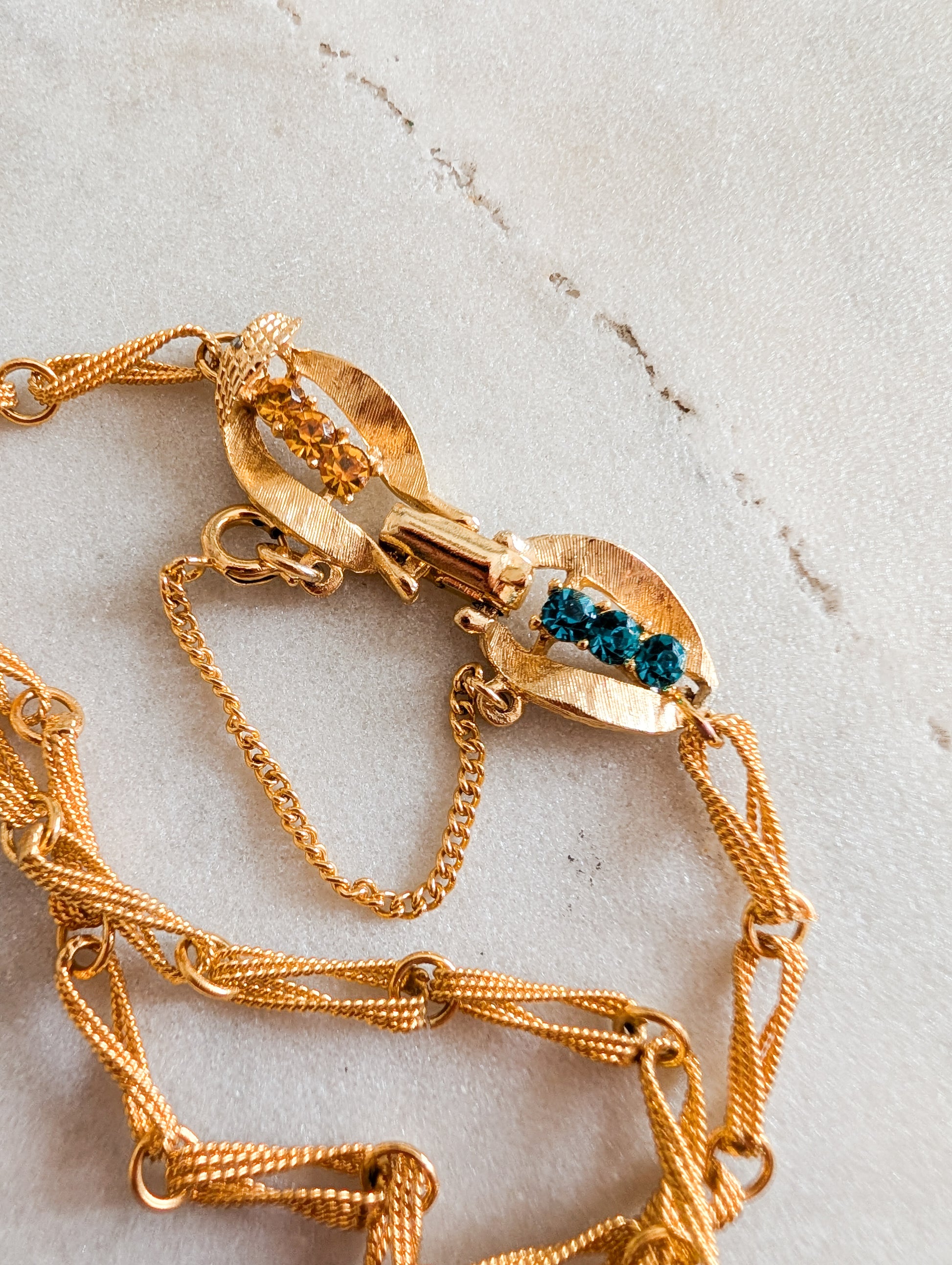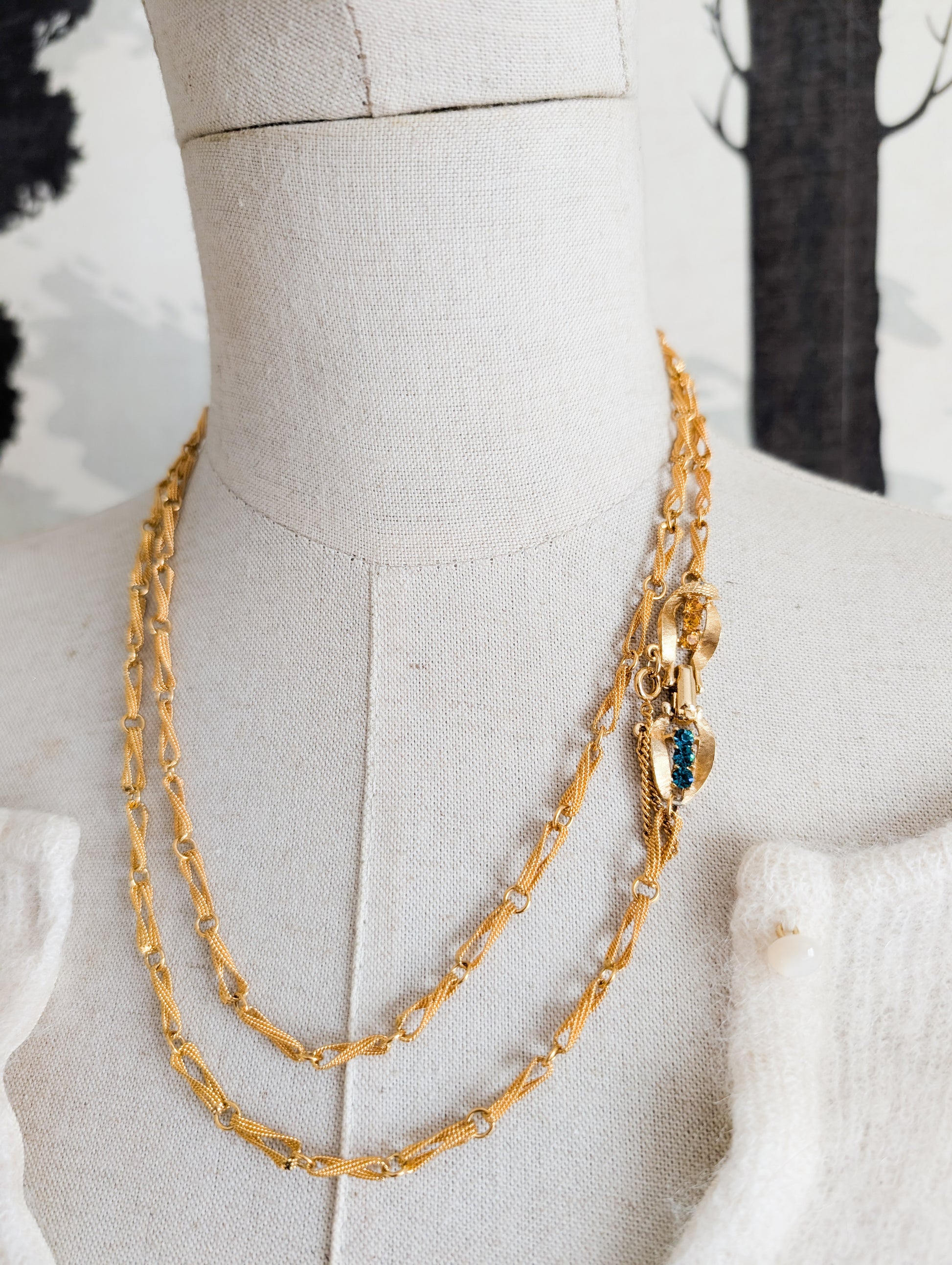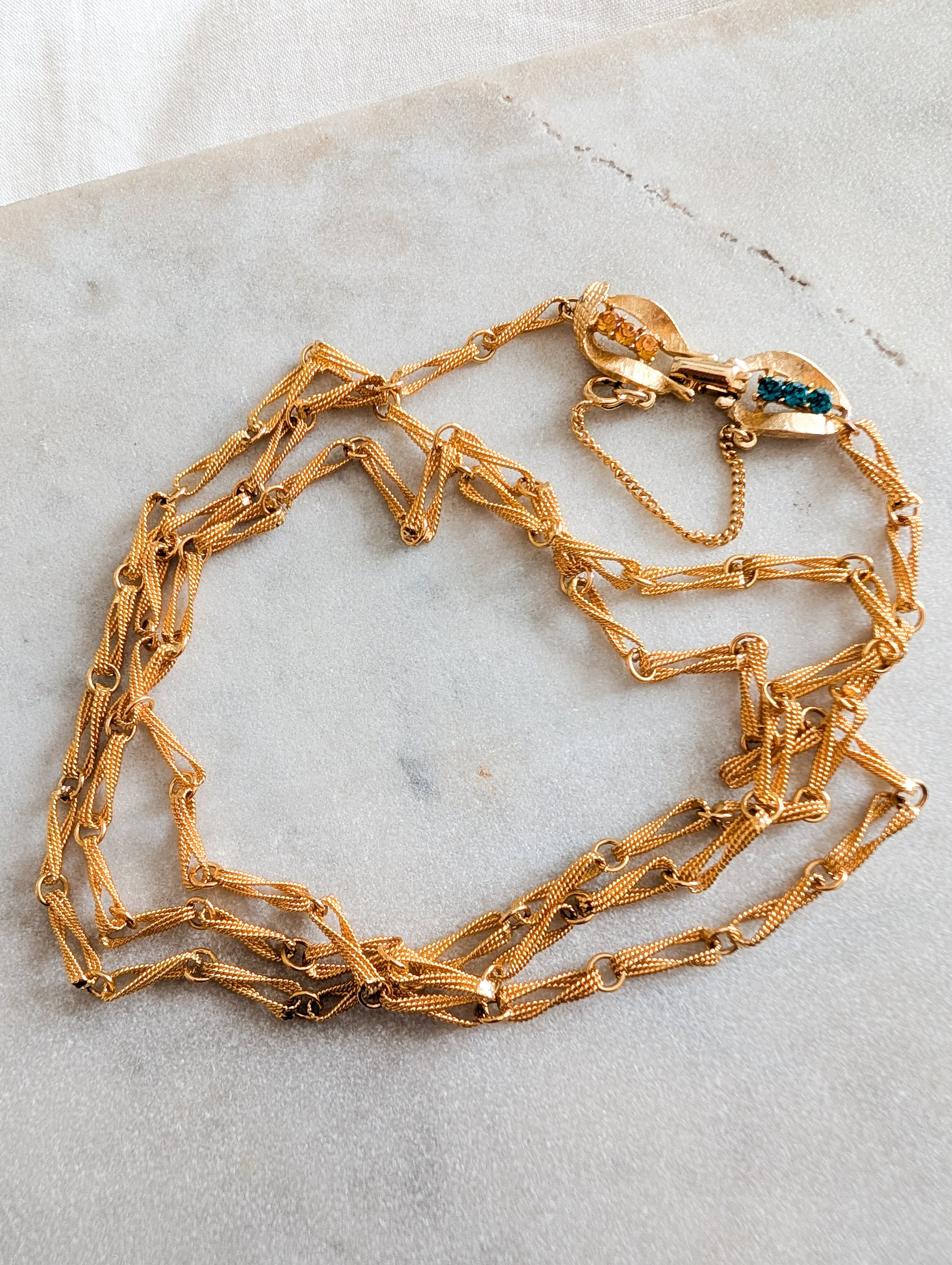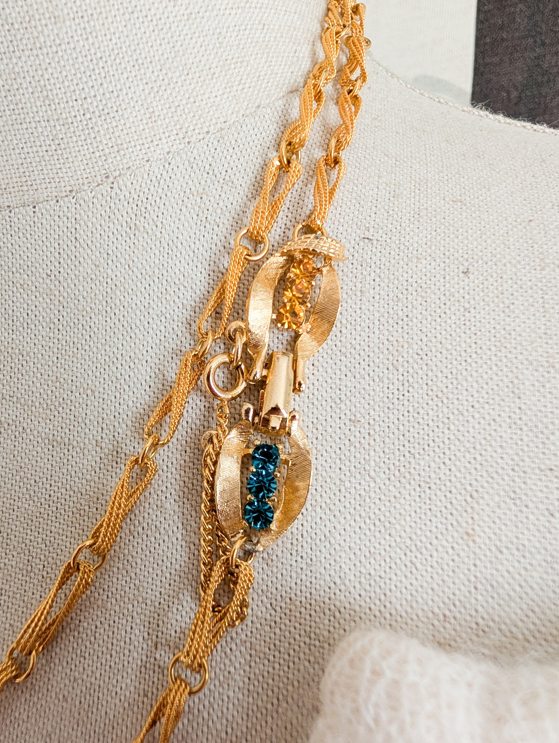 Le collier présente une très belle maille torsadée. Magnifique fermoir en métal doré pavé d'un côté de pierres en verre vert émeraude et de pierres jaune de l'autre côté.