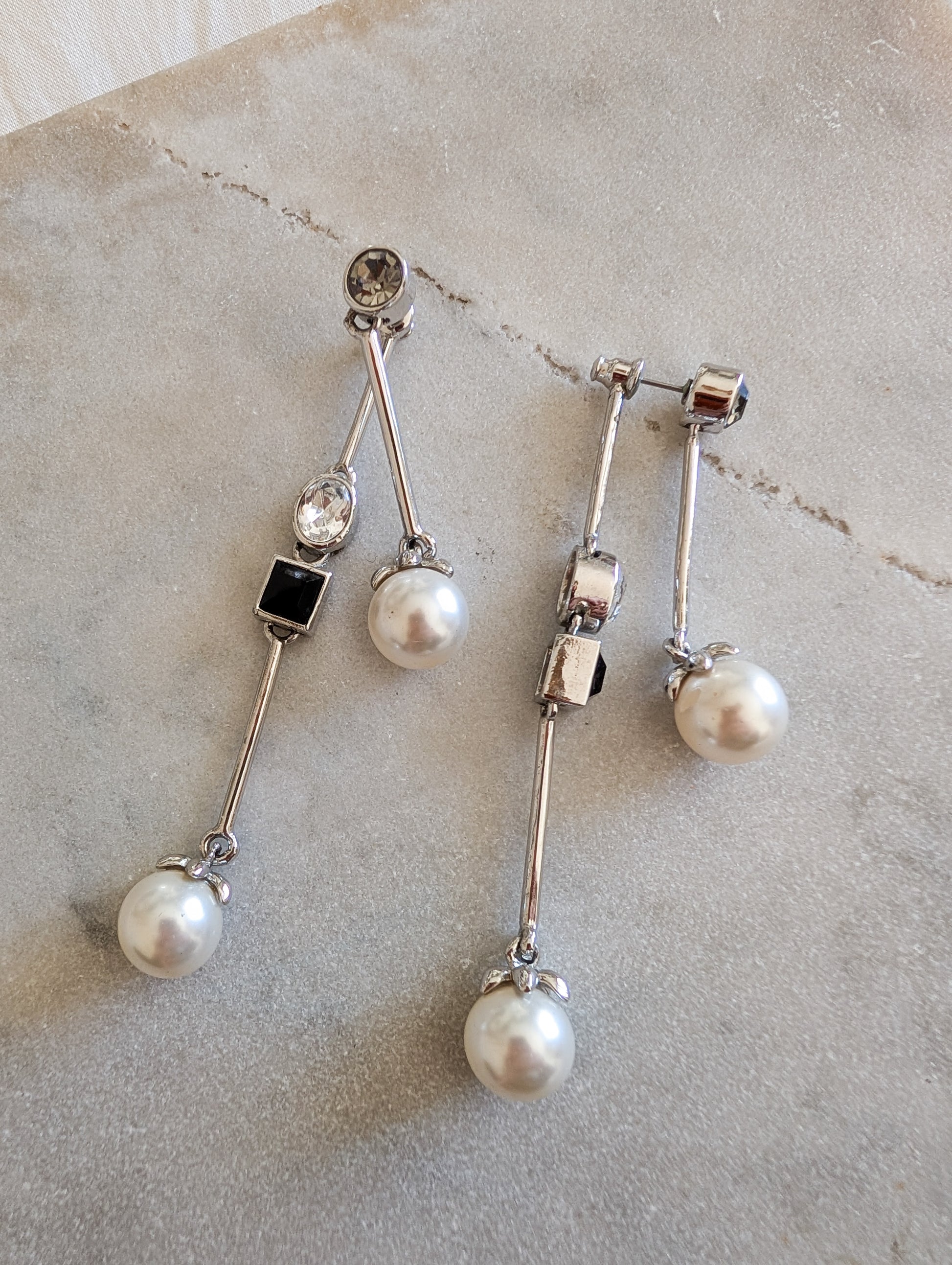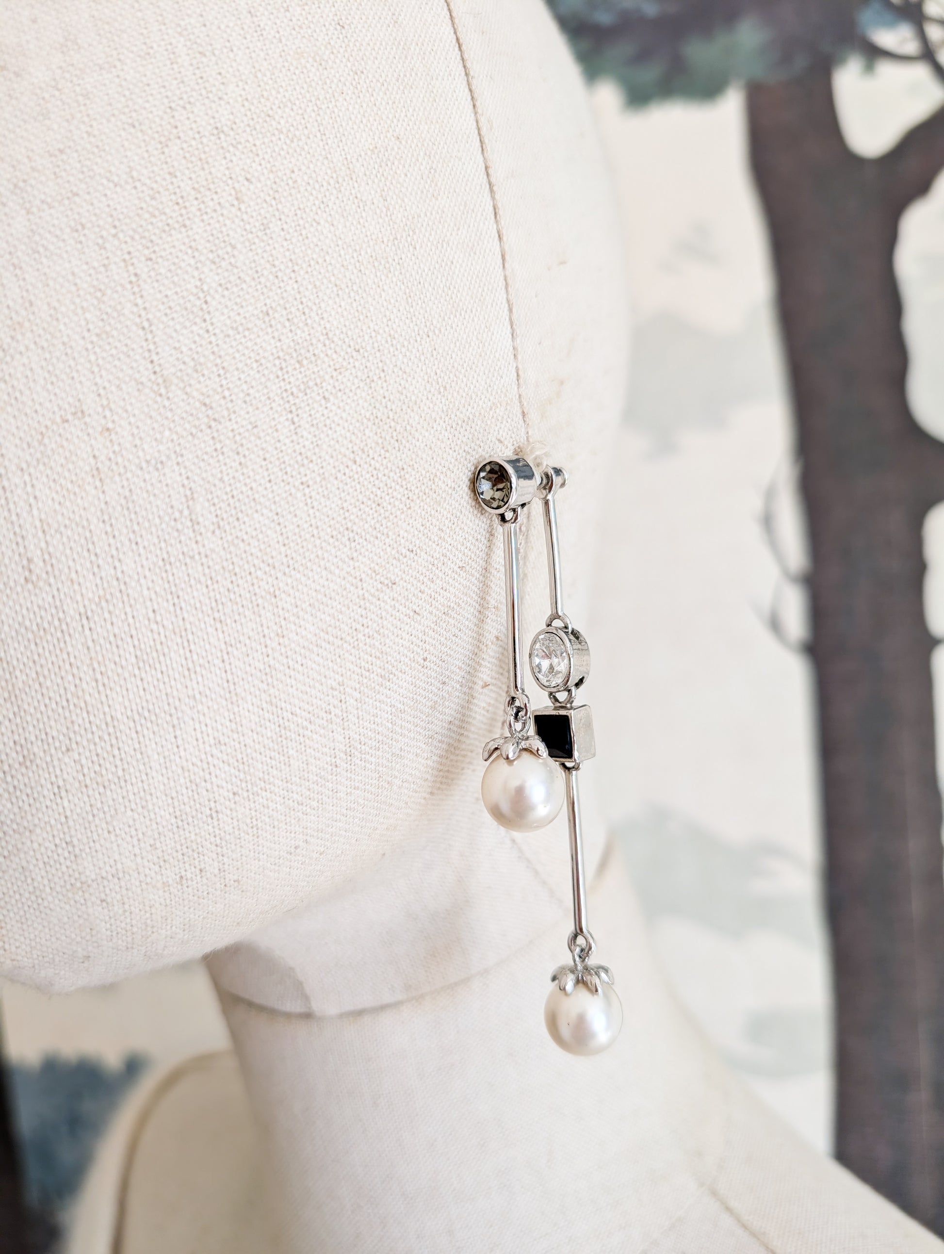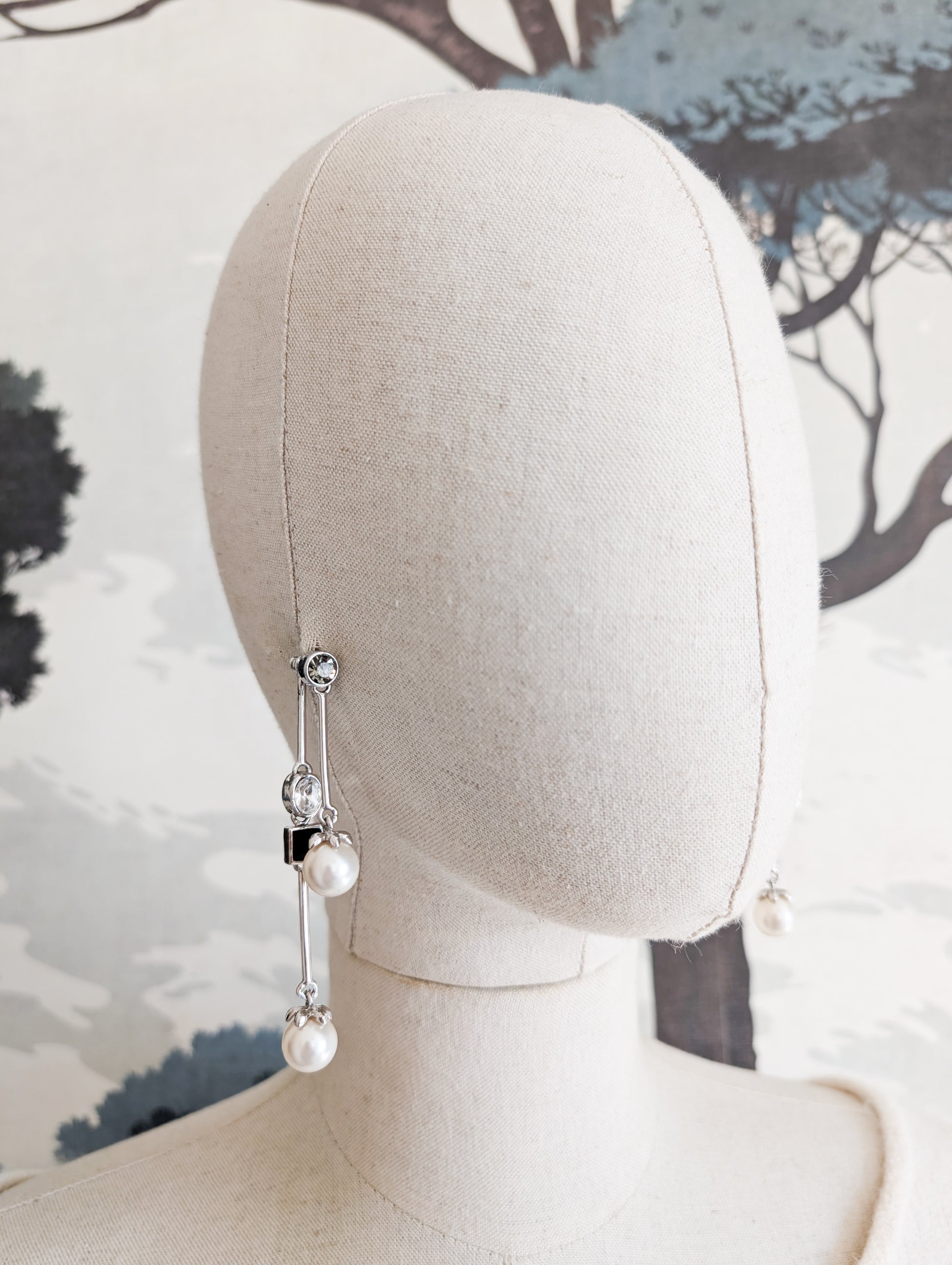 Les boucles sont en métal argenté. L'attache porte elle aussi une tige avec des perles. Celle ci apparaît derrière l'oreille. Absolument divin!