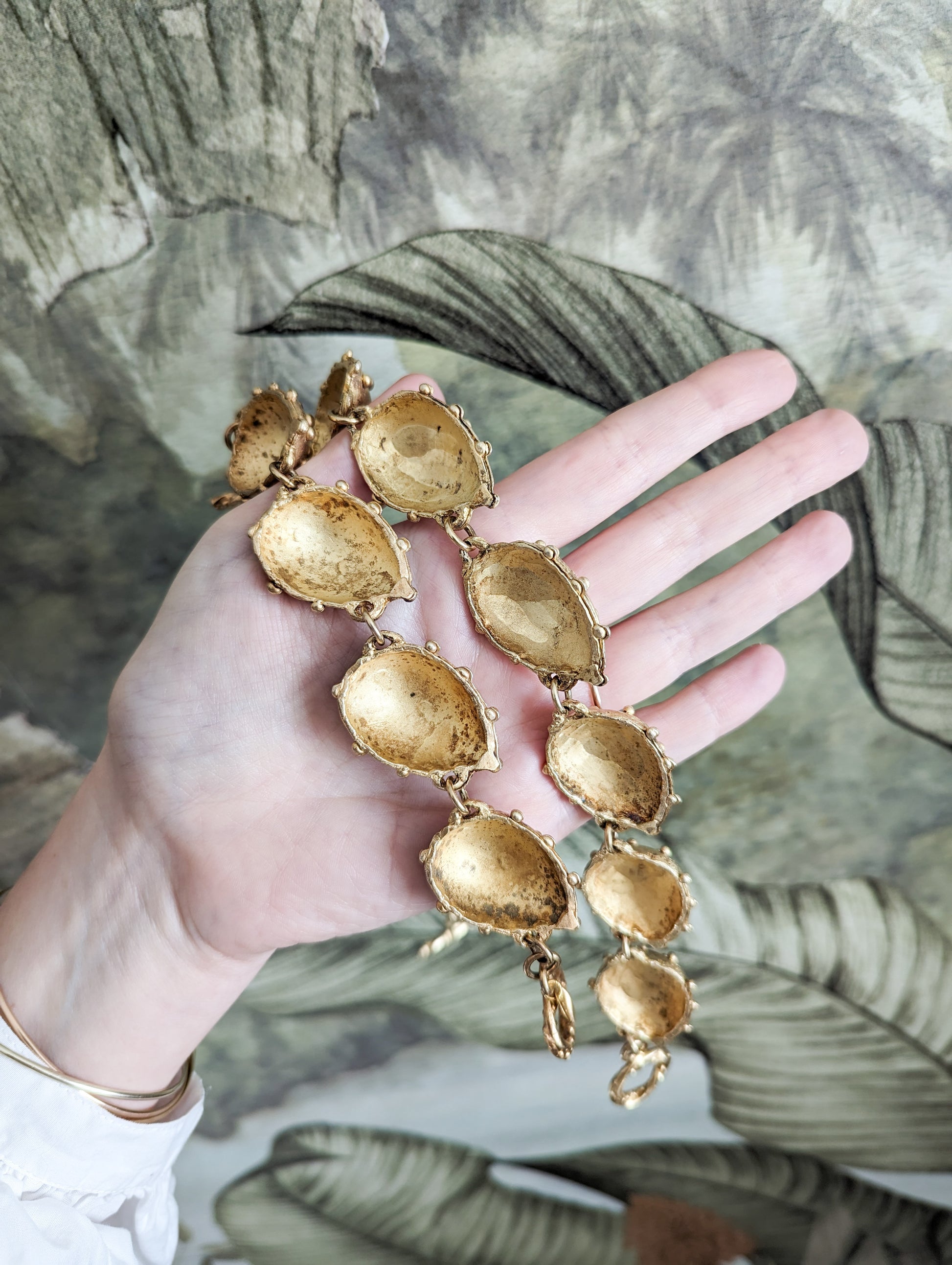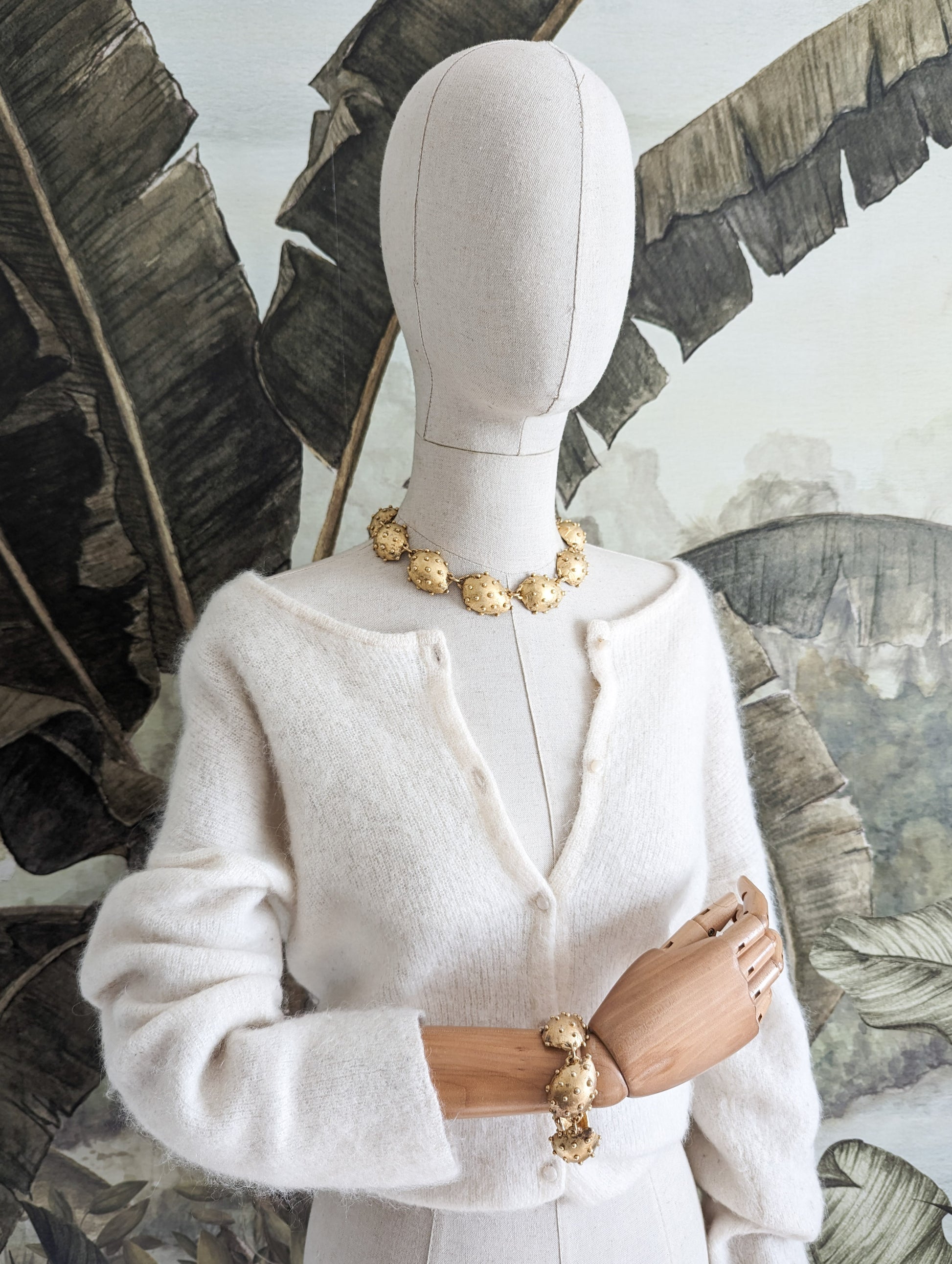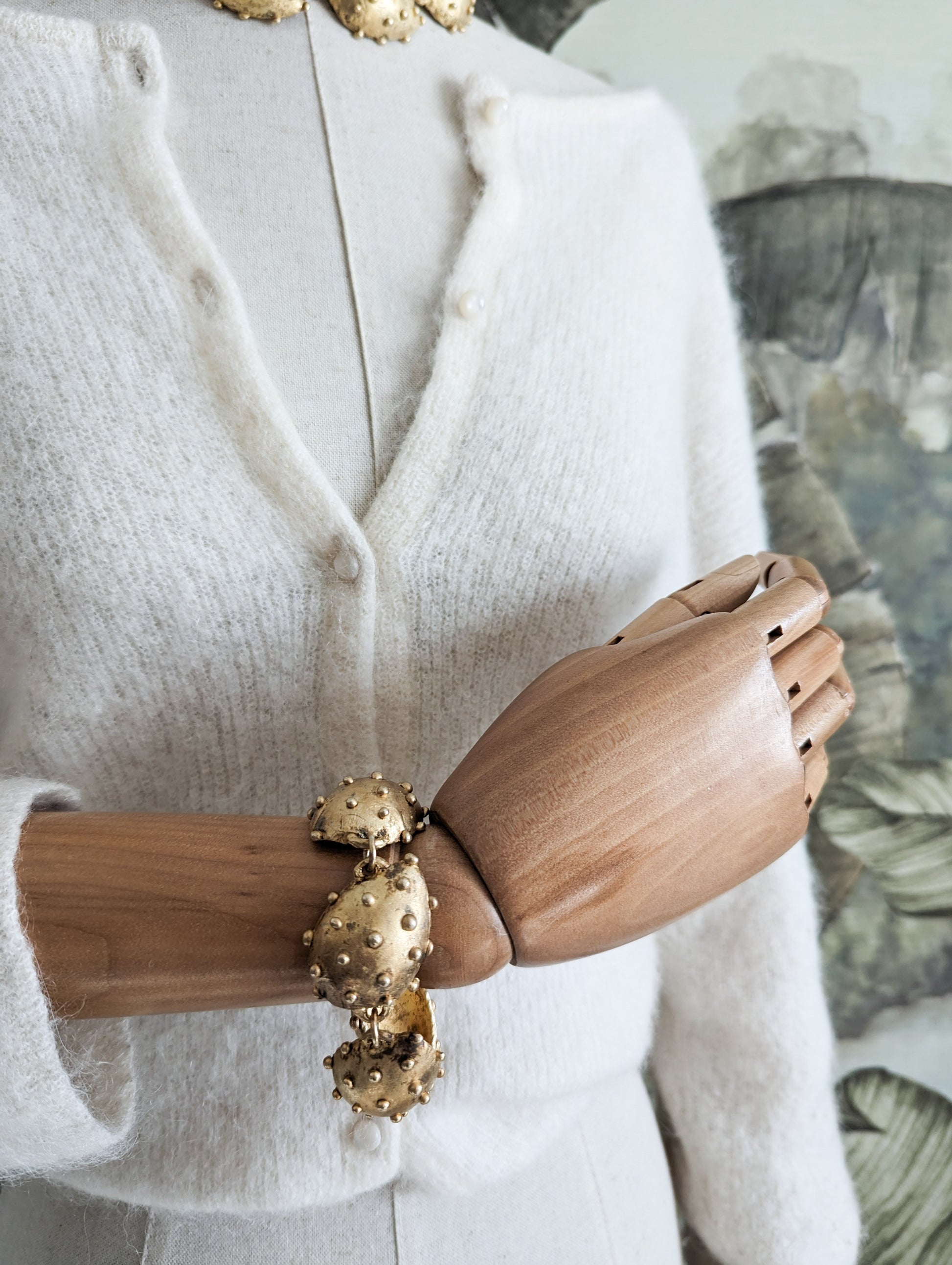 Les bijoux sont en metal doré mat. Le métal est travaillé avec un aspect brut, très sculptural. La patine est d'époque.