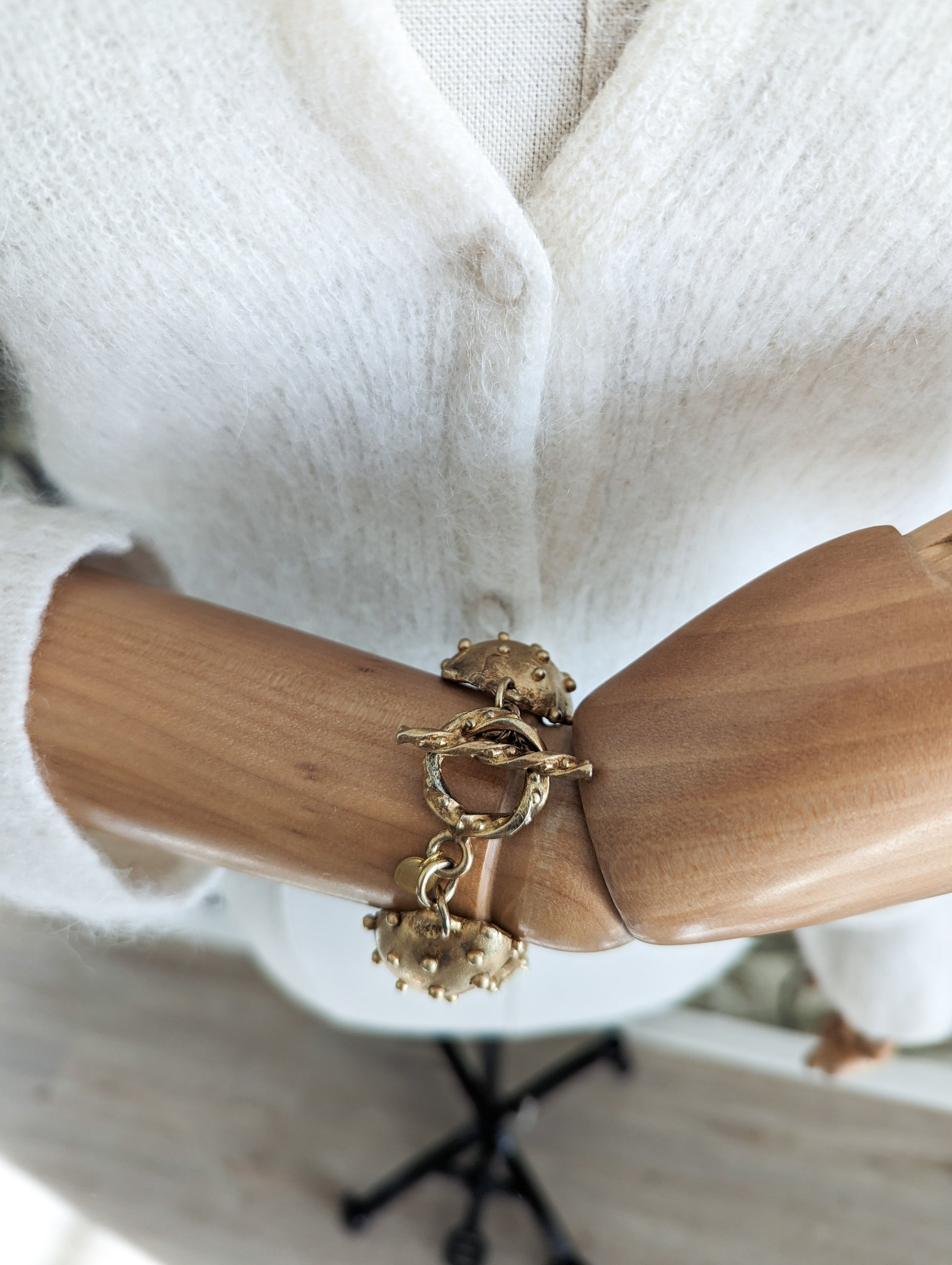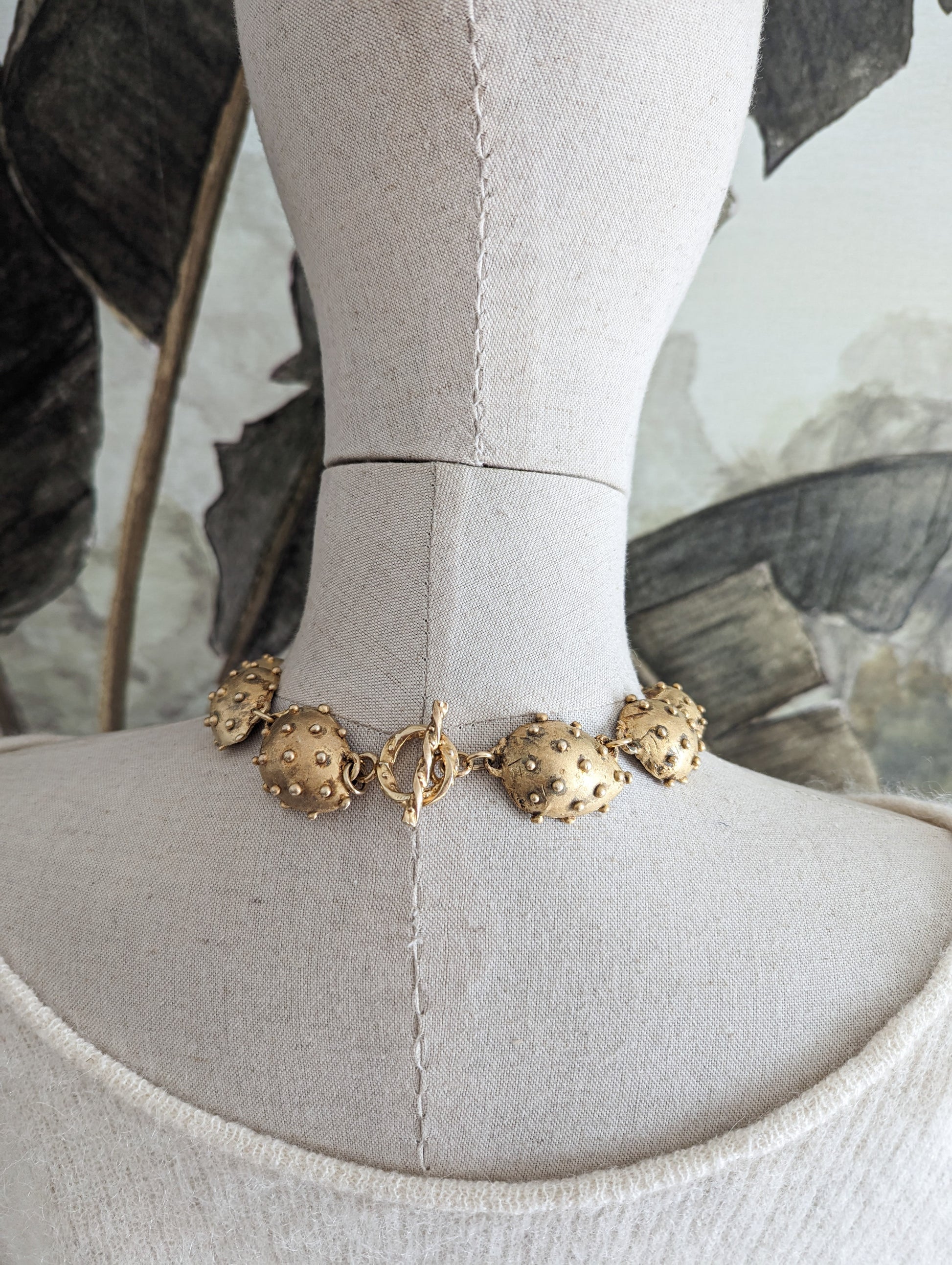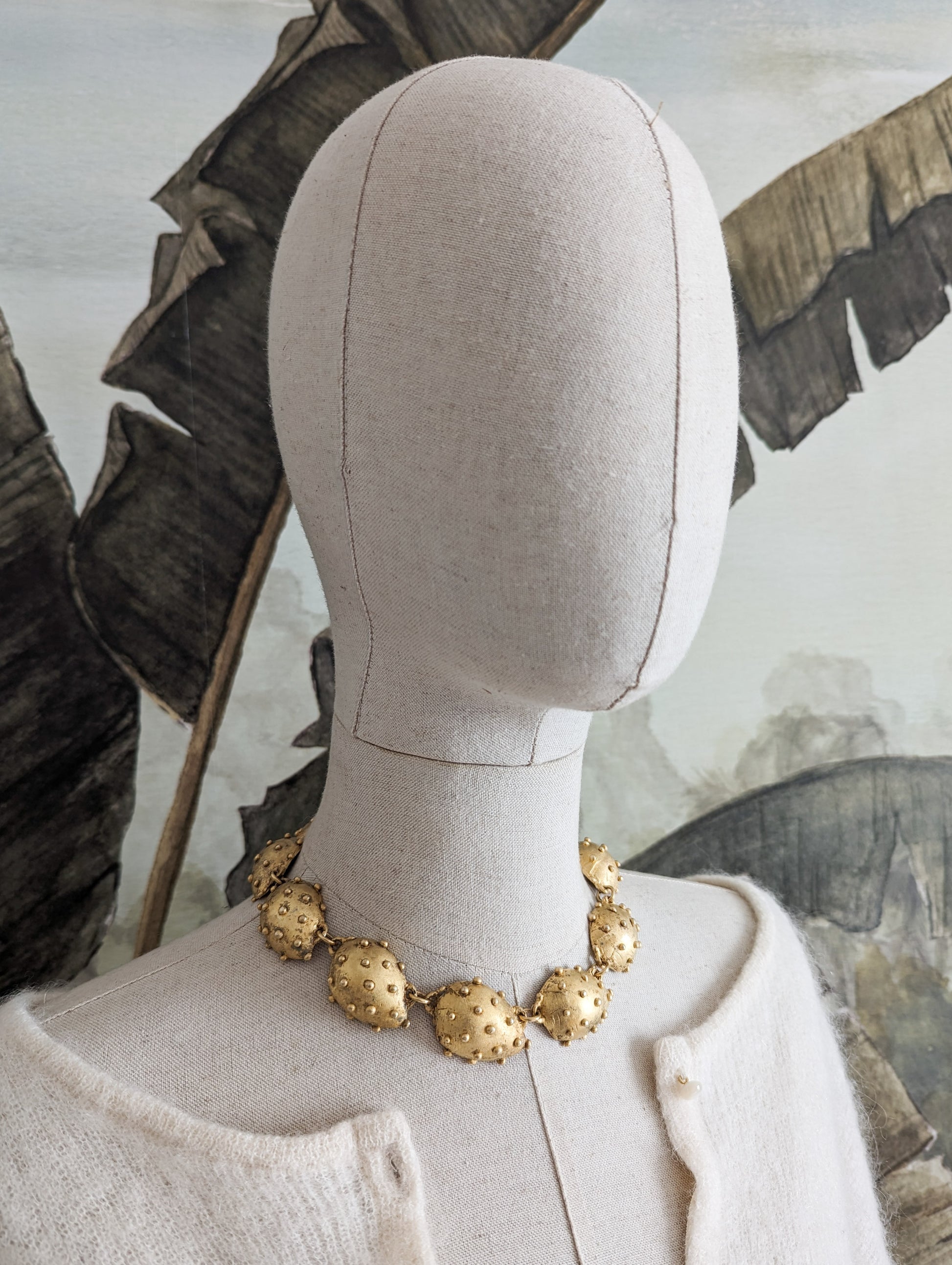 Les bijoux sont en metal doré mat. Le métal est travaillé avec un aspect brut, très sculptural. La patine est d'époque.