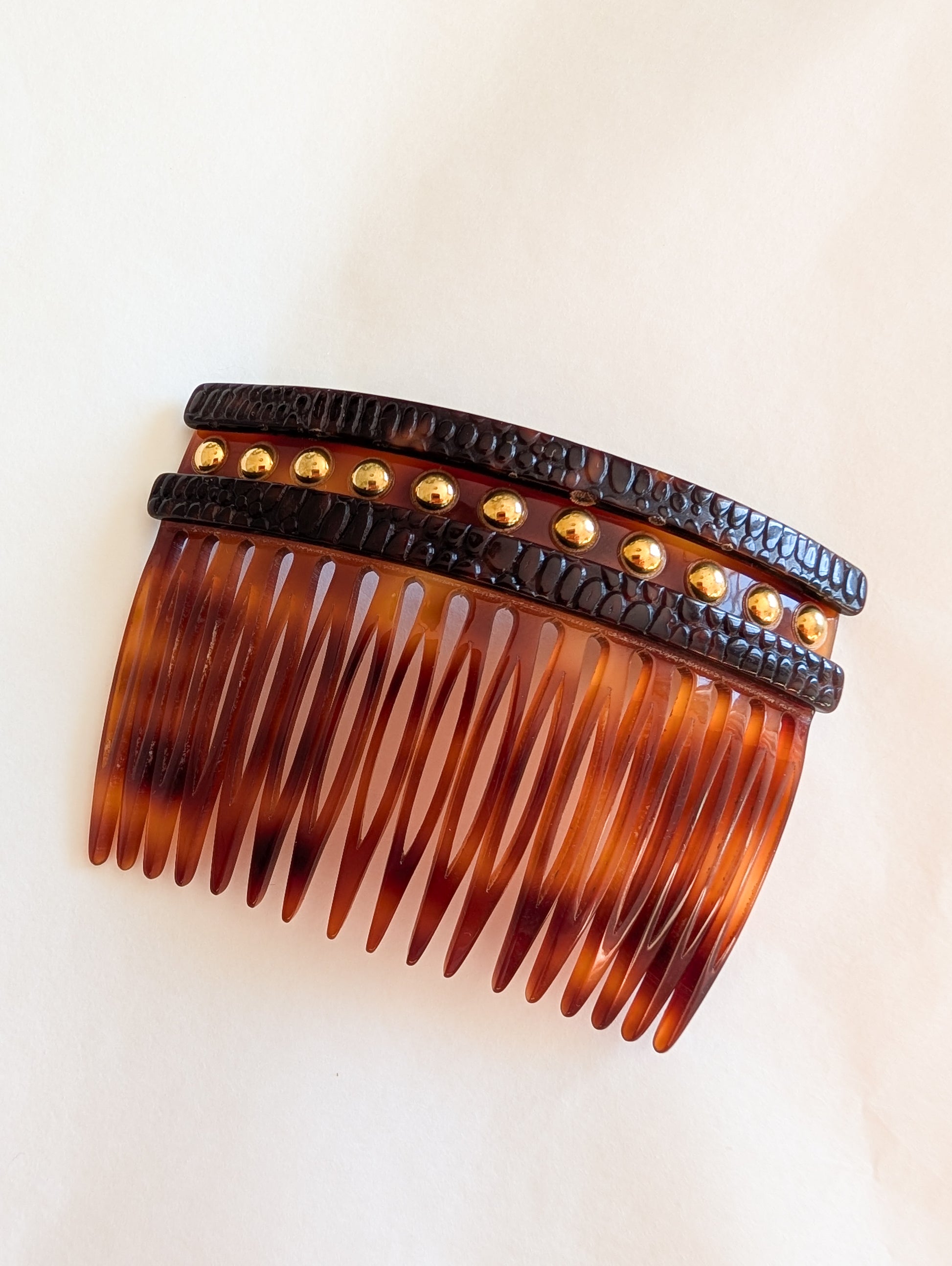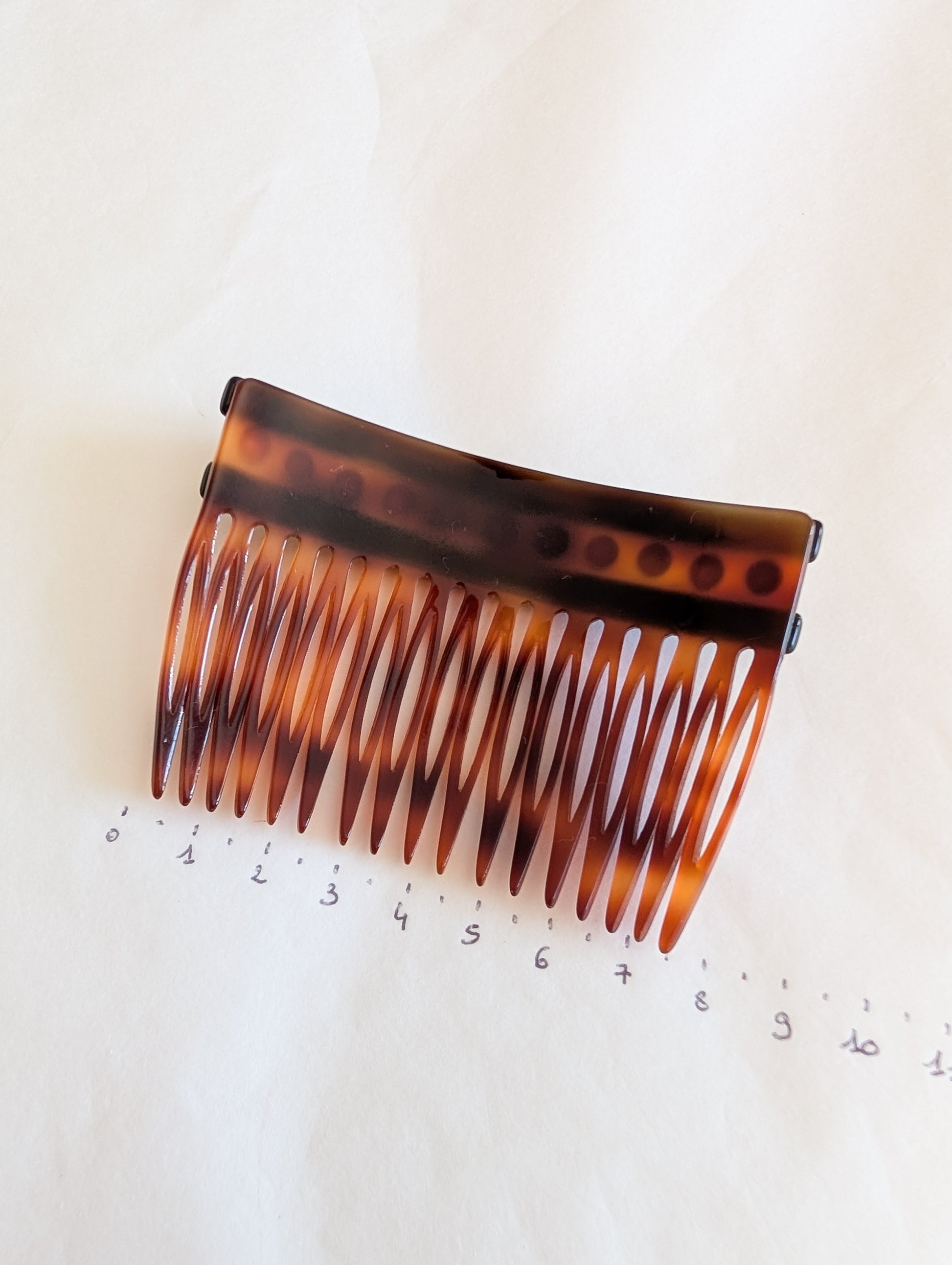 La pièce provient du stock d'un atelier de fabrication de barrettes et bijoux de cheveux situé dans le Jura. Le Jura est le berceau de l'industrie du plastique français. On y fabrique des pièces de très grande qualité.