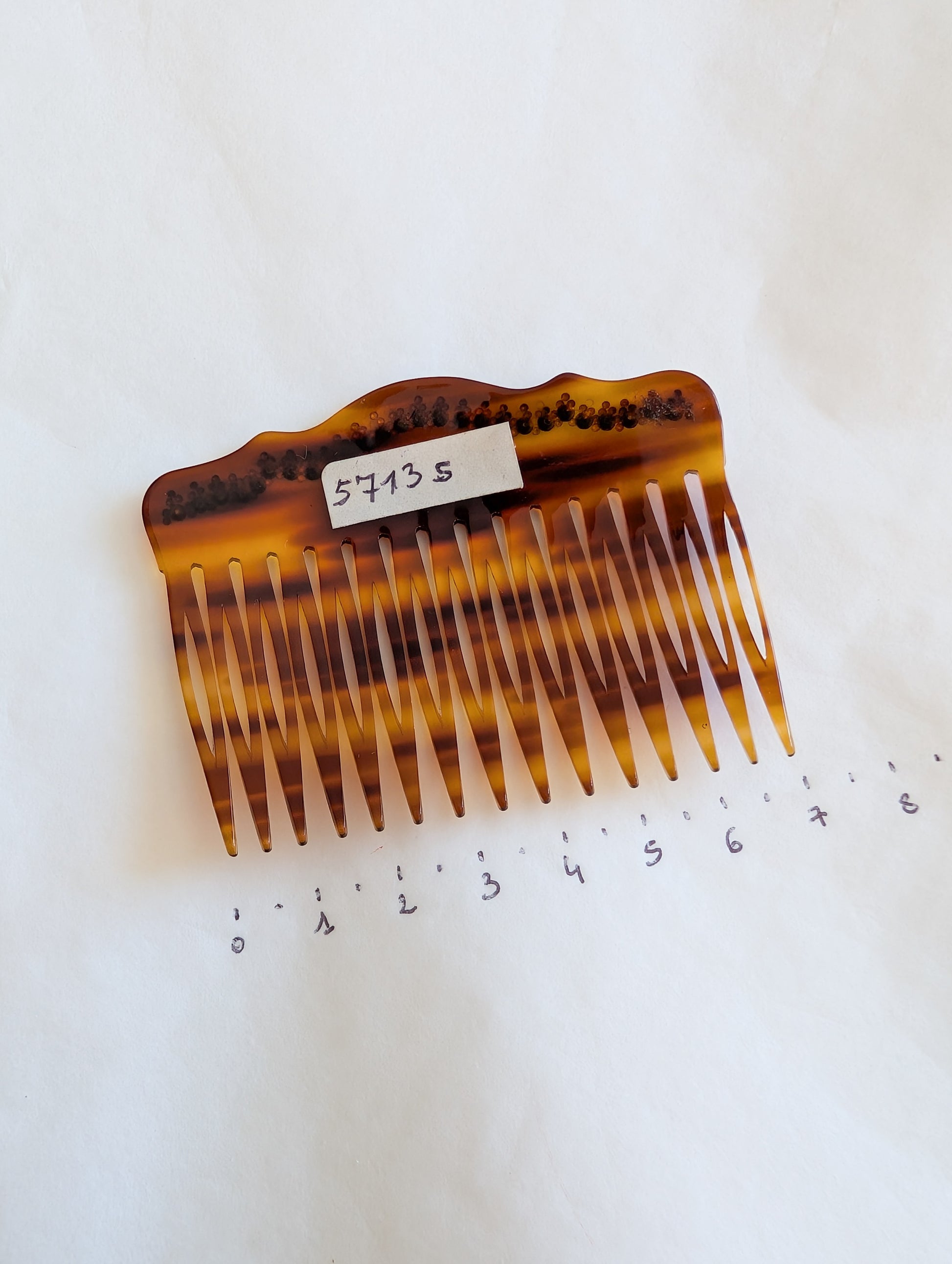 La pièce provient du stock d'un atelier de fabrication de barrettes et bijoux de cheveux situé dans le Jura. Le Jura est le berceau de l'industrie du plastique français. On y fabrique des pièces de très grande qualité.