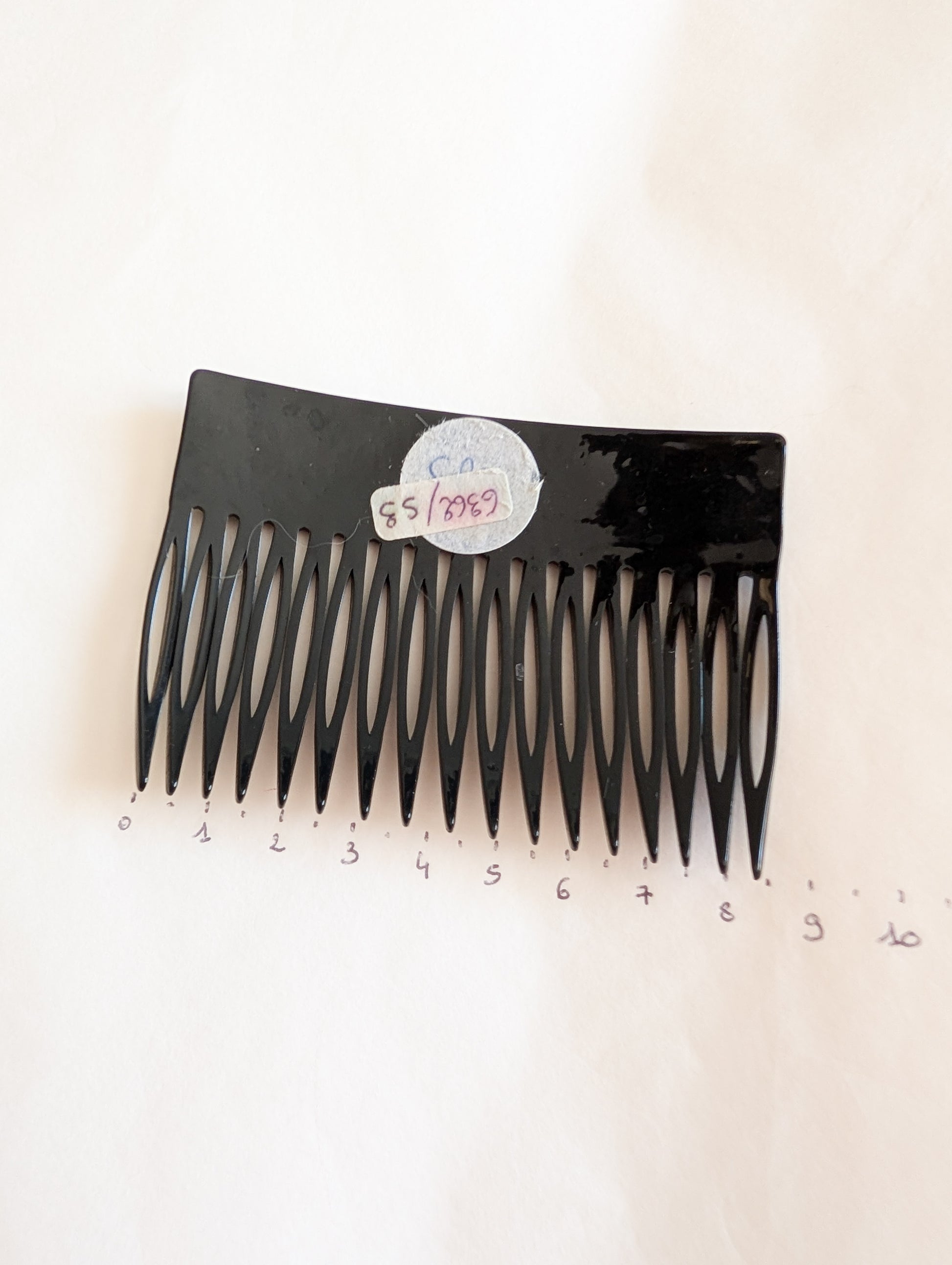 La pièce provient du stock d'un atelier de fabrication de barrettes et bijoux de cheveux situé dans le Jura. Le Jura est le berceau de l'industrie du plastique français. On y fabrique des pièces de très grande qualité.