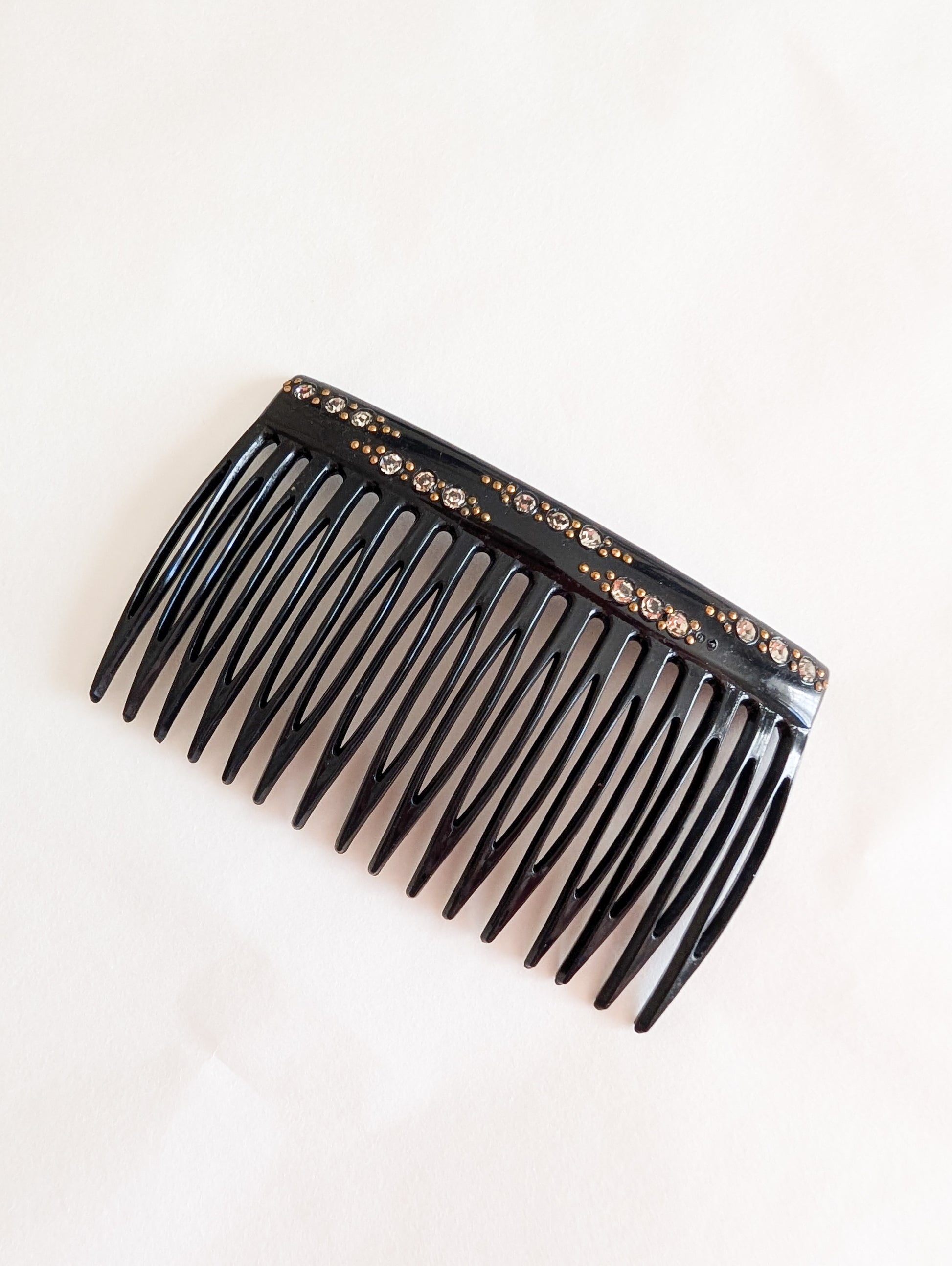 La pièce provient du stock d'un atelier de fabrication de barrettes et bijoux de cheveux situé dans le Jura. Le Jura est le berceau de l'industrie du plastique français. On y fabrique des pièces de très grande qualité.