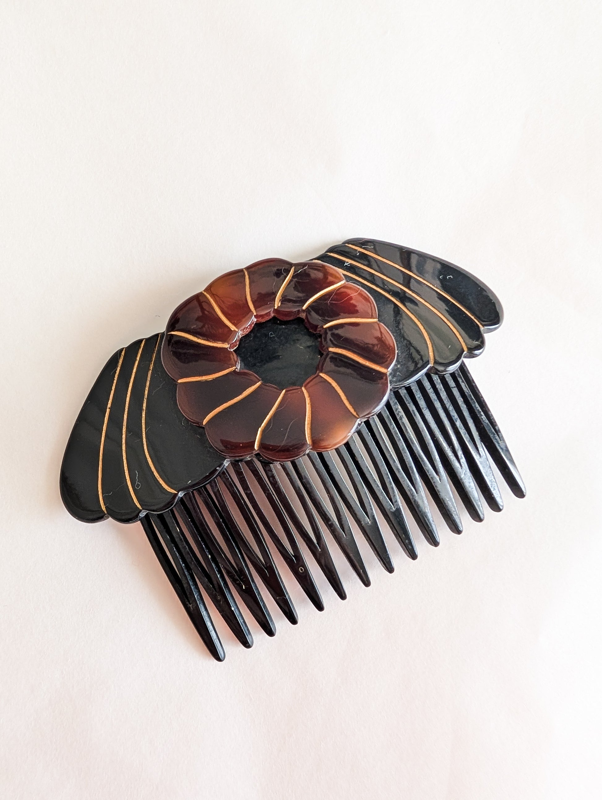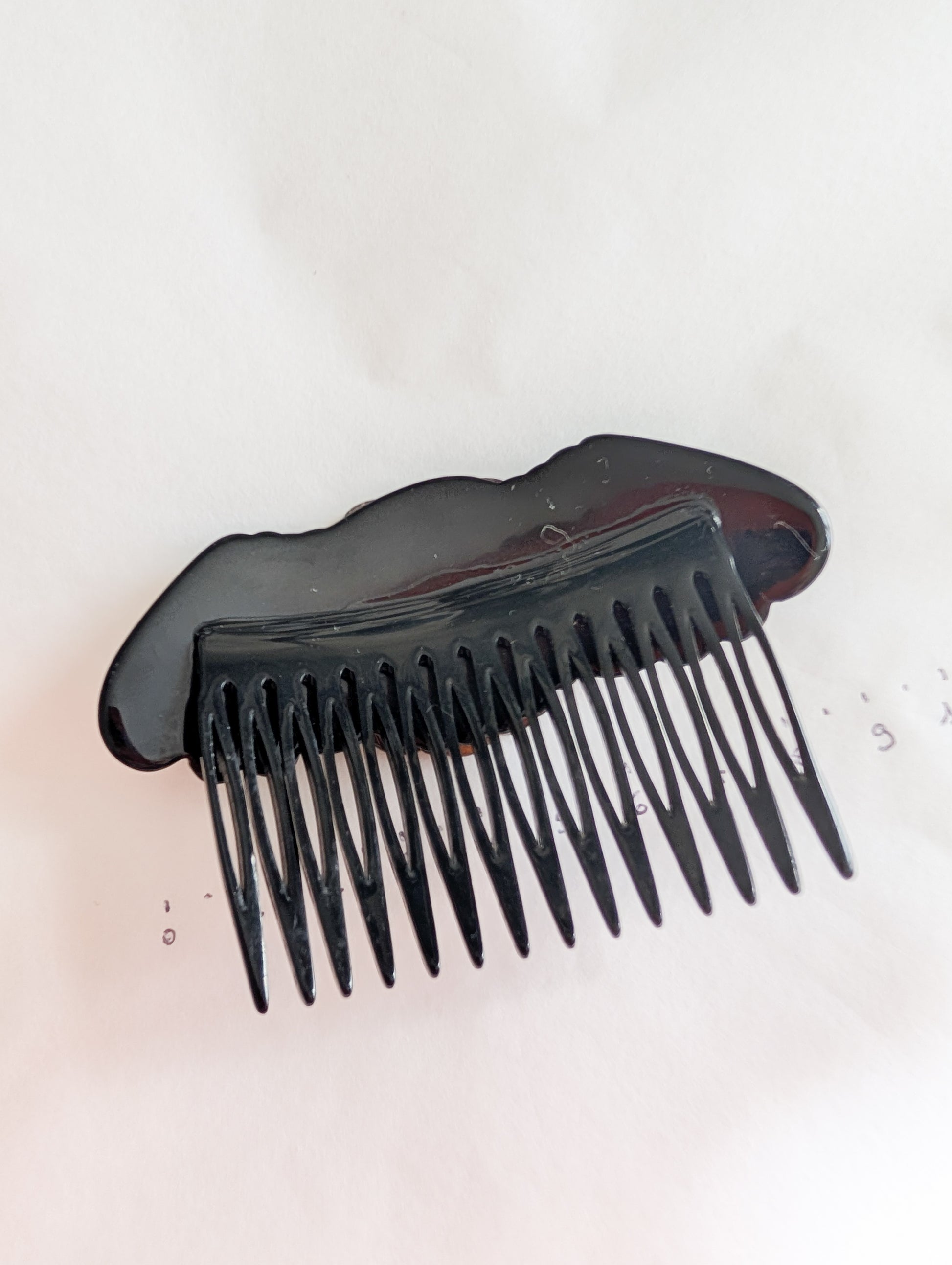 La pièce provient du stock d'un atelier de fabrication de barrettes et bijoux de cheveux situé dans le Jura. Le Jura est le berceau de l'industrie du plastique français. On y fabrique des pièces de très grande qualité.