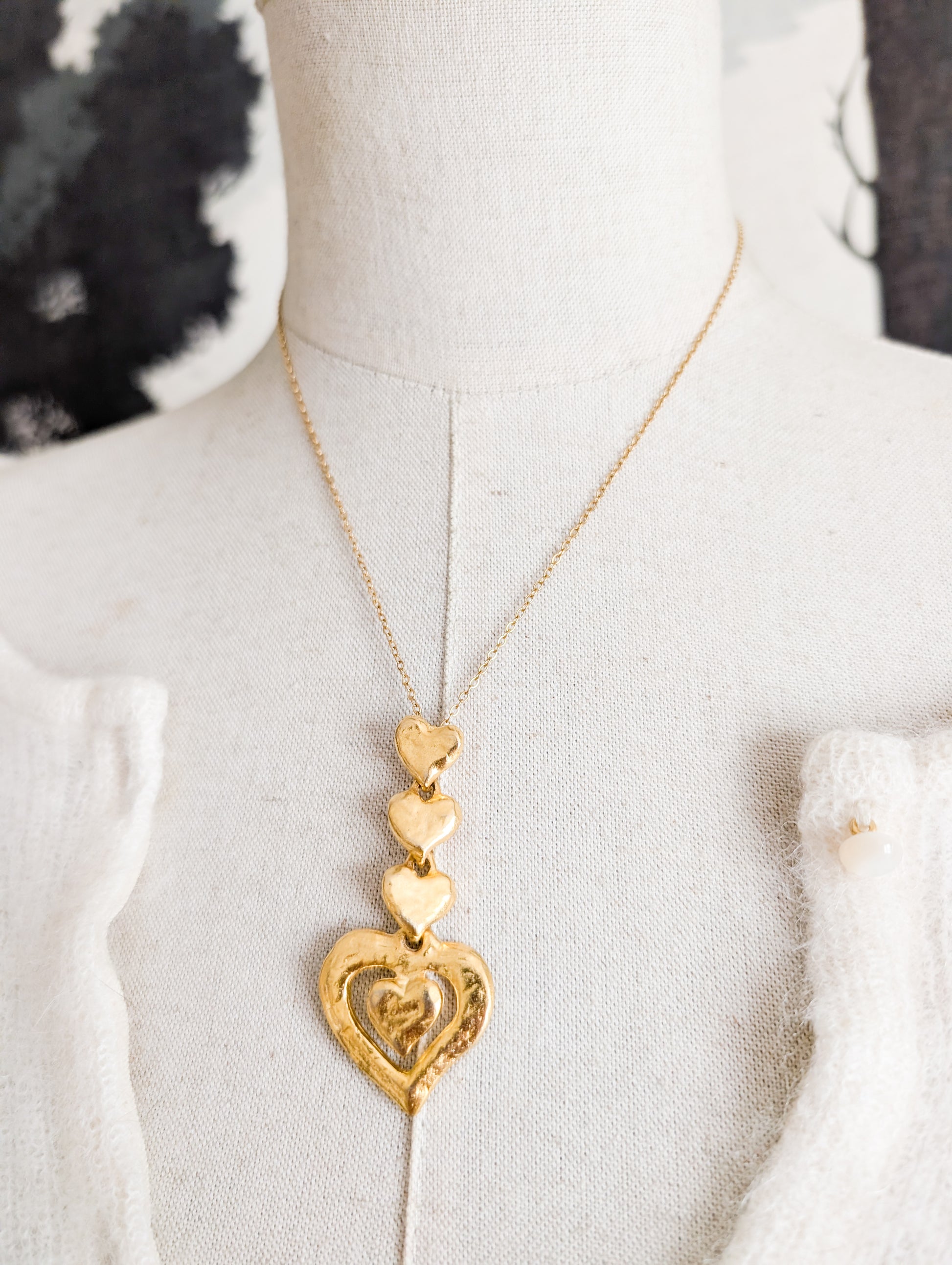 Le bijou est en métal doré avec une belle texture martelée. Il présente une succession de quatre cœurs délicatement travaillés.