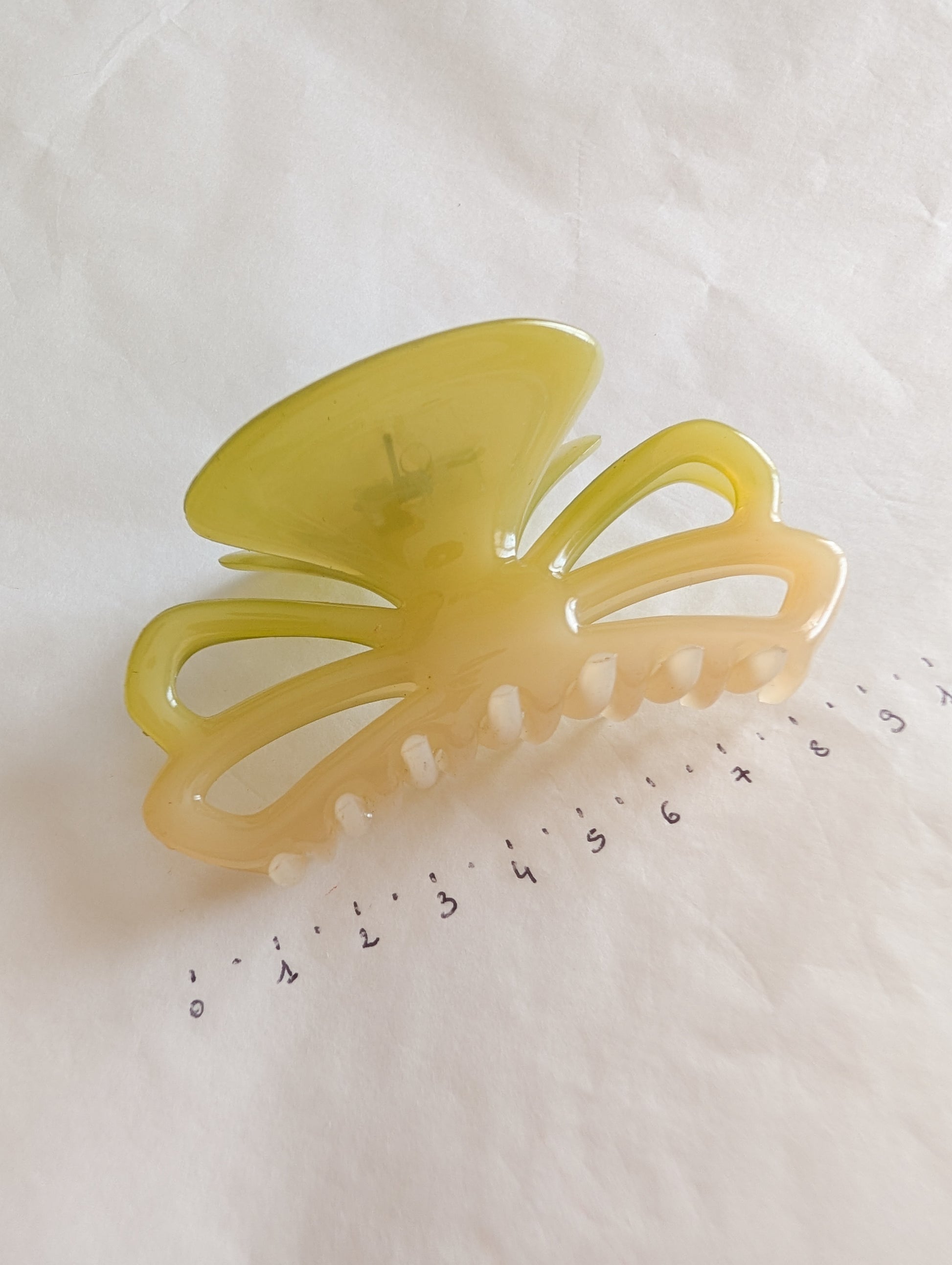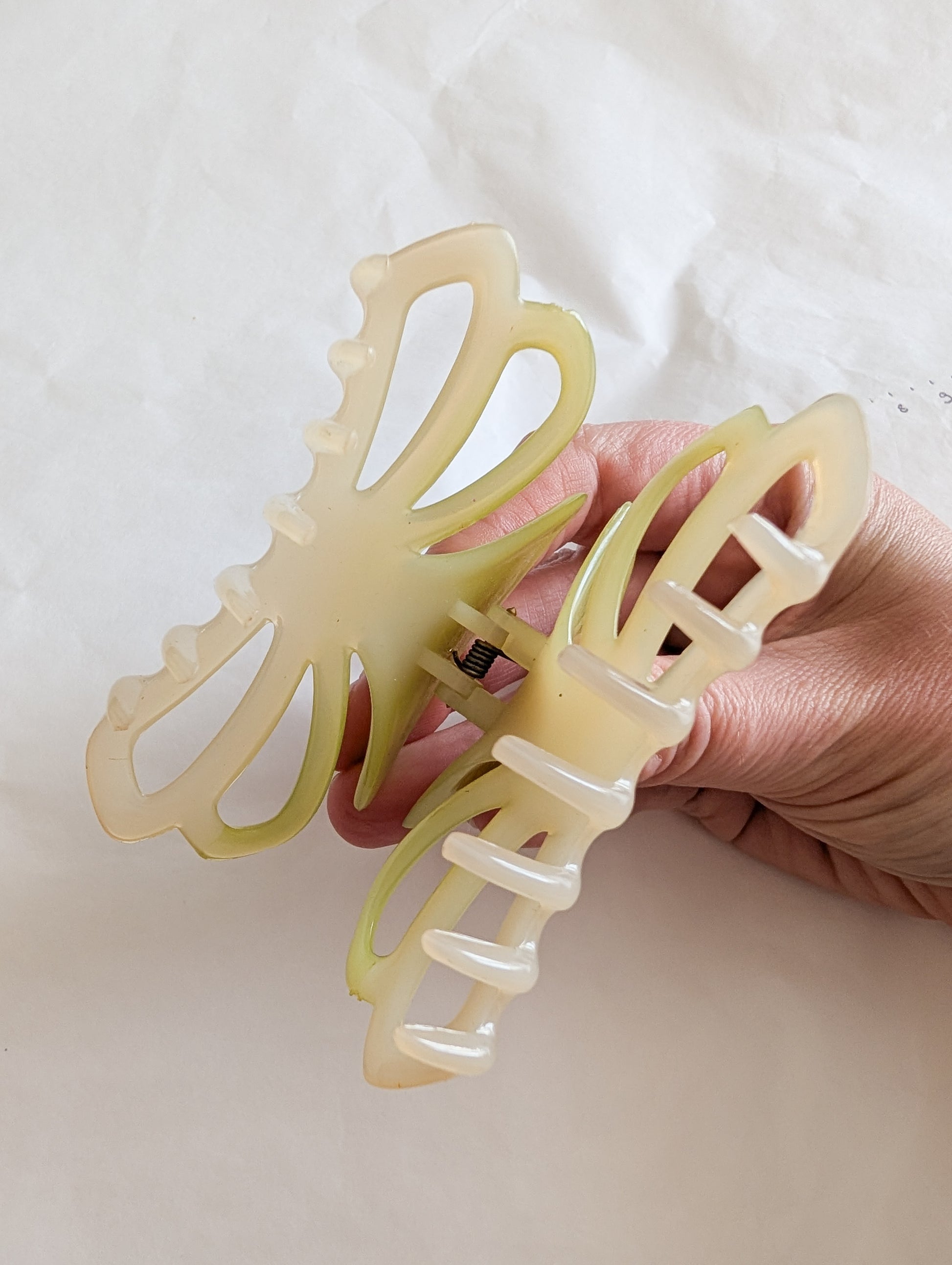 La pièce provient du stock d'un atelier de fabrication de barrettes et bijoux de cheveux situé dans le Jura. Le Jura est le berceau de l'industrie du plastique français. On y fabrique des pièces de très grande qualité.