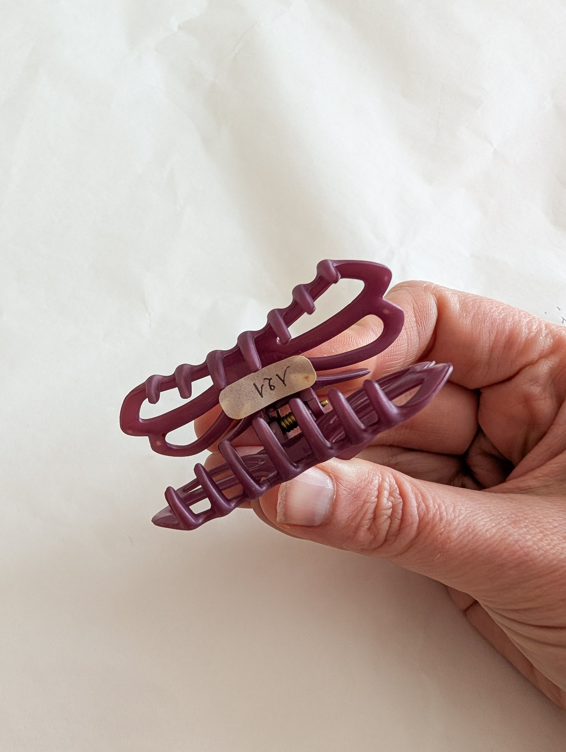 La pièce provient du stock d'un atelier de fabrication de barrettes et bijoux de cheveux situé dans le Jura. Le Jura est le berceau de l'industrie du plastique français. On y fabrique des pièces de très grande qualité.