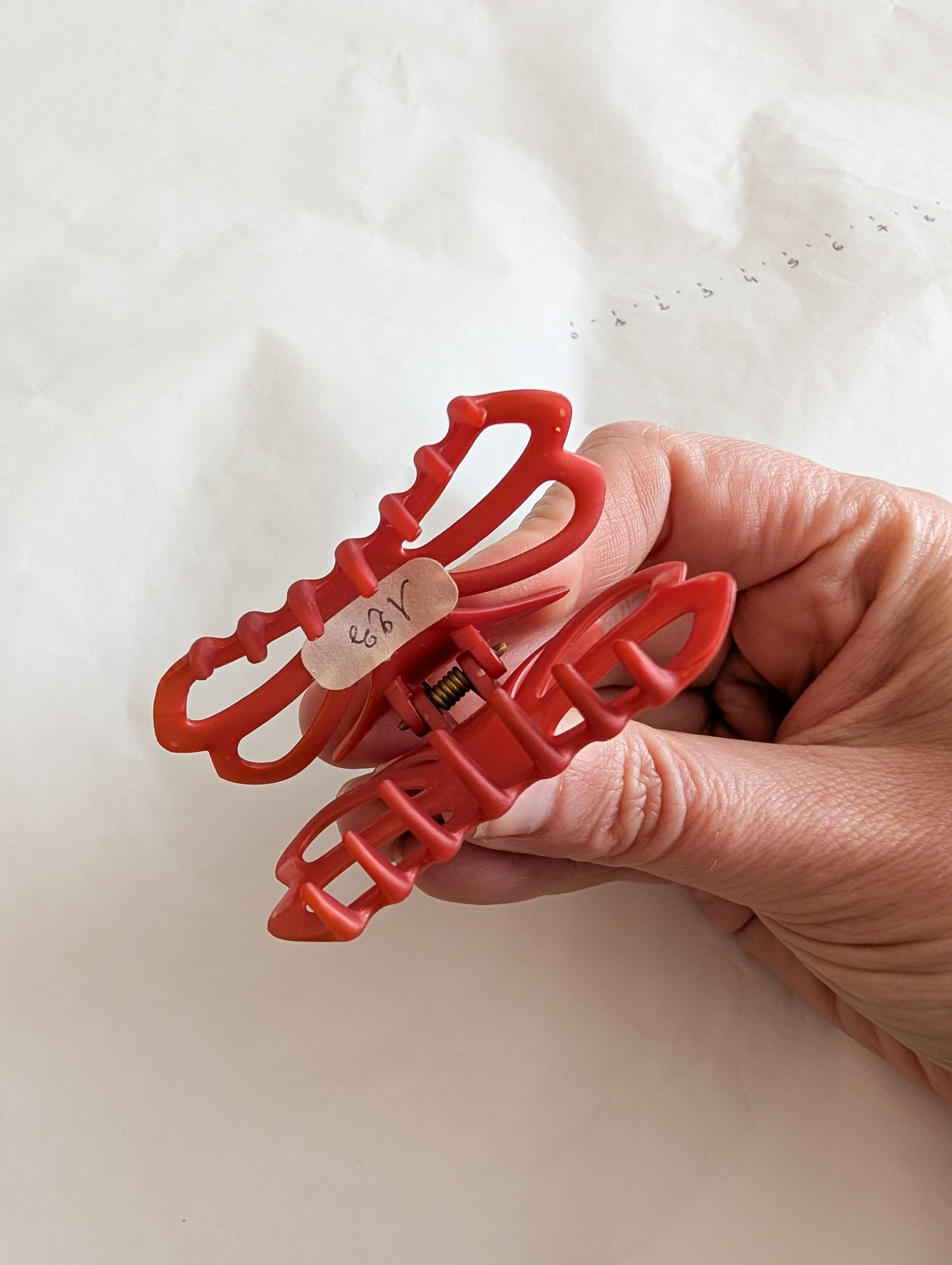 La pièce provient du stock d'un atelier de fabrication de barrettes et bijoux de cheveux situé dans le Jura. Le Jura est le berceau de l'industrie du plastique français. On y fabrique des pièces de très grande qualité.