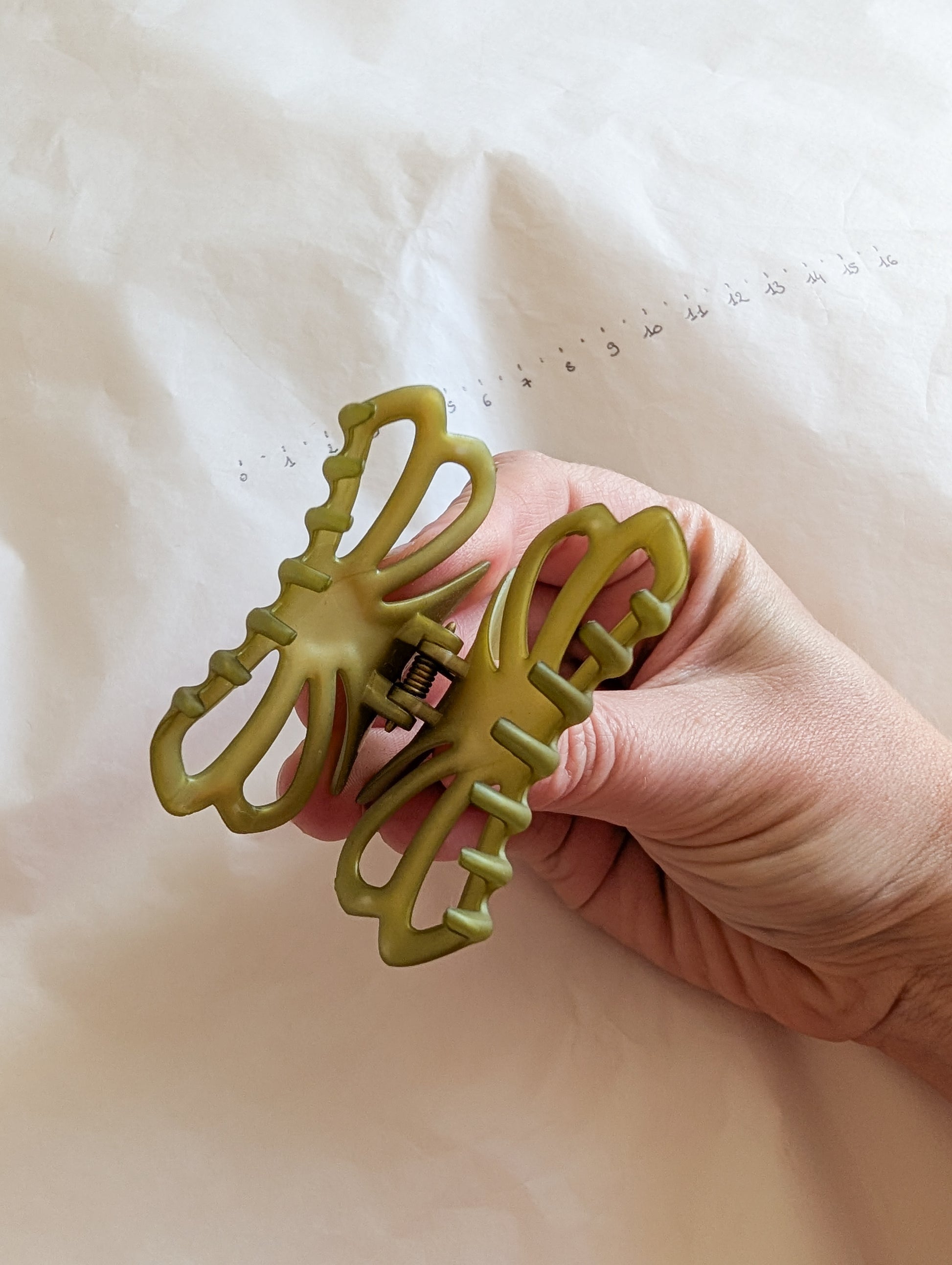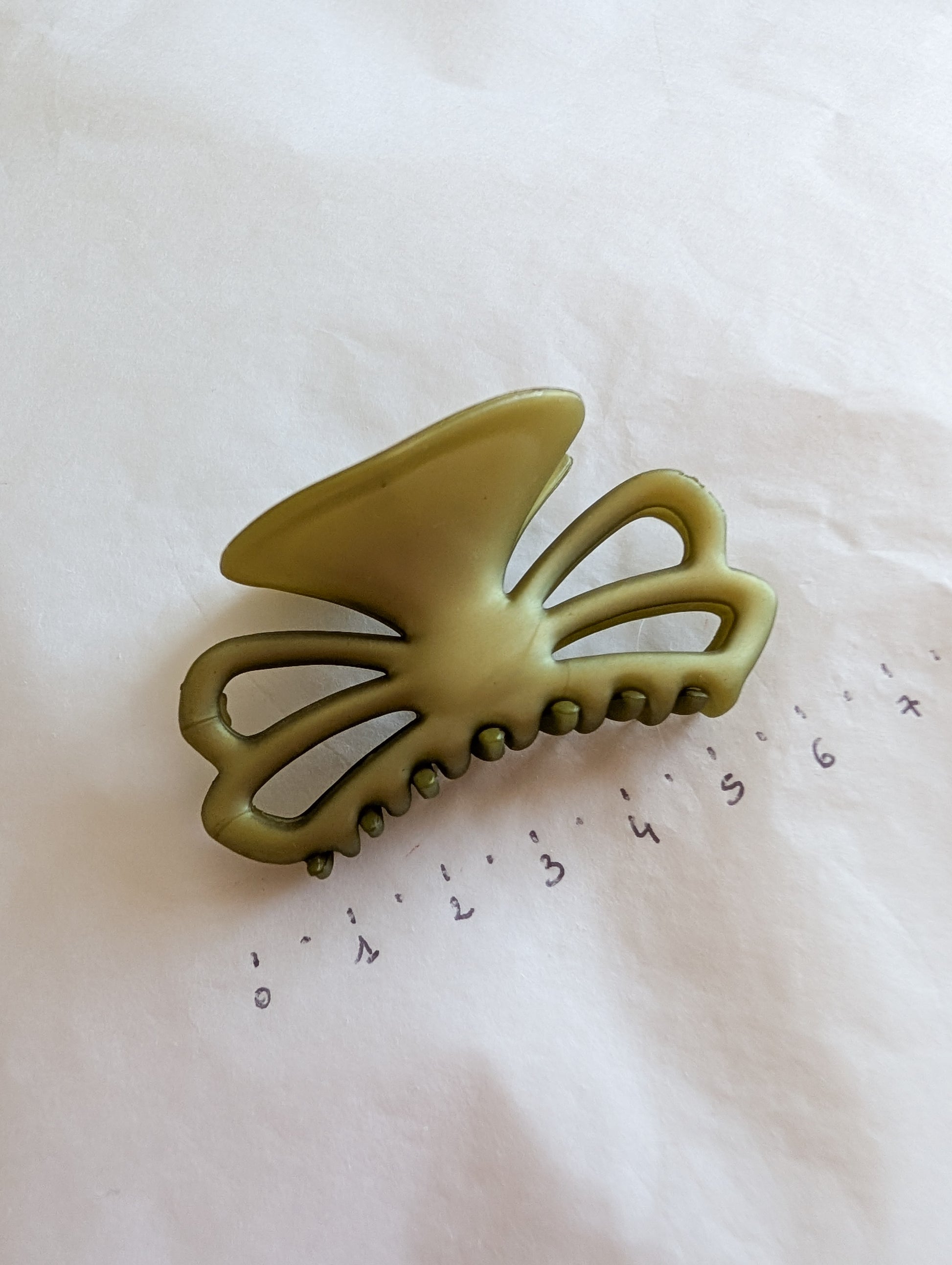 La pièce provient du stock d'un atelier de fabrication de barrettes et bijoux de cheveux situé dans le Jura. Le Jura est le berceau de l'industrie du plastique français. On y fabrique des pièces de très grande qualité.