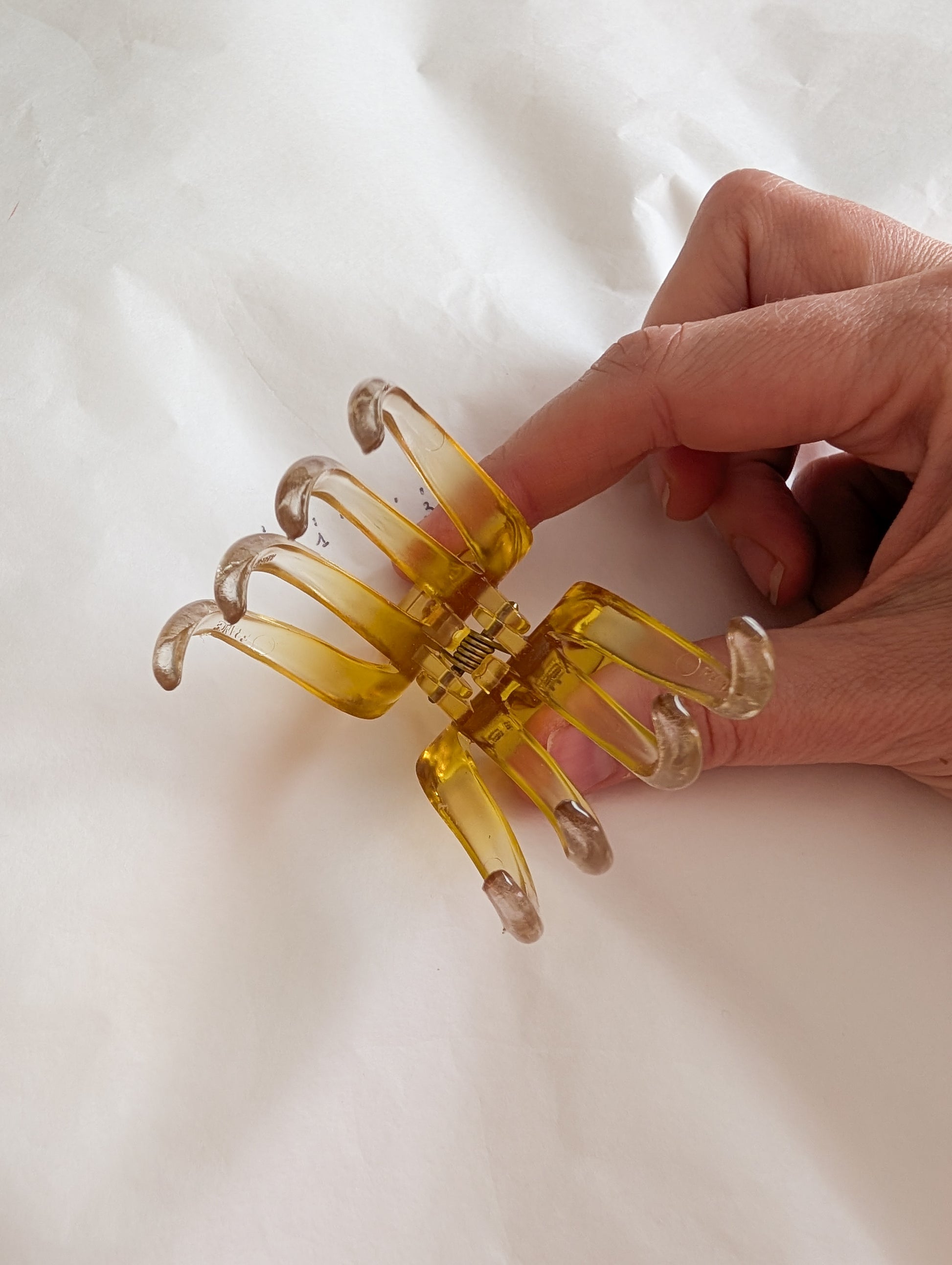 La pièce provient du stock d'un atelier de fabrication de barrettes et bijoux de cheveux situé dans le Jura. Le Jura est le berceau de l'industrie du plastique français. On y fabrique des pièces de très grande qualité.