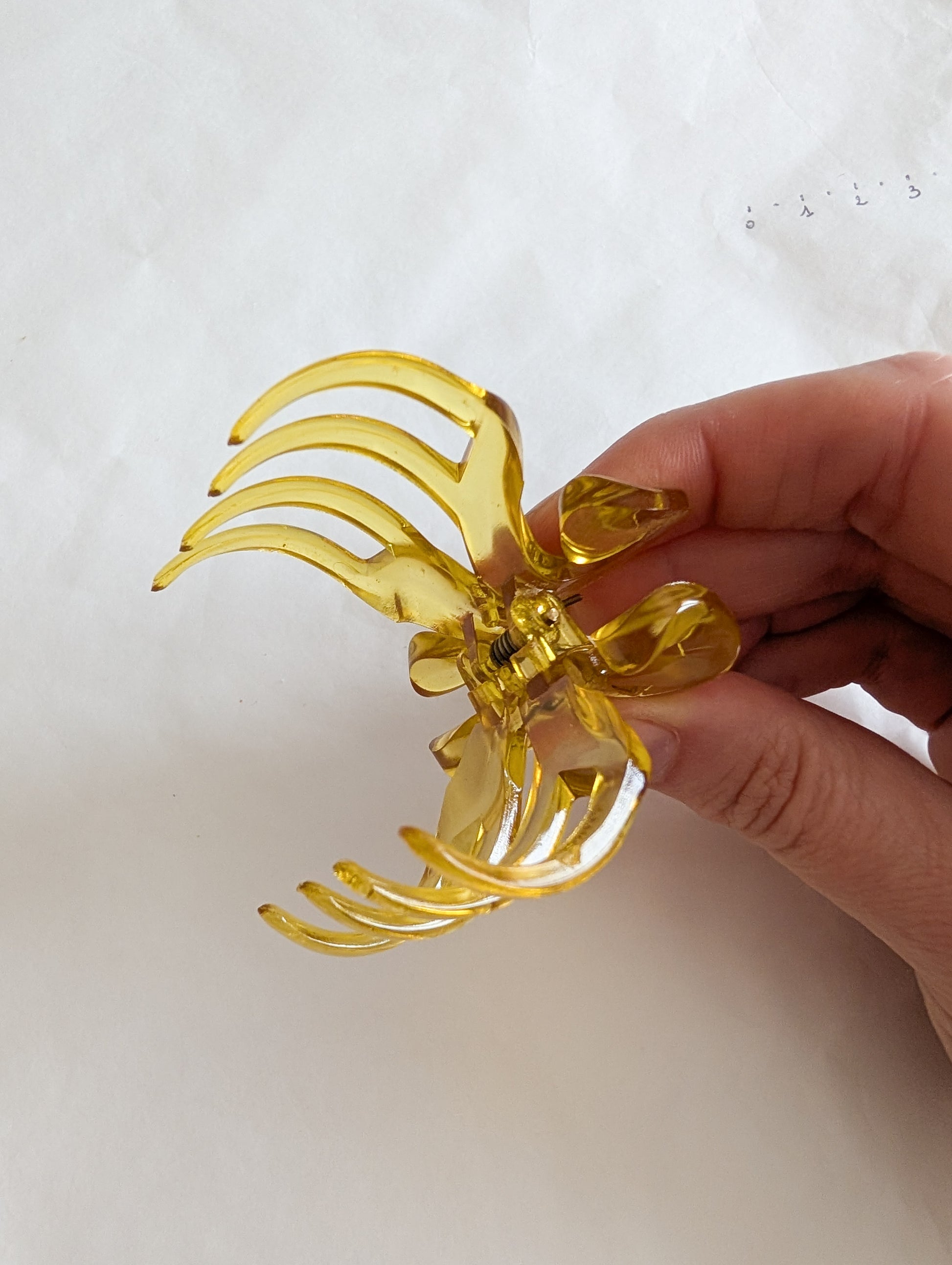 La pièce provient du stock d'un atelier de fabrication de barrettes et bijoux de cheveux situé dans le Jura. Le Jura est le berceau de l'industrie du plastique français. On y fabrique des pièces de très grande qualité.
