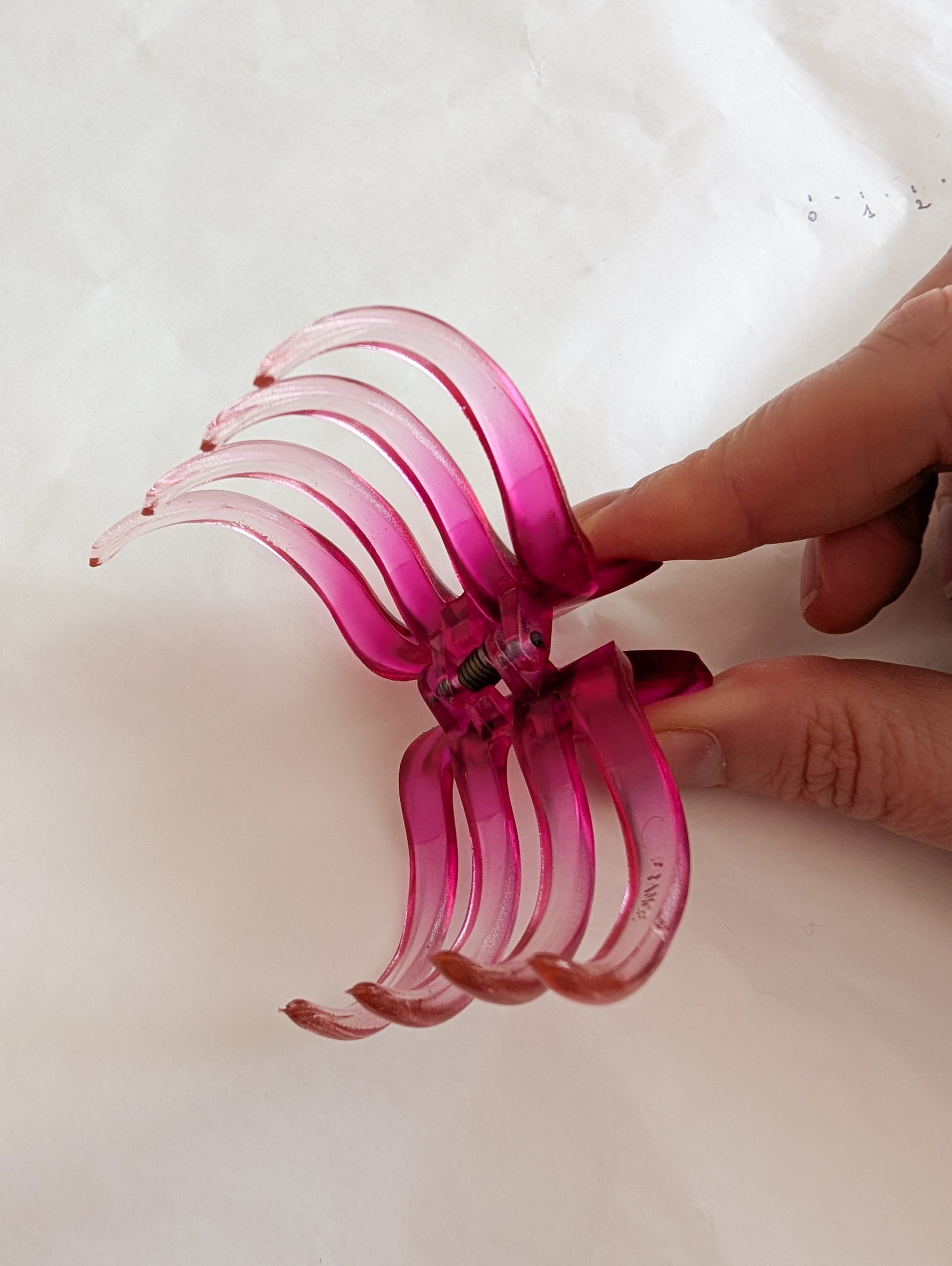 La pièce provient du stock d'un atelier de fabrication de barrettes et bijoux de cheveux situé dans le Jura. Le Jura est le berceau de l'industrie du plastique français. On y fabrique des pièces de très grande qualité.
