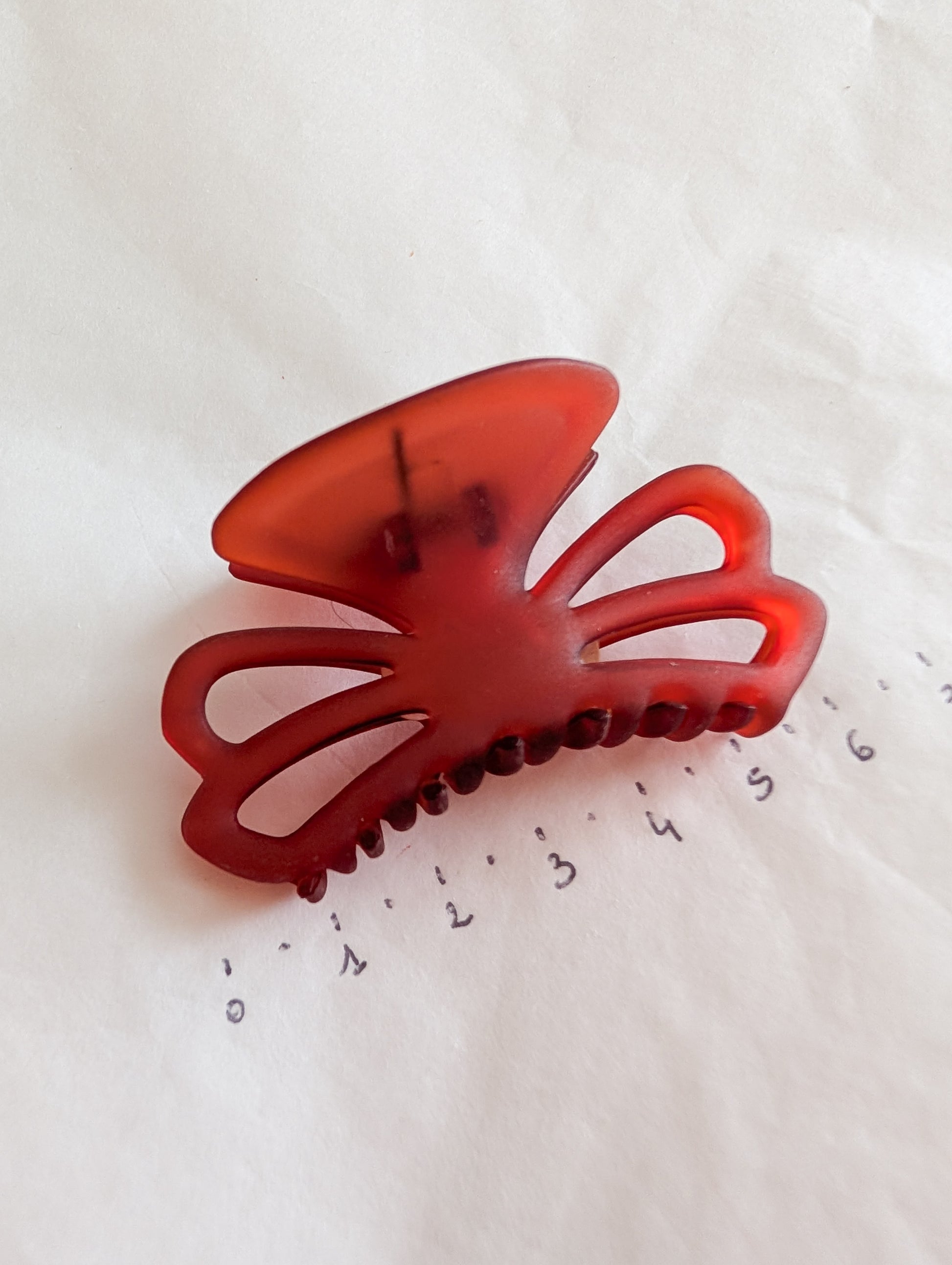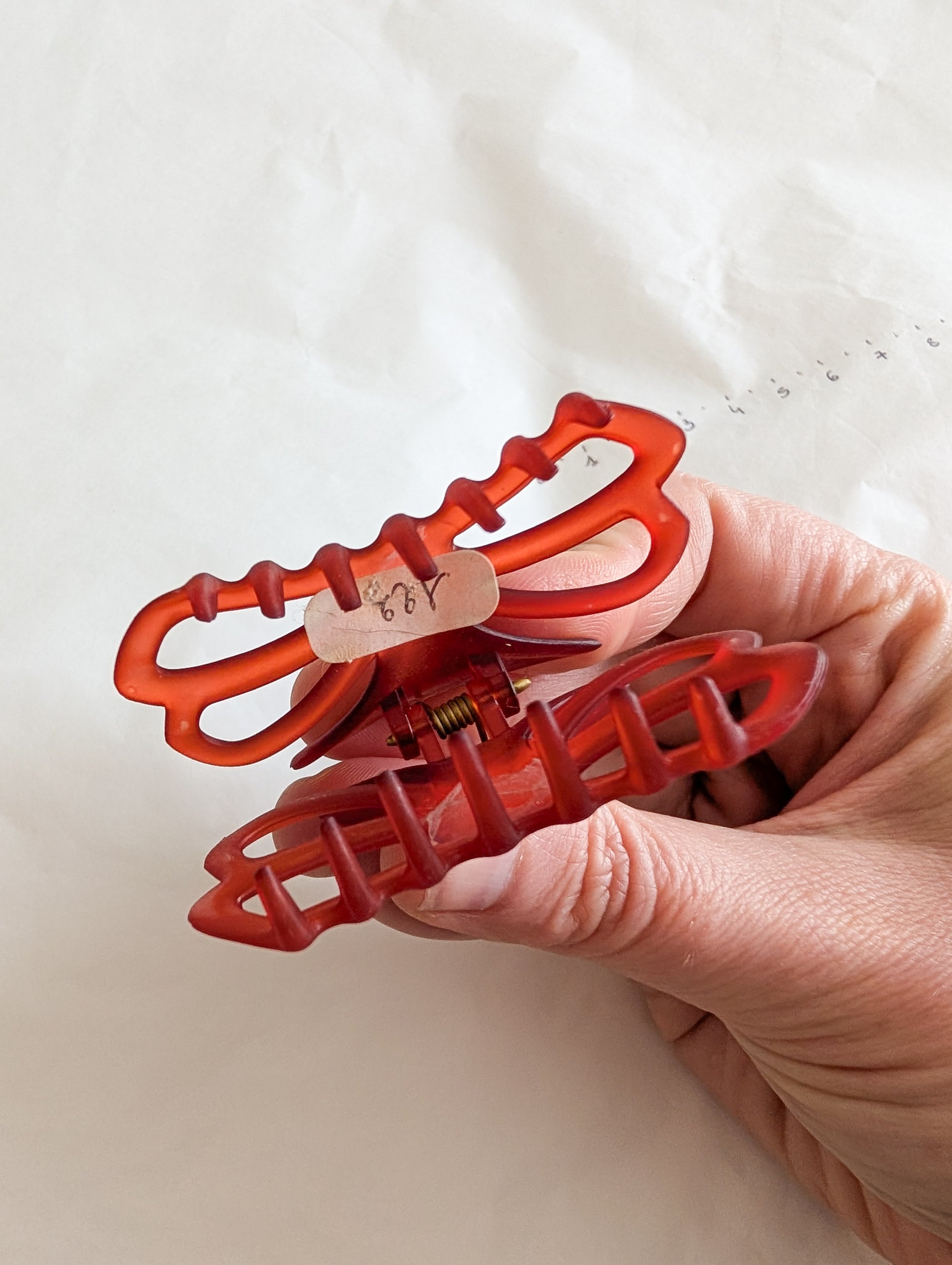 La pièce provient du stock d'un atelier de fabrication de barrettes et bijoux de cheveux situé dans le Jura. Le Jura est le berceau de l'industrie du plastique français. On y fabrique des pièces de très grande qualité.