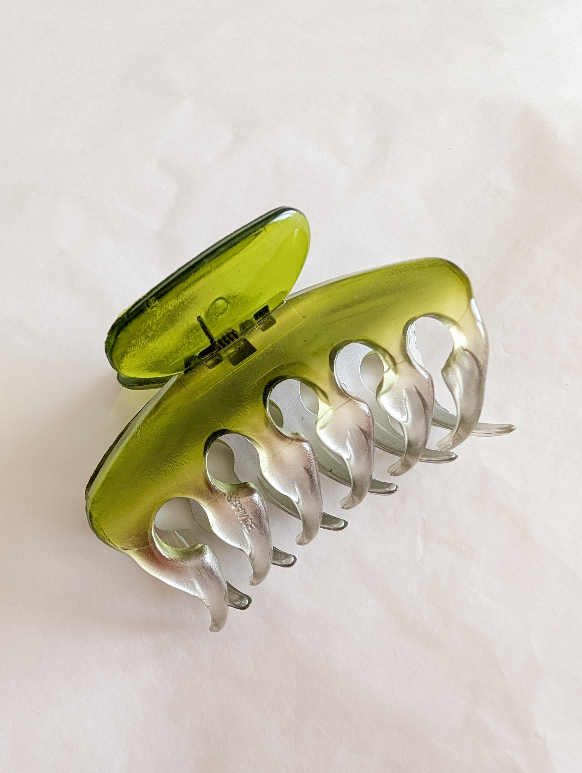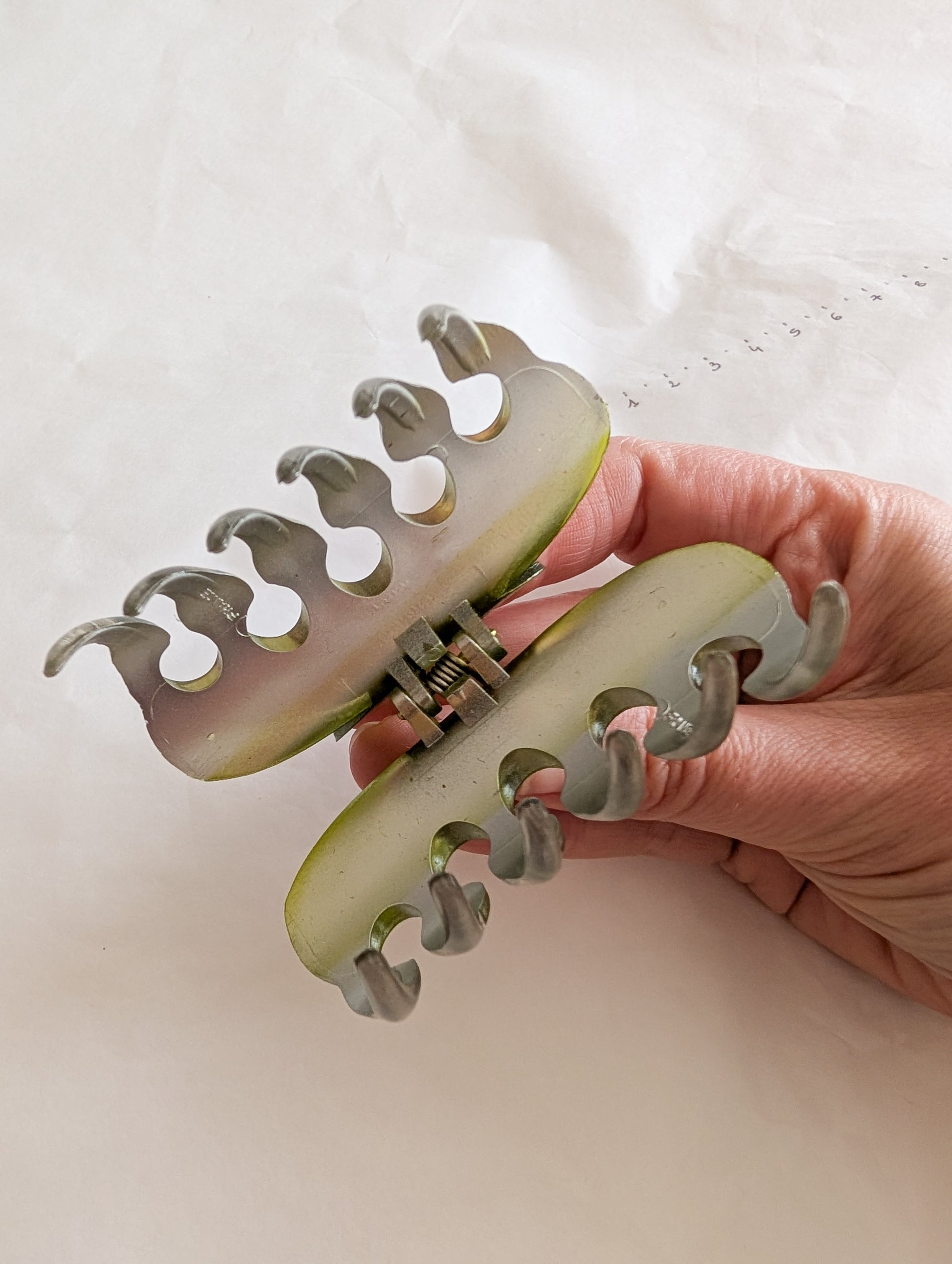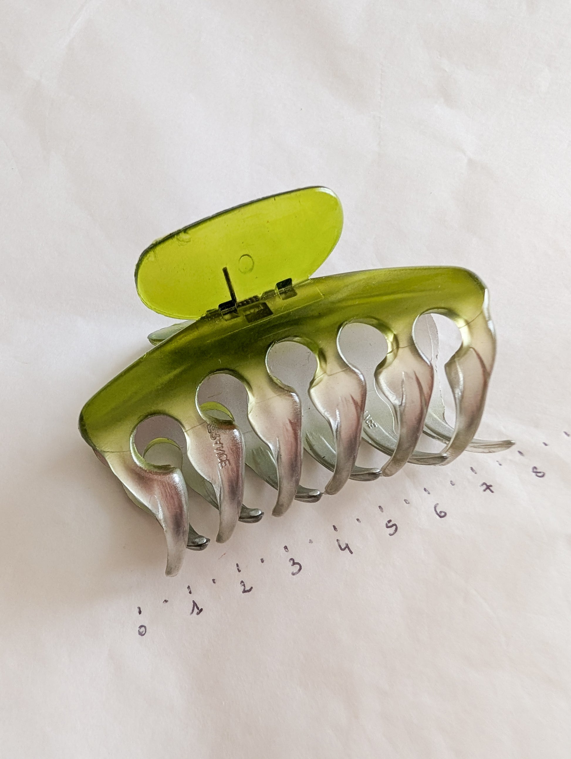 La pièce provient du stock d'un atelier de fabrication de barrettes et bijoux de cheveux situé dans le Jura. Le Jura est le berceau de l'industrie du plastique français. On y fabrique des pièces de très grande qualité.