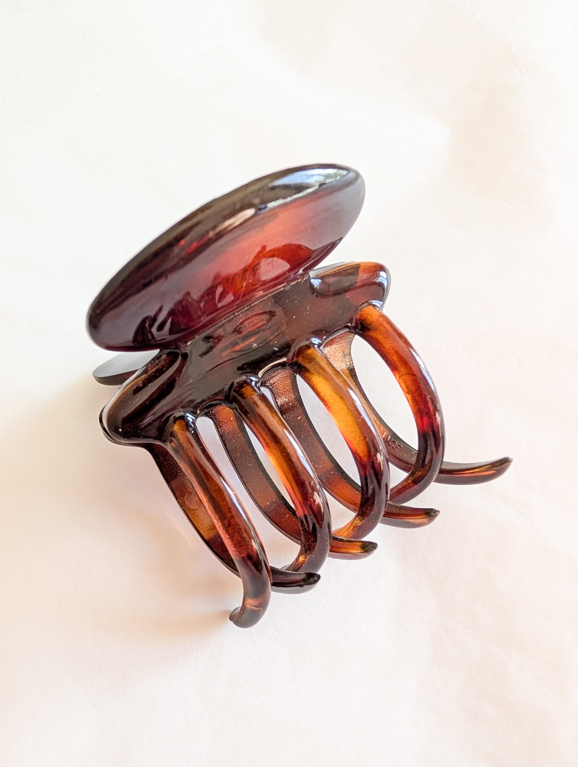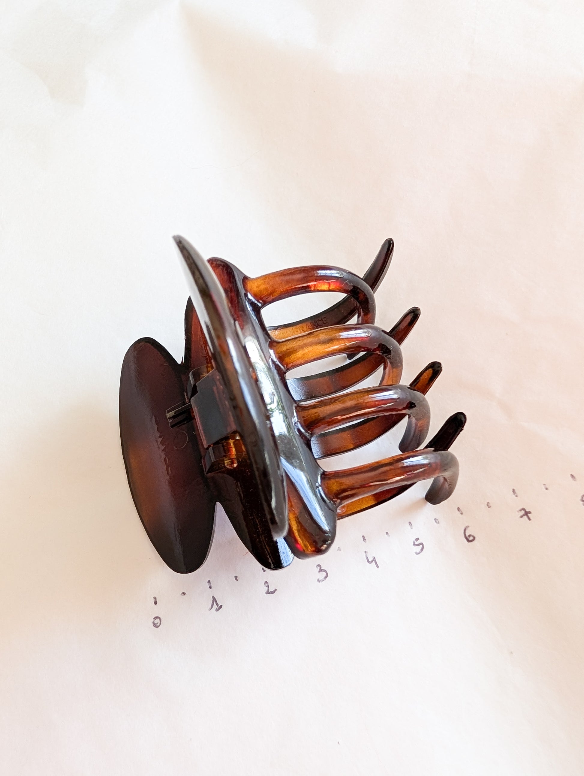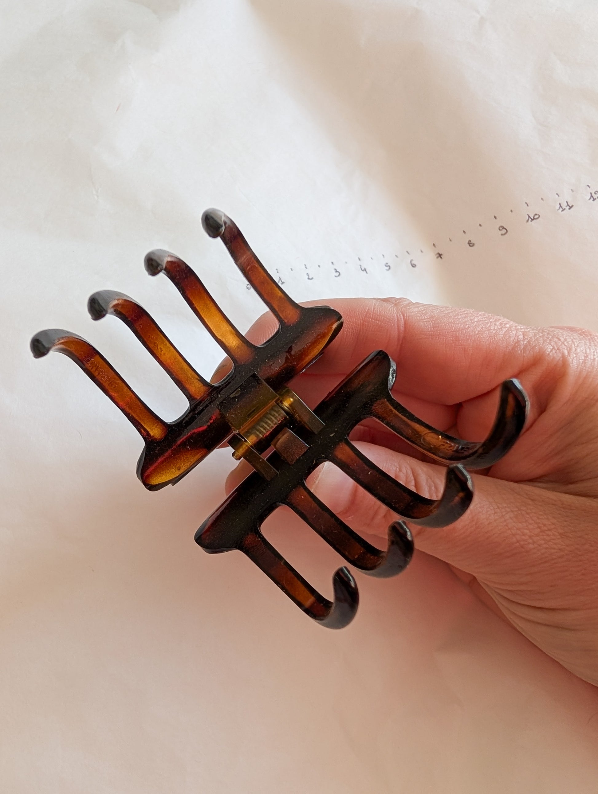La pièce provient du stock d'un atelier de fabrication de barrettes et bijoux de cheveux situé dans le Jura. Le Jura est le berceau de l'industrie du plastique français. On y fabrique des pièces de très grande qualité.